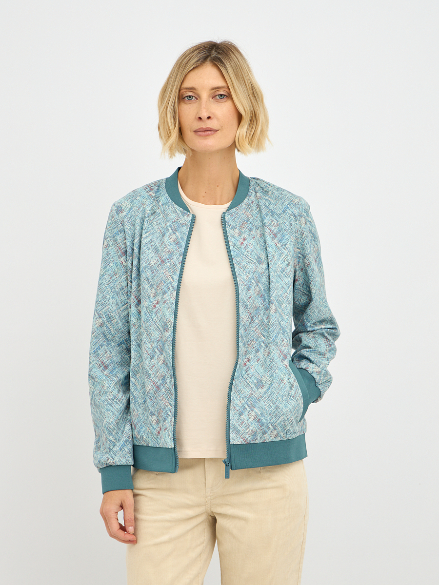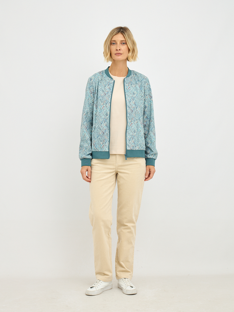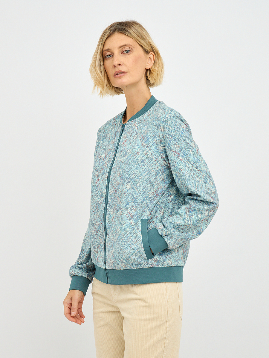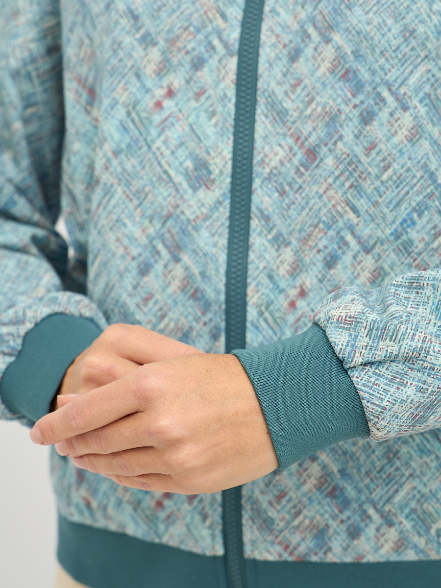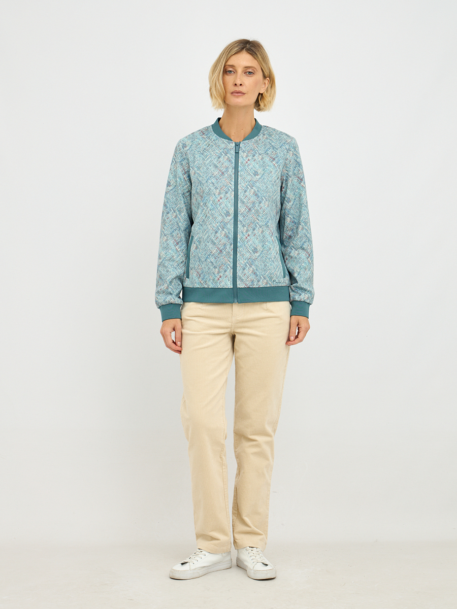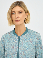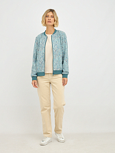Бомбер выполнен в нежном бирюзовом цвете с изысканным узором, придающим ему неповторимый шарм. Мягкая и приятная на ощупь ткань обеспечивает максимальный комфорт в течение всего дня. Классический силуэт бомбера с круглым вырезом горловины и застежкой-молнией делает его универсальным и подходящим для различных стилей.