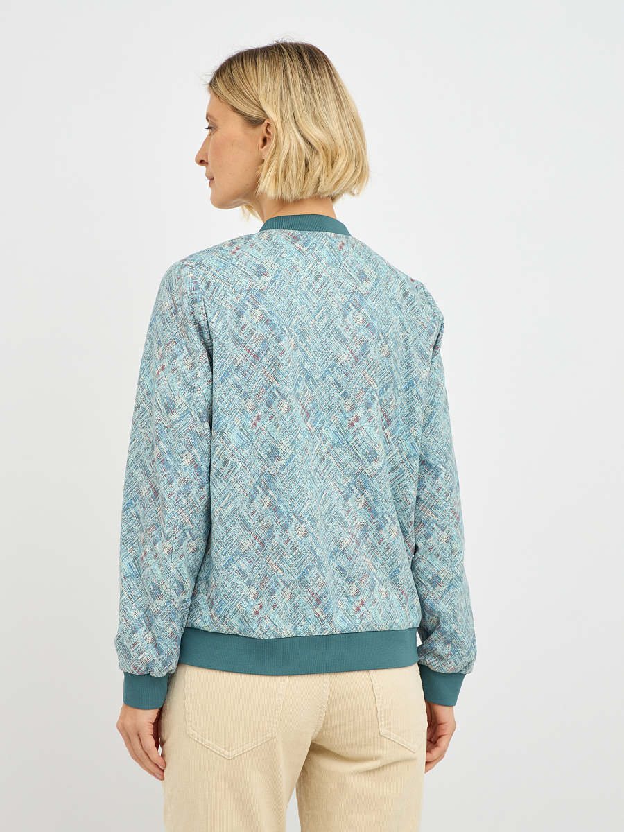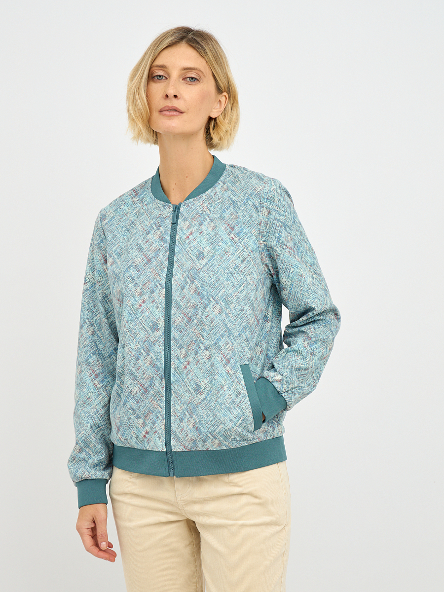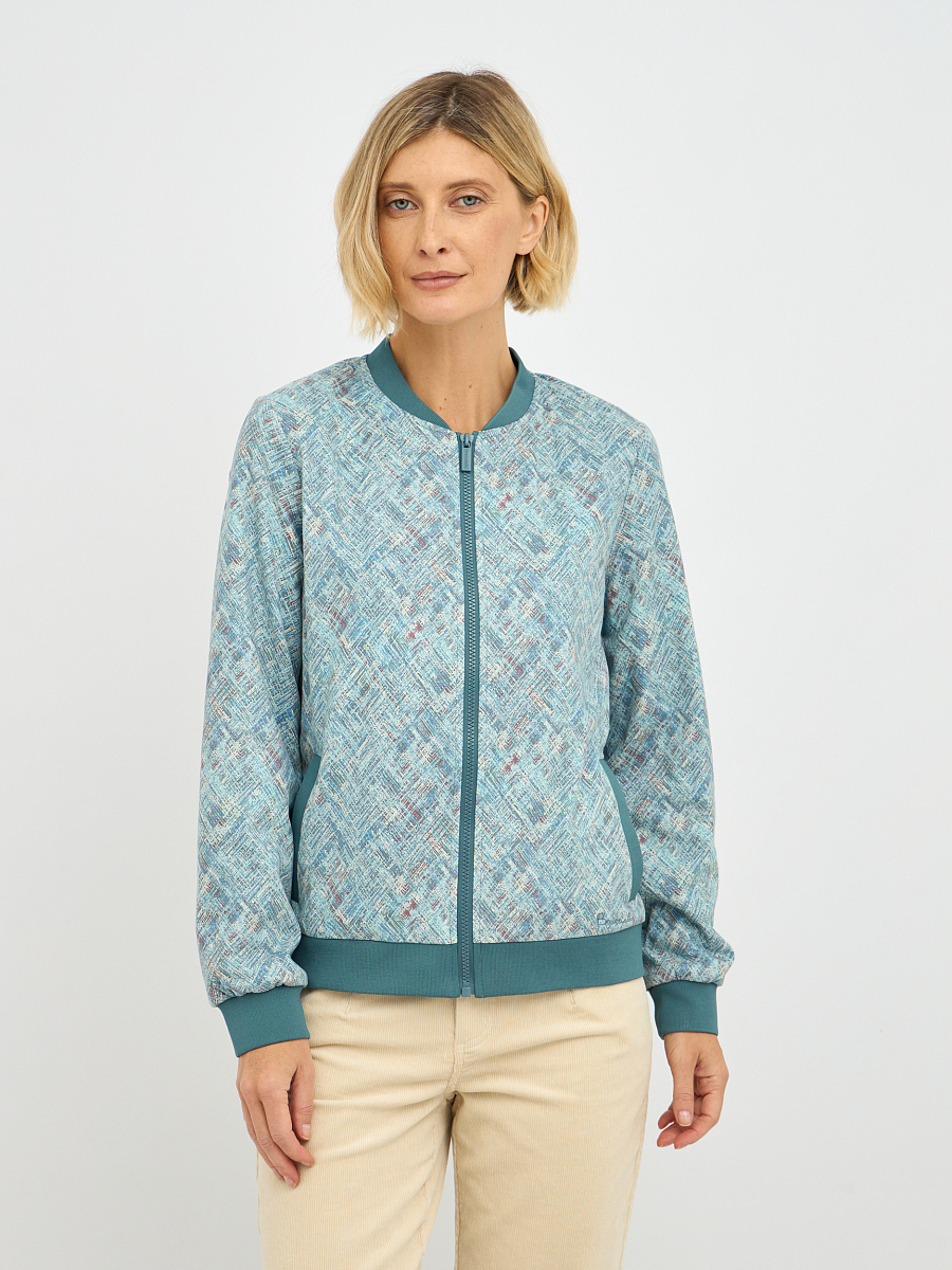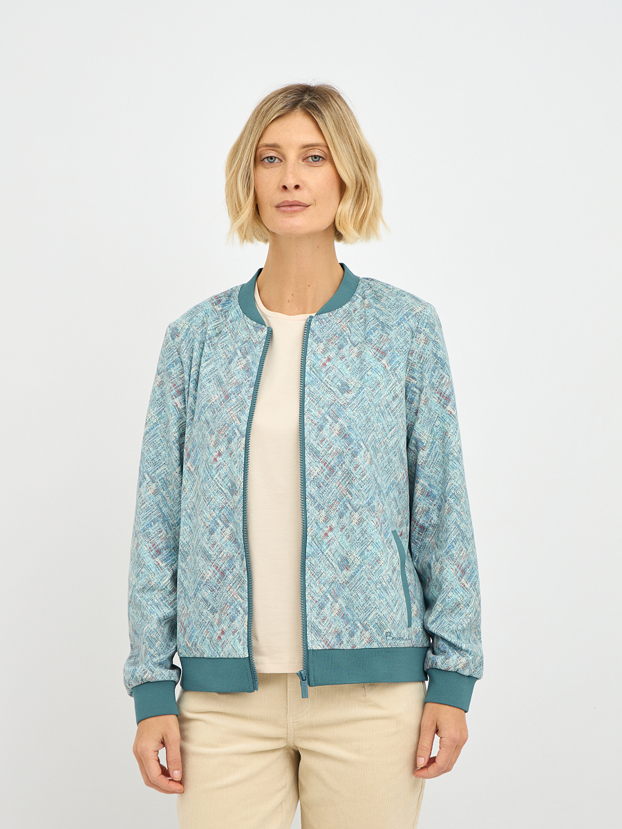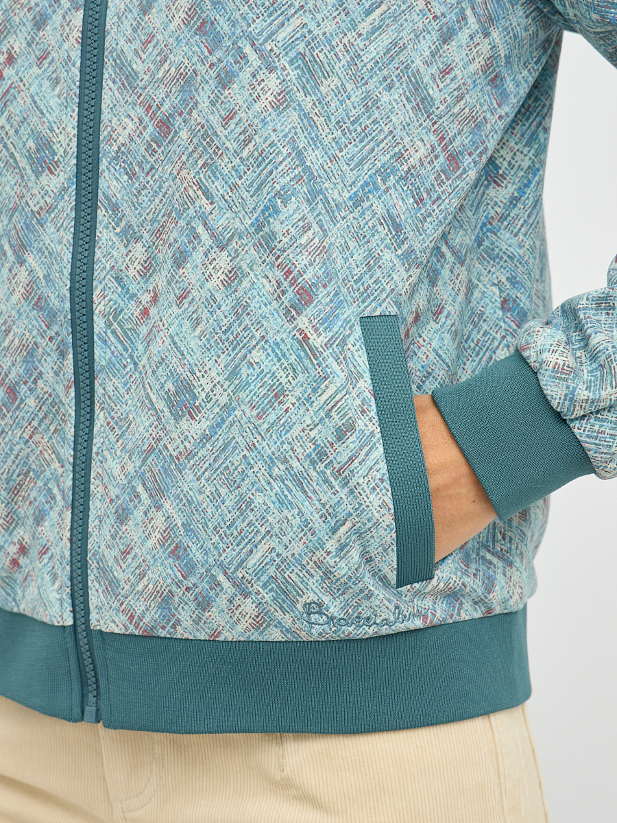 Бомбер выполнен в нежном бирюзовом цвете с изысканным узором, придающим ему неповторимый шарм. Мягкая и приятная на ощупь ткань обеспечивает максимальный комфорт в течение всего дня. Классический силуэт бомбера с круглым вырезом горловины и застежкой-молнией делает его универсальным и подходящим для различных стилей.