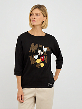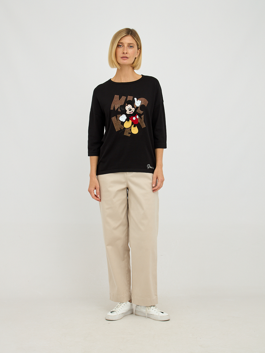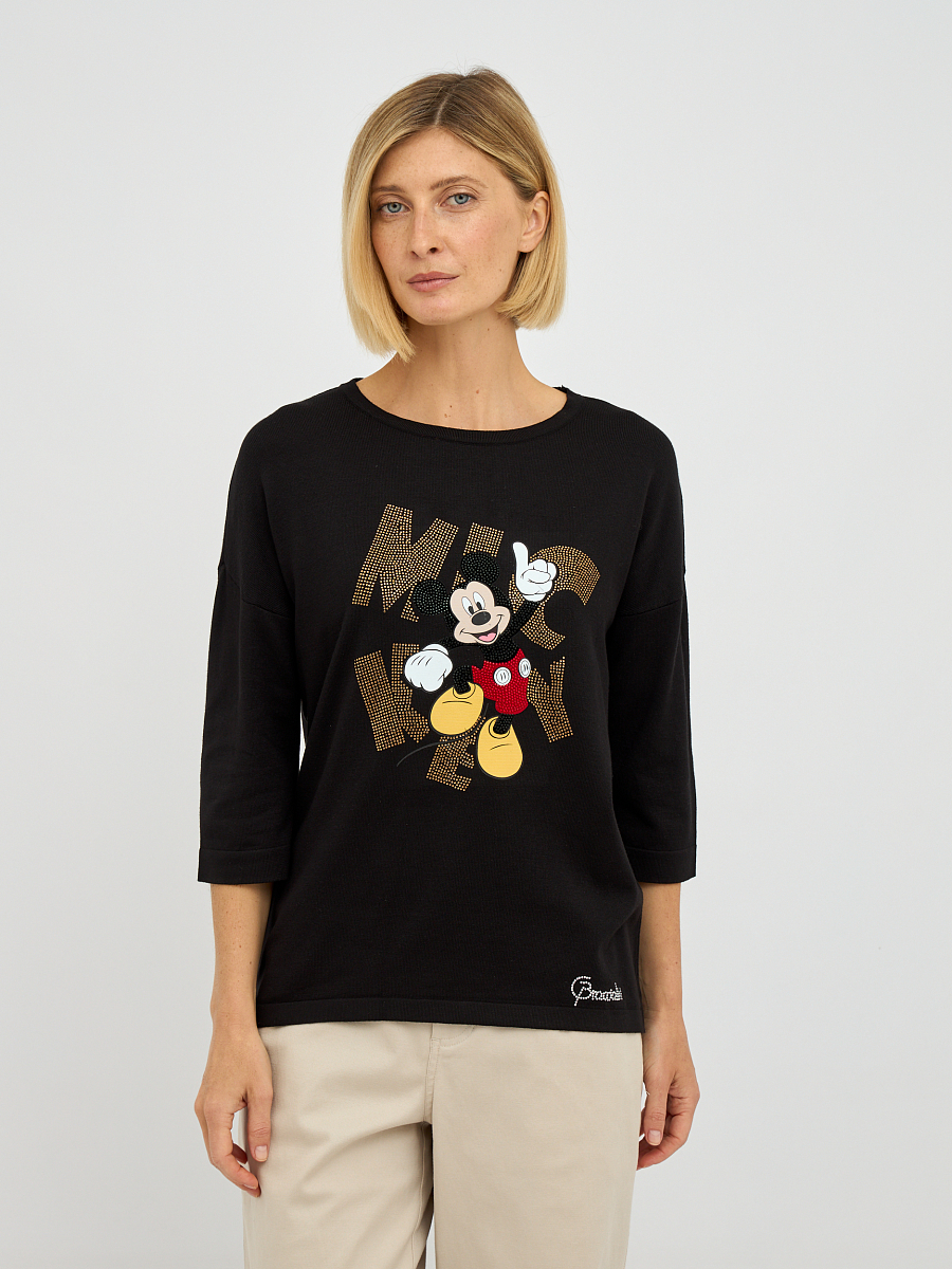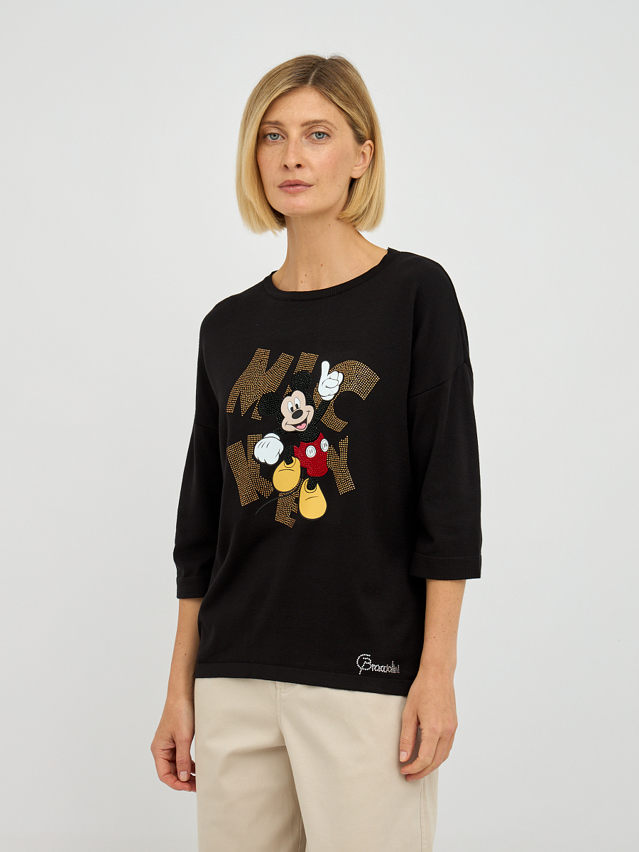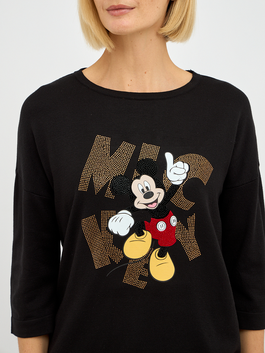 Этот джемпер украшен оригинальным рисунком из страз в виде знаменитого Микки Мауса, что придаёт ему игривый и современный вид.
