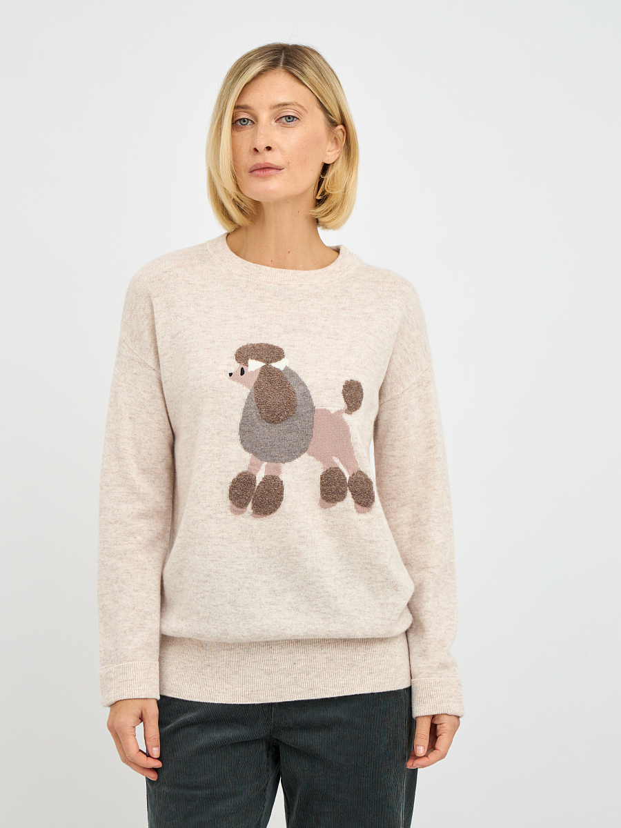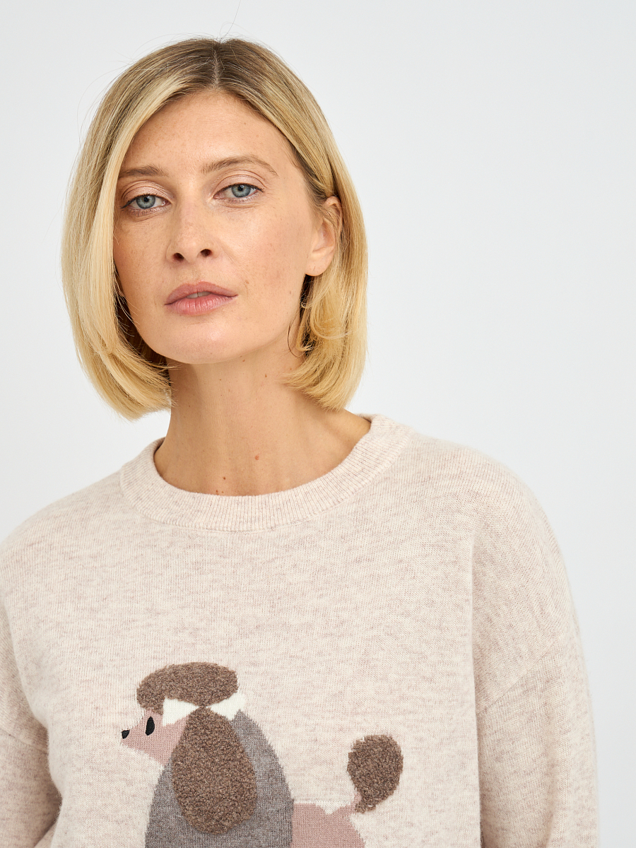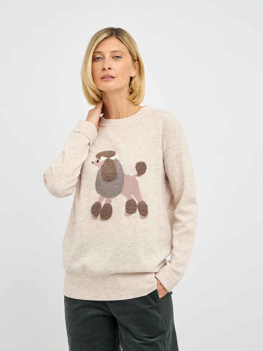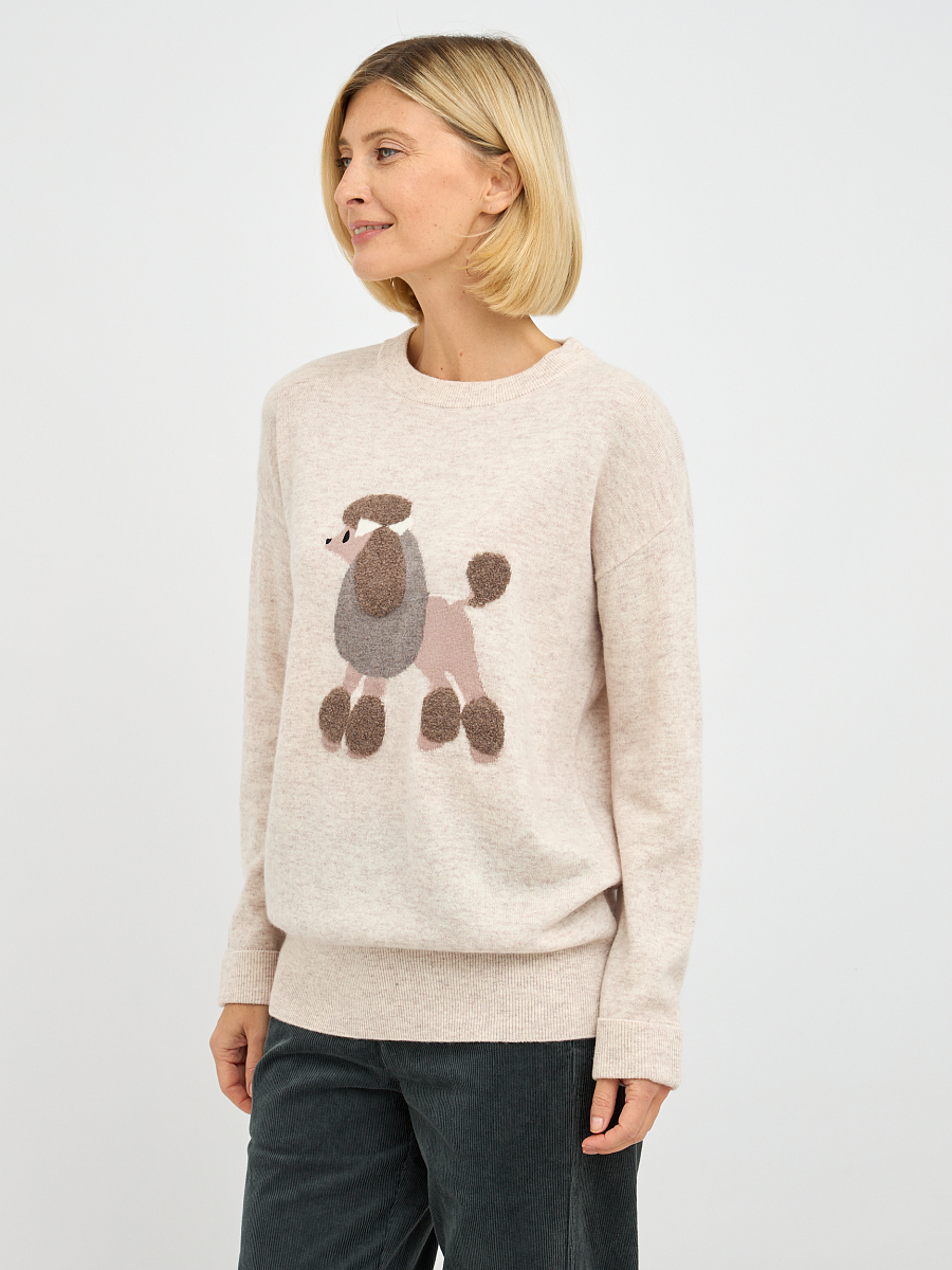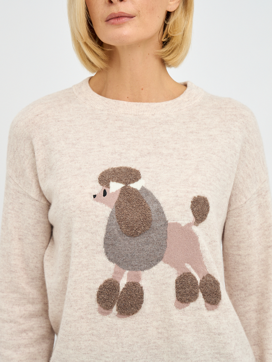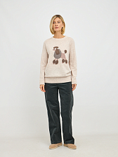 Этот бежевый женский джемпер – воплощение уюта и стиля. Мягкий и приятный на ощупь, он станет вашим любимым предметом гардероба в прохладную погоду. Особую изюминку ему придает объемный, пушистый принт милой собачки, который сразу привлекает внимание и дарит позитивные эмоции.