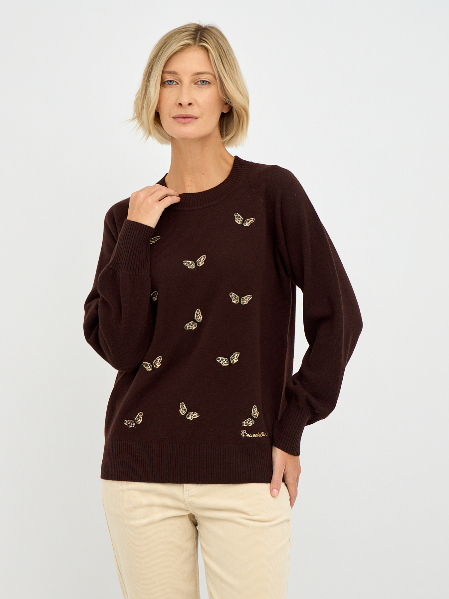 Джемпер выполнен в свободном крое, что обеспечивает максимальную свободу движений и комфорт в носке. Уникальные аппликации в виде бабочек, украшенные блестящими стразами, придают изделию изысканный и игривый вид, делая его настоящим акцентом вашего образа. Рукава-фонарики добавляют романтичности и женственности, создавая эффект легкости и воздушности.