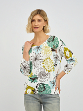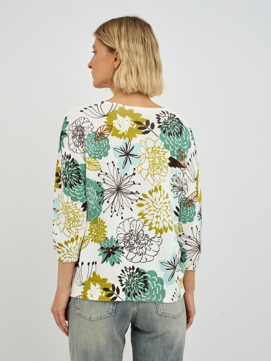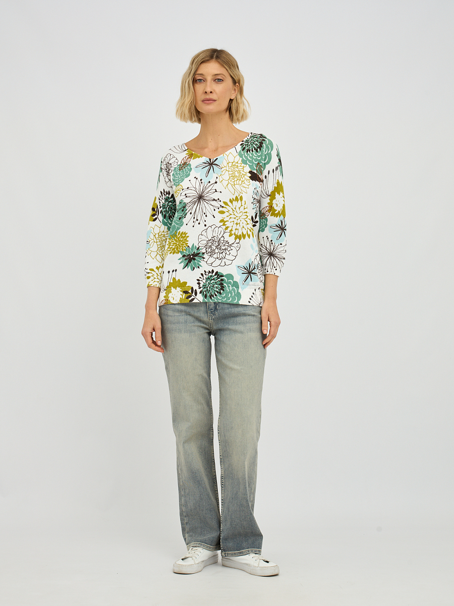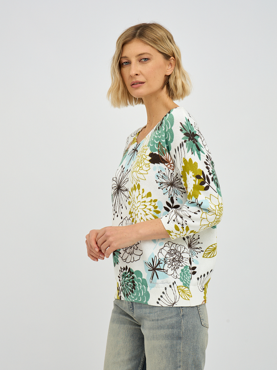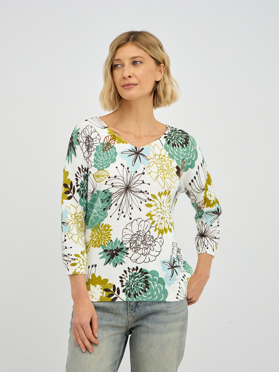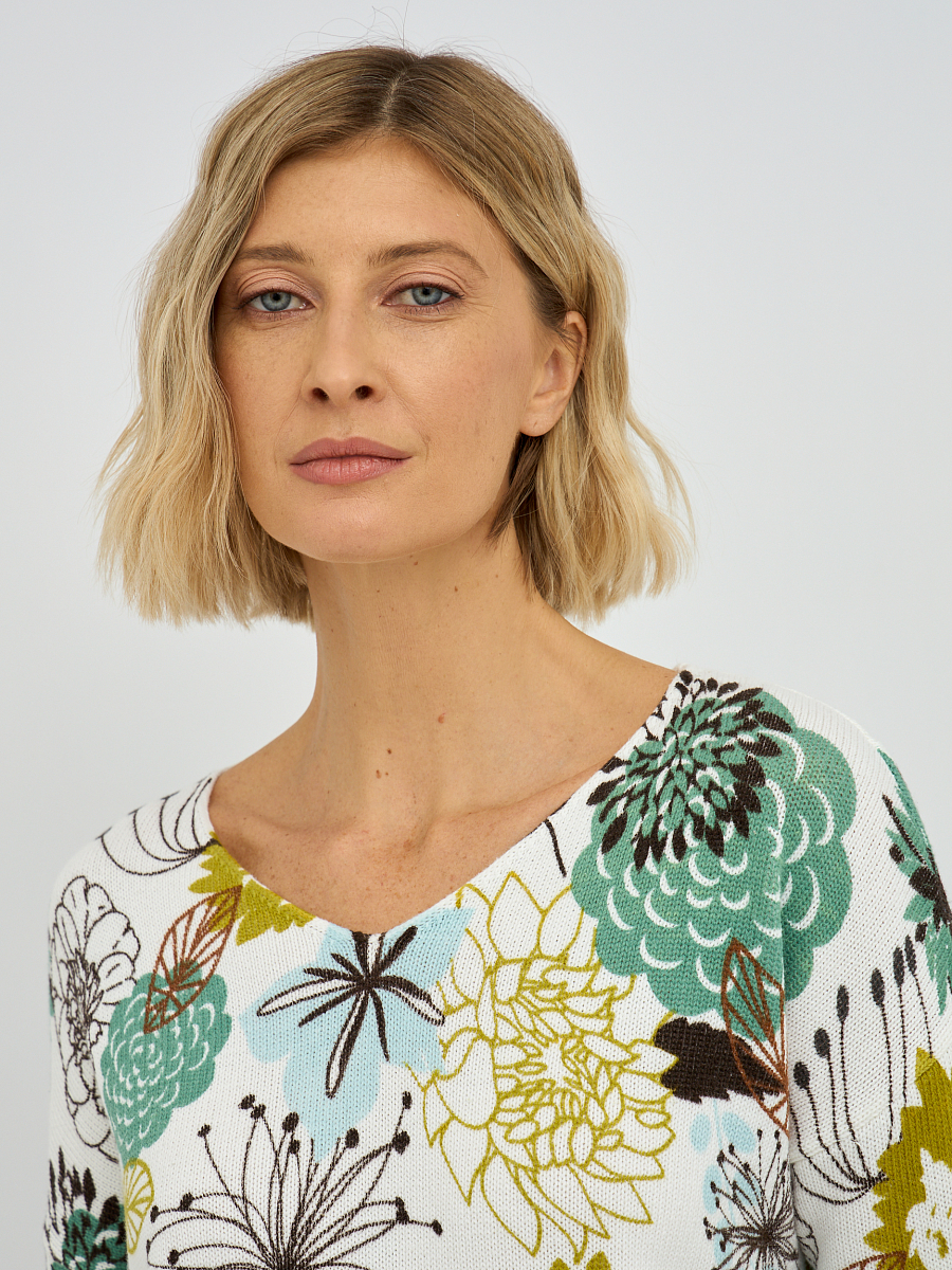 Этот элегантный женский джемпер с эффектным V-образным вырезом моментально привлечет внимание своим ярким и живописным растительным принтом, создавая ощущение свежести и природной красоты. Яркие и детализированные растительные мотивы, разбросанные по белоснежному фону, придают изделию уникальный характер и позволяют создавать стильные, запоминающиеся образы. V-образный вырез деликатно подчеркивает линию шеи, визуально вытягивая силуэт и делая его более утонченным.
