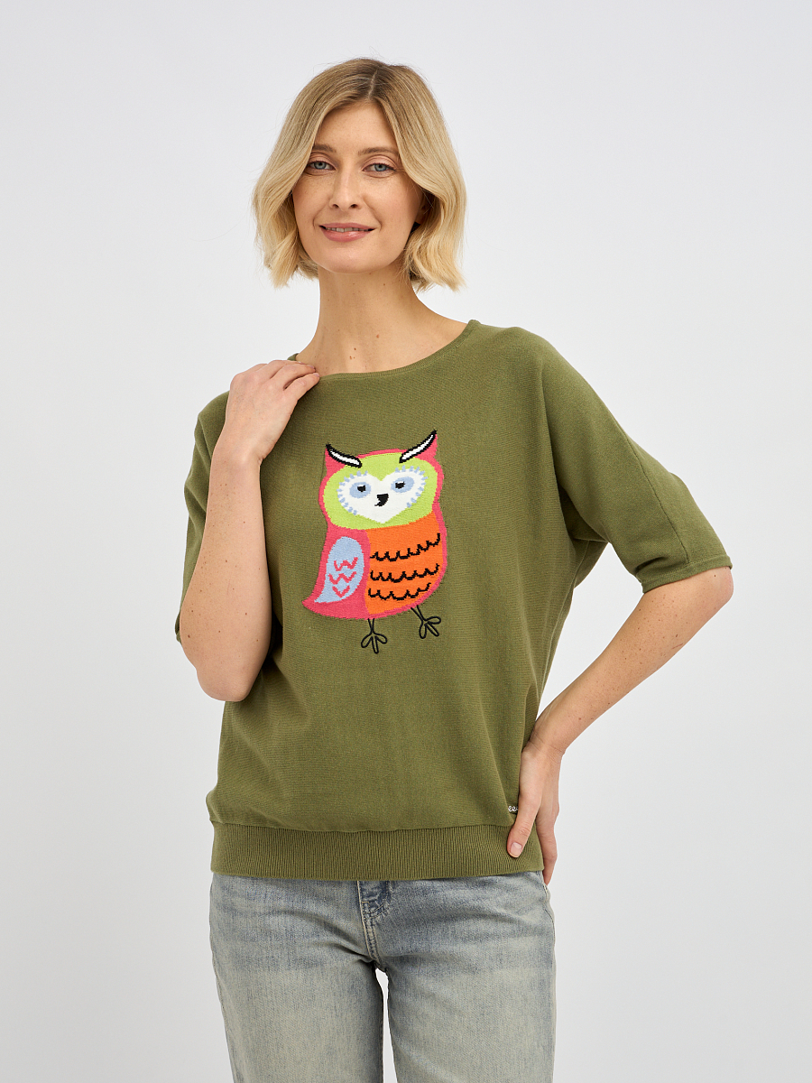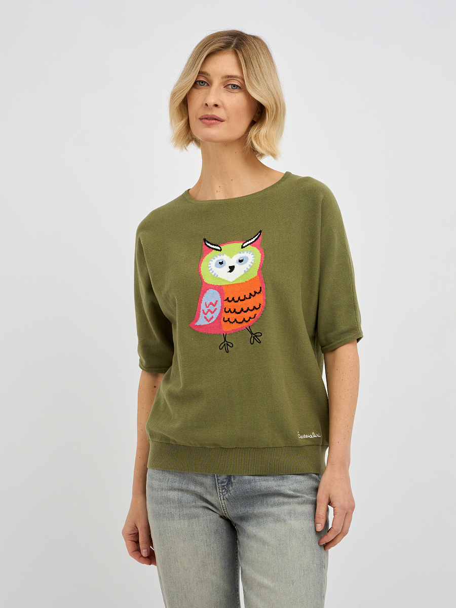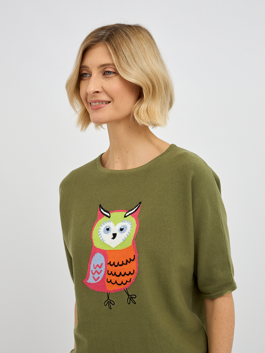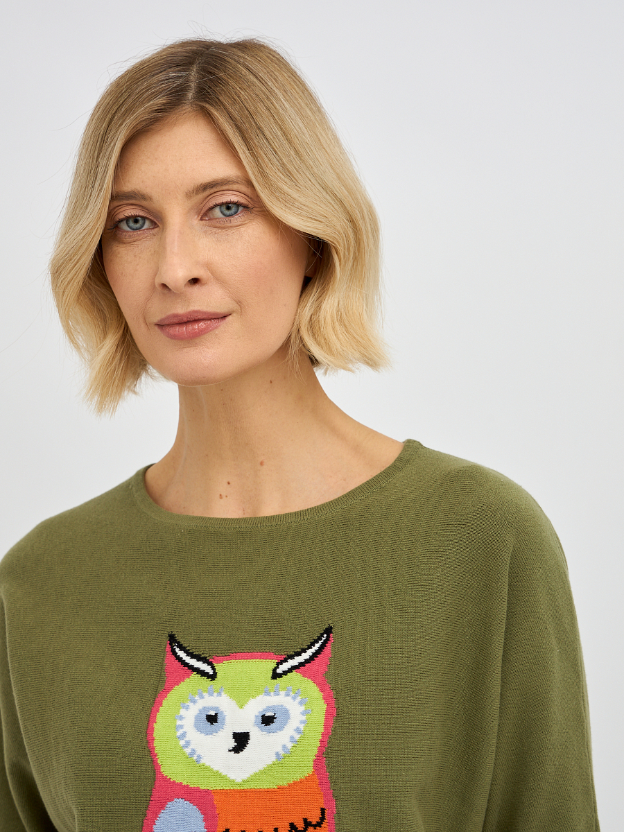 джемпер женский в зелёном цвете с вязаным узором в виде совы