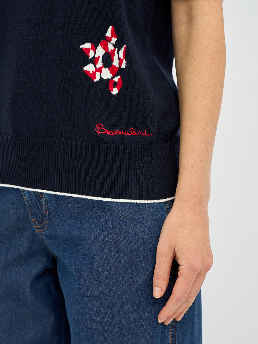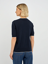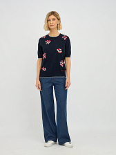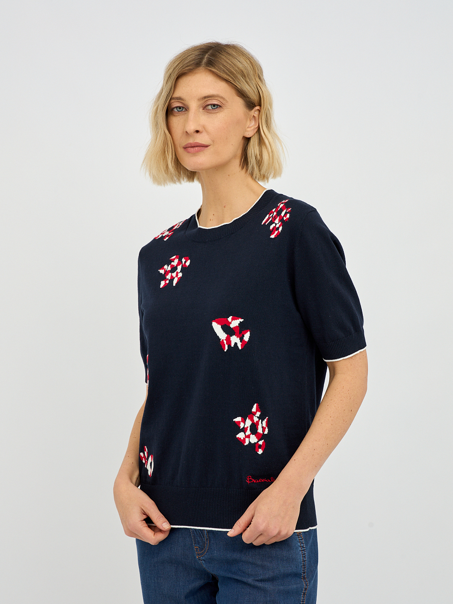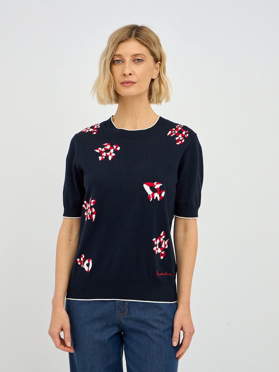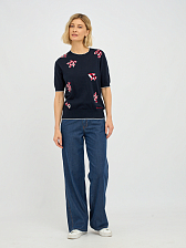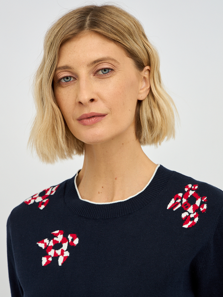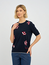 Этот стильный женский джемпер глубокого синего цвета станет ярким акцентом вашего гардероба. Изюминкой модели является яркий контрастный принт, расположенный по всей поверхности, и тонкая контрастная окантовка по краю горловины и по низу изделия, добавляющая элегантности.