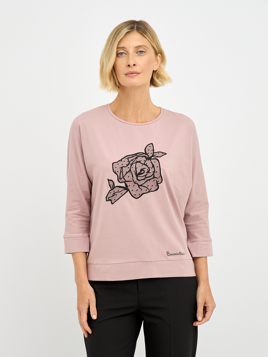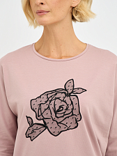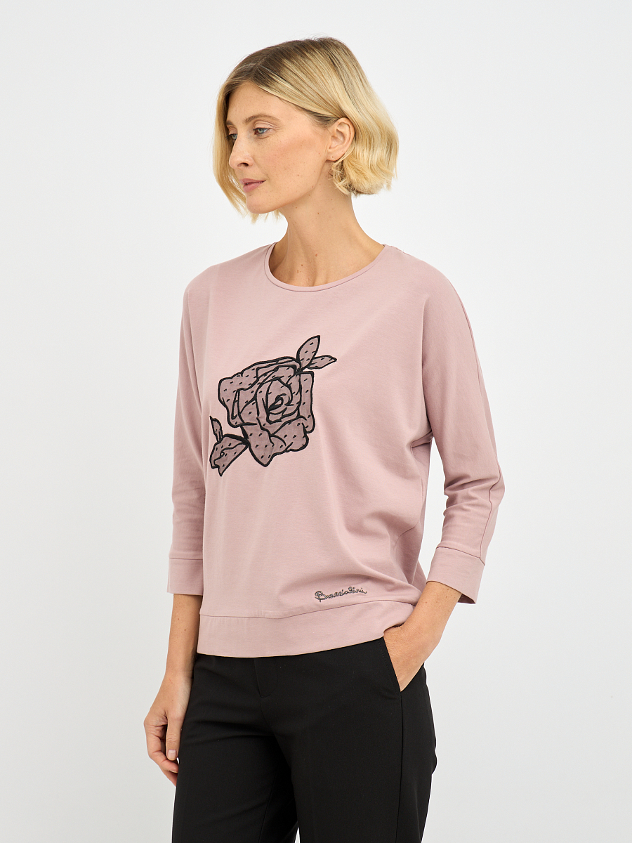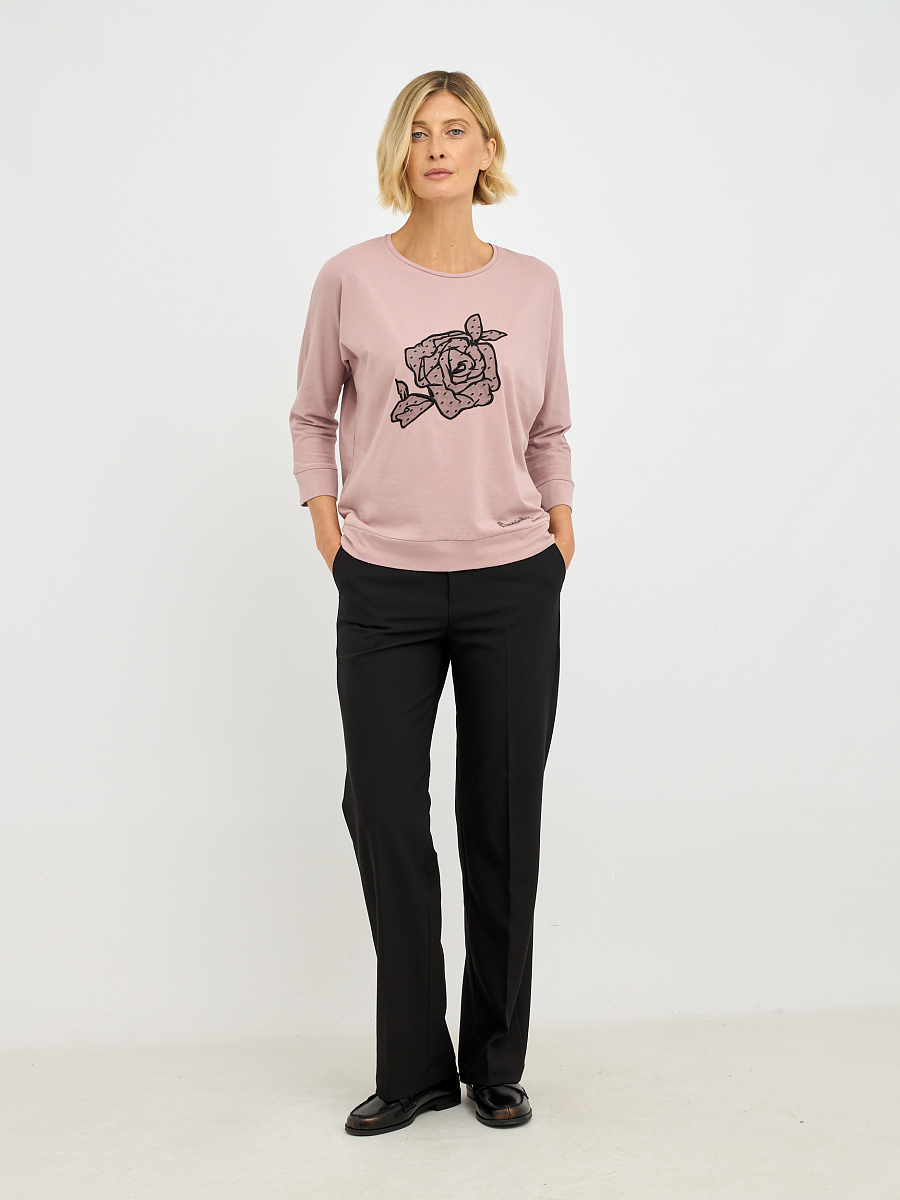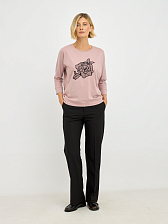 Акцентом джемпера является изящный декоративный цветок, добавляющий образу романтичности и очарования.
