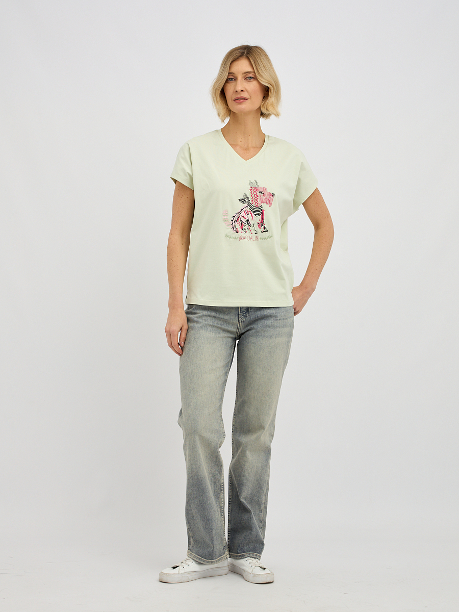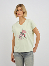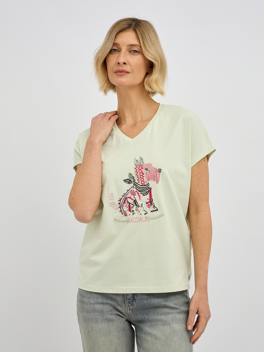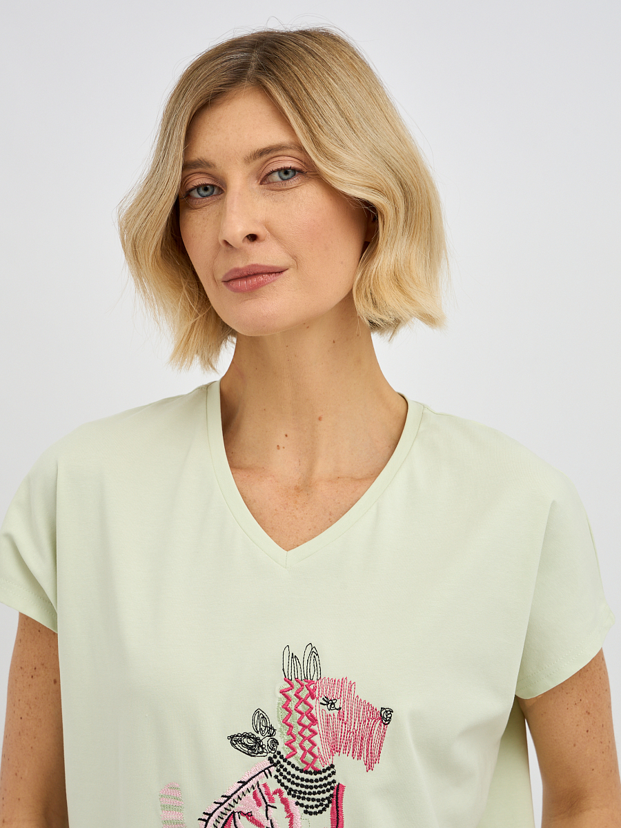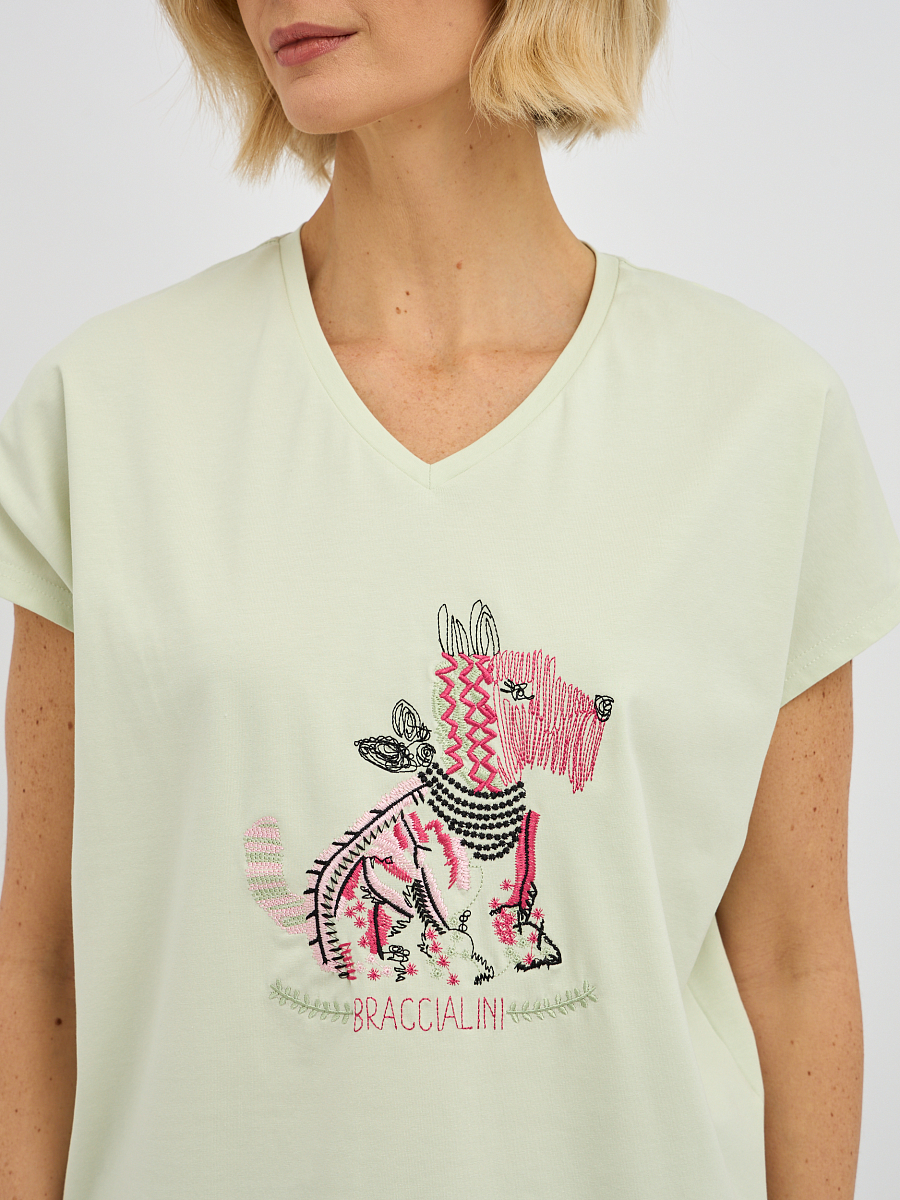 футболка женская в светло - зелёном цвете с вышивкой собачки