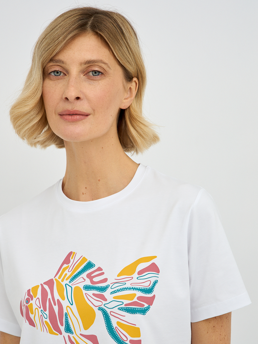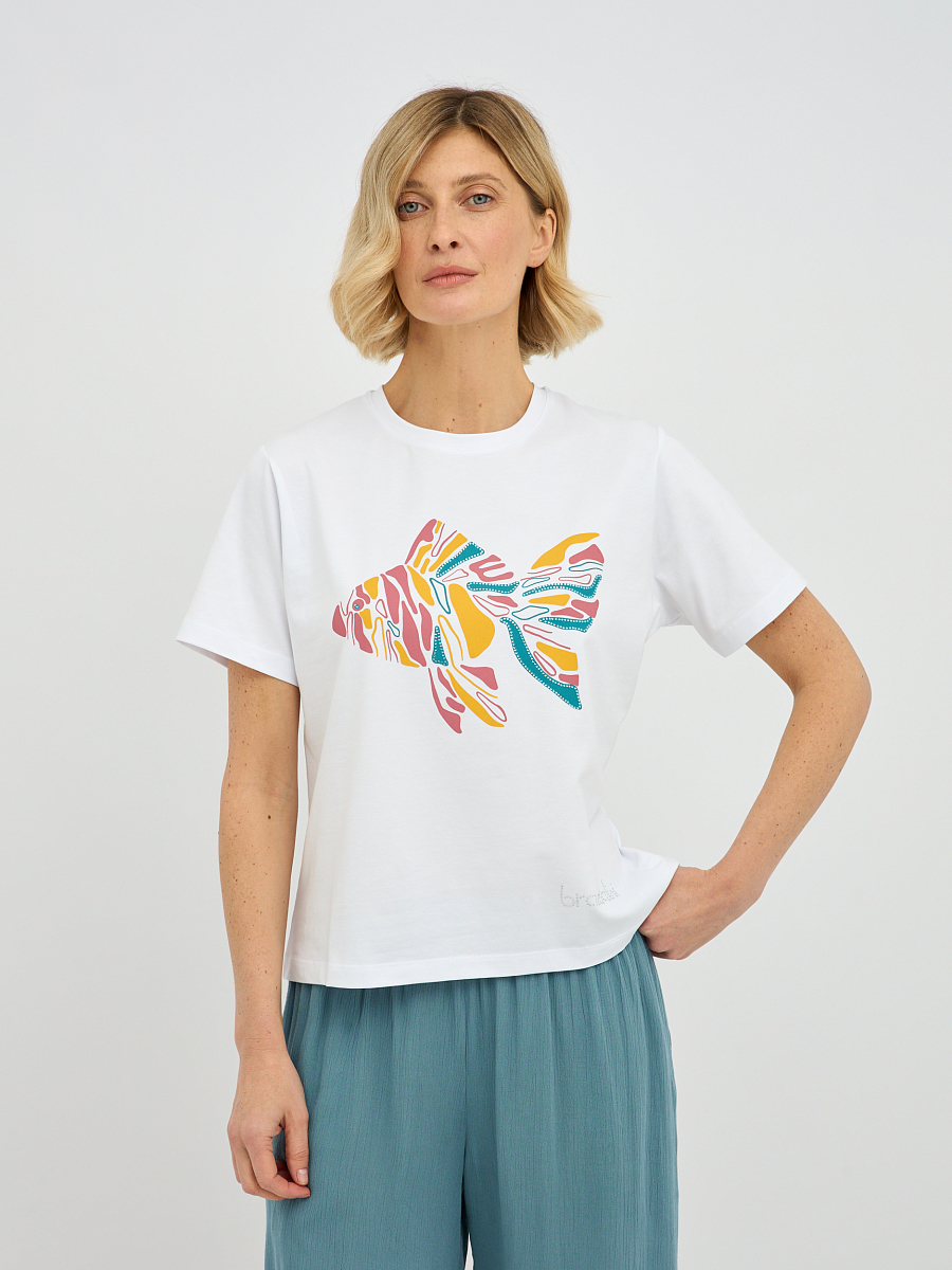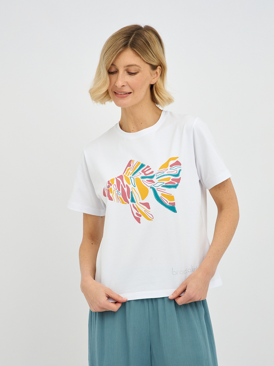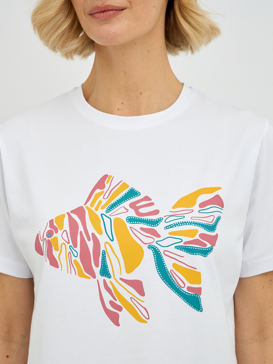 футболка женская в белом цвете с принтом рыбки и добавлением страз