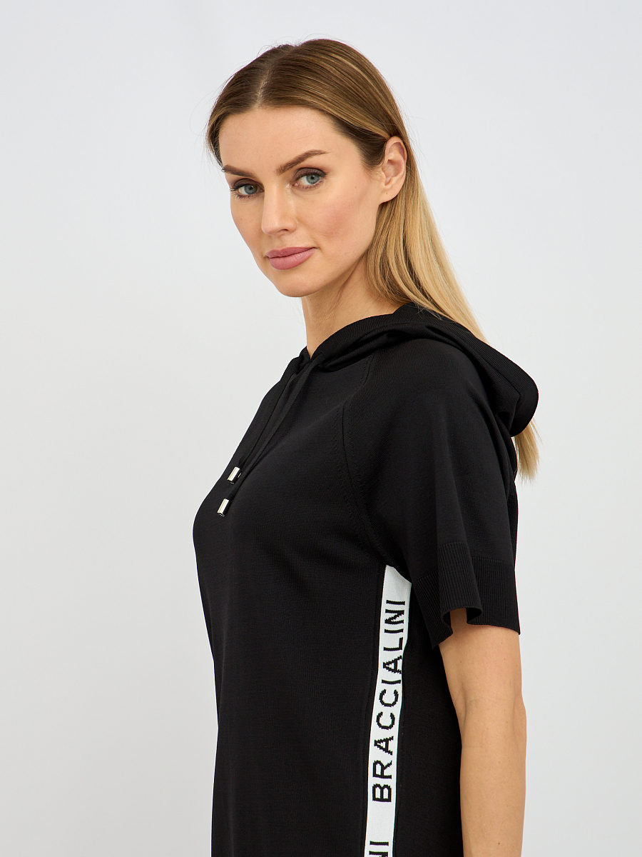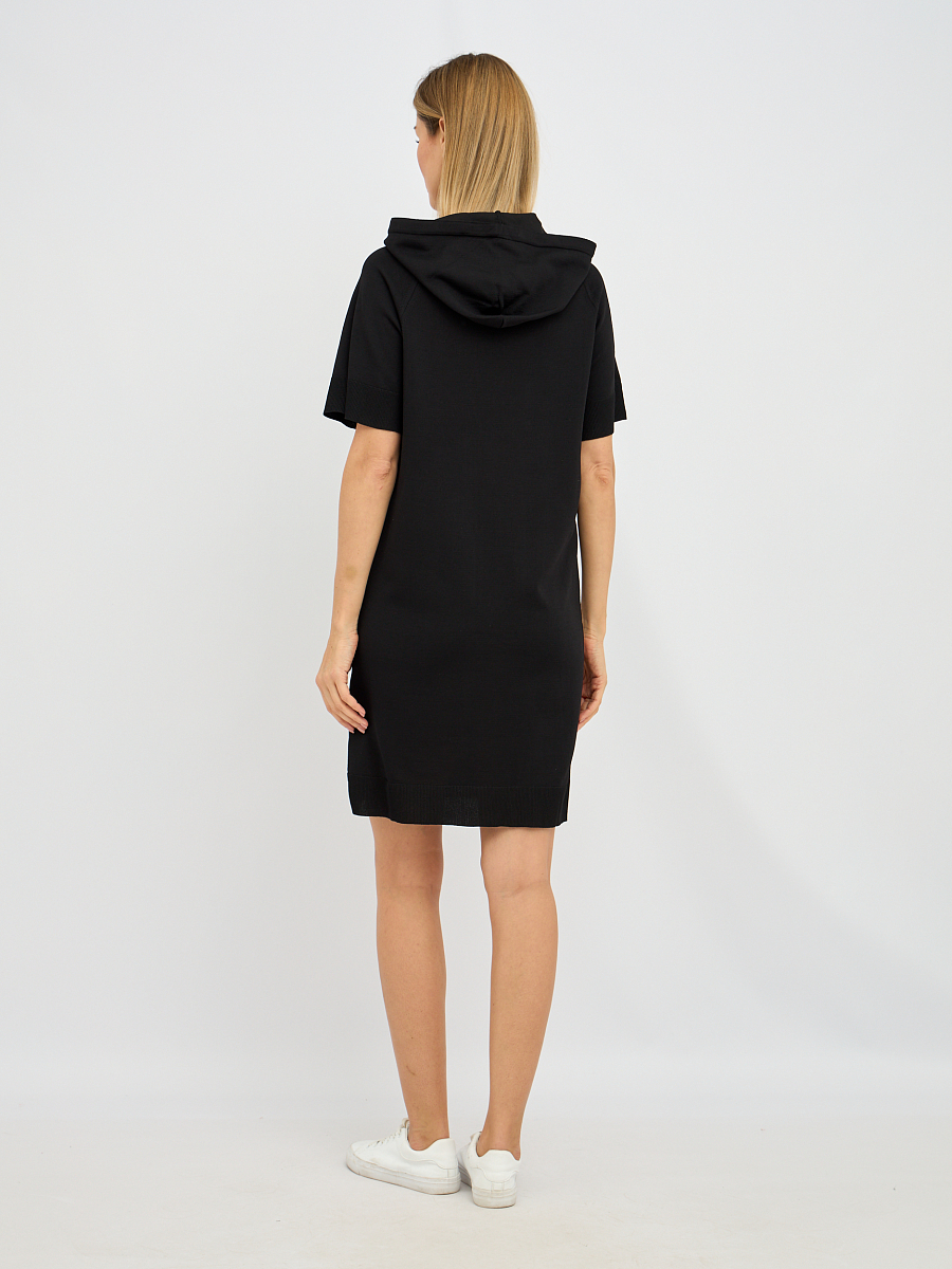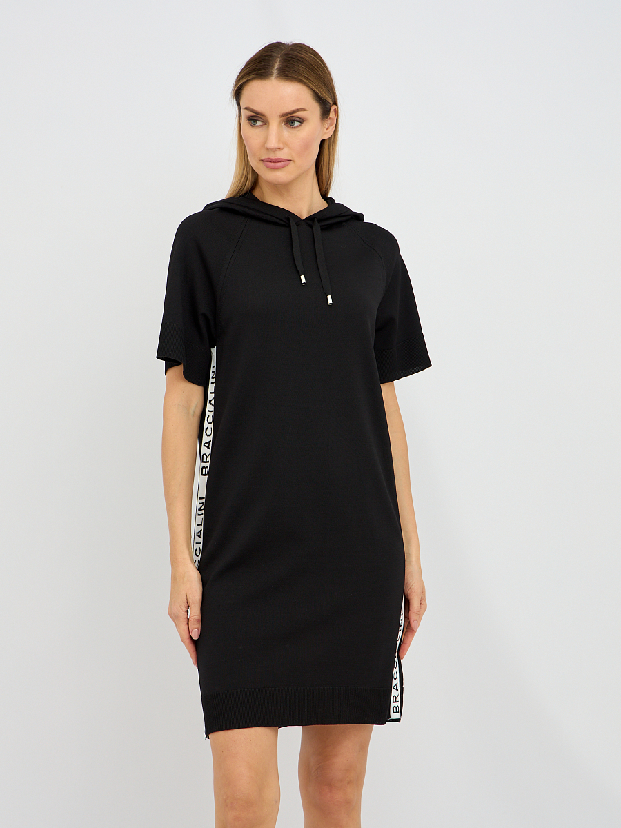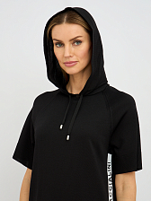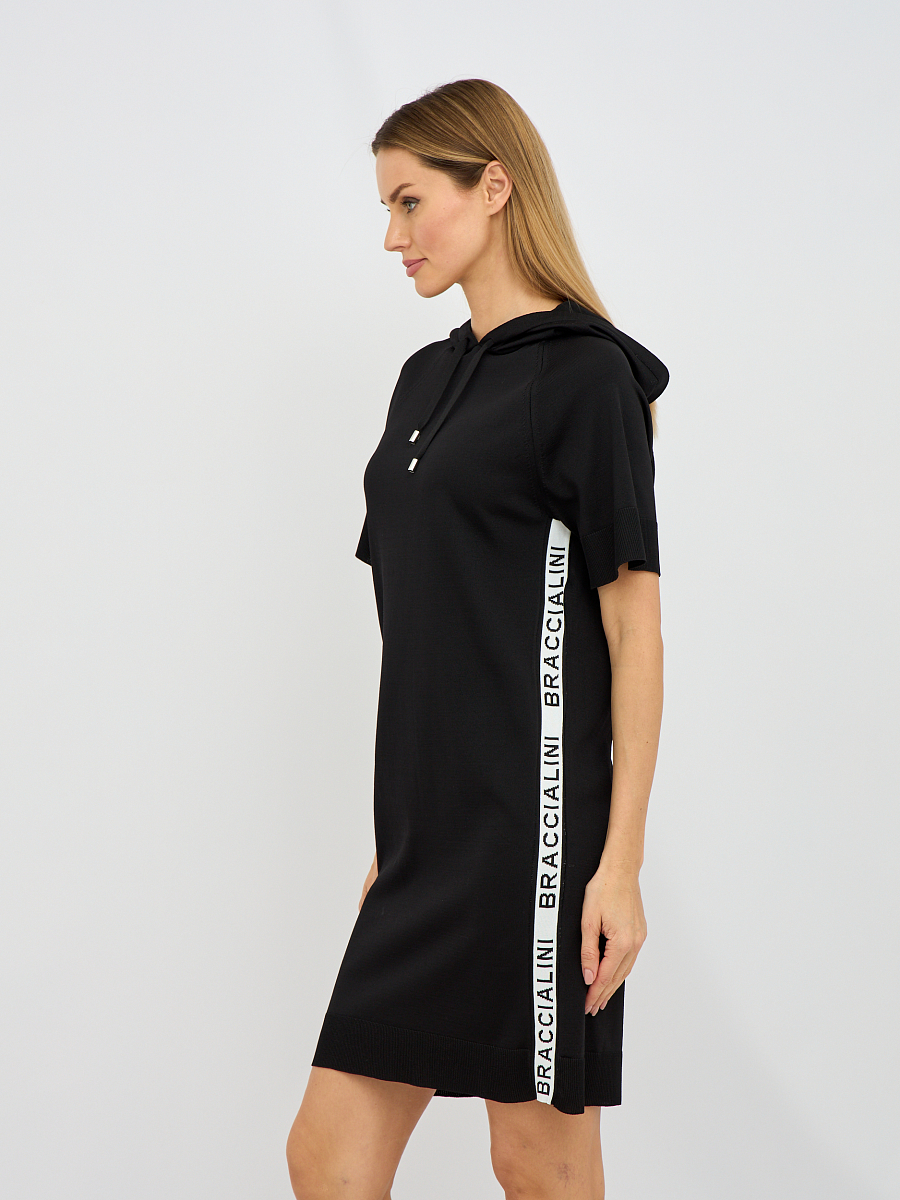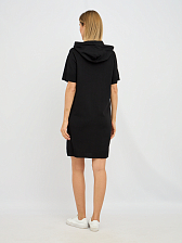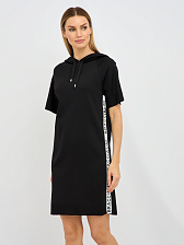Особенностью модели является капюшон, который добавляет образу непринужденности и практичности. Сбоку платья расположены полоски с надписями в виде названия бренда, что придает изделию уникальность и подчеркивает его спортивный характер.
