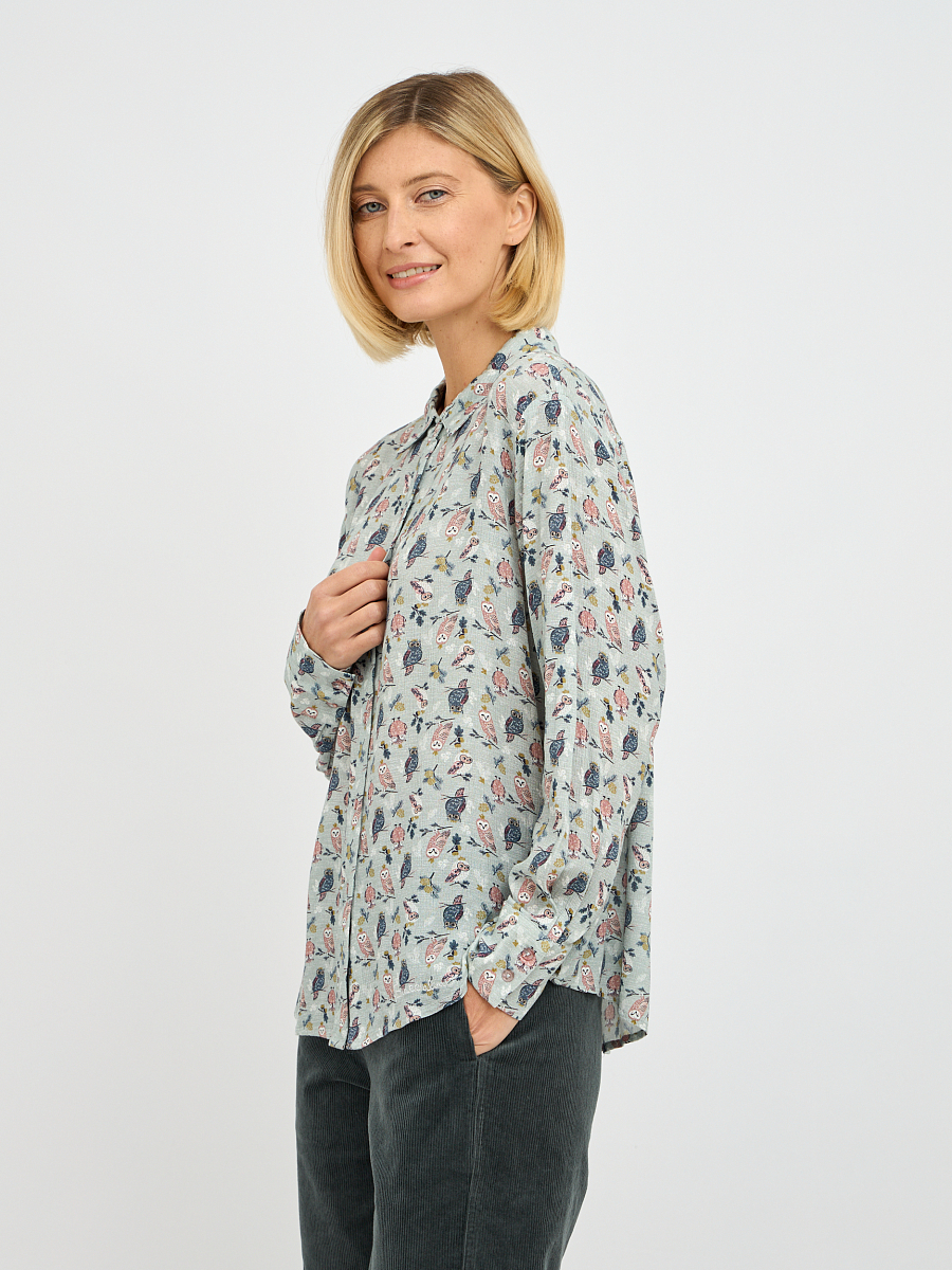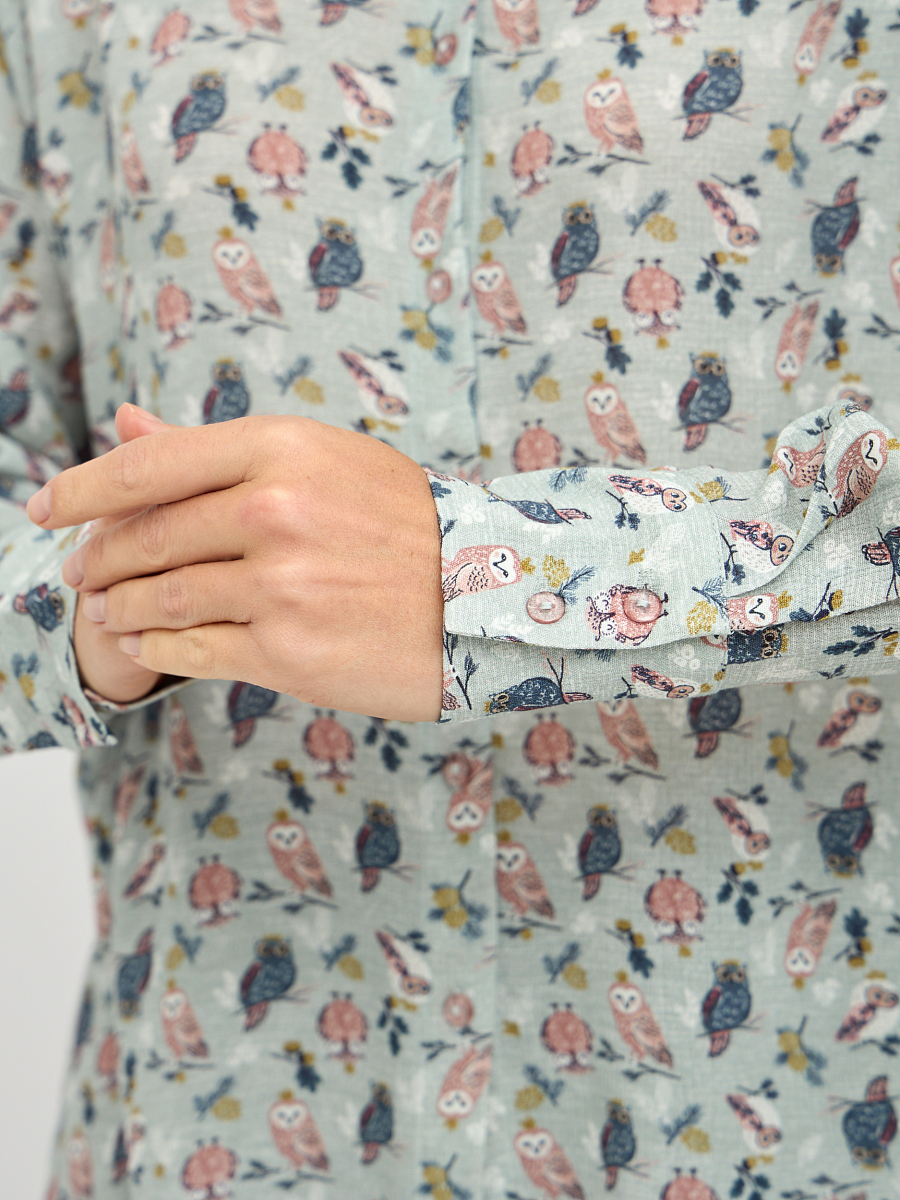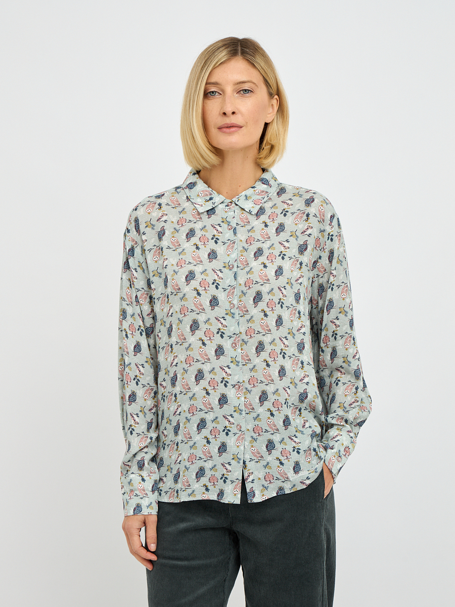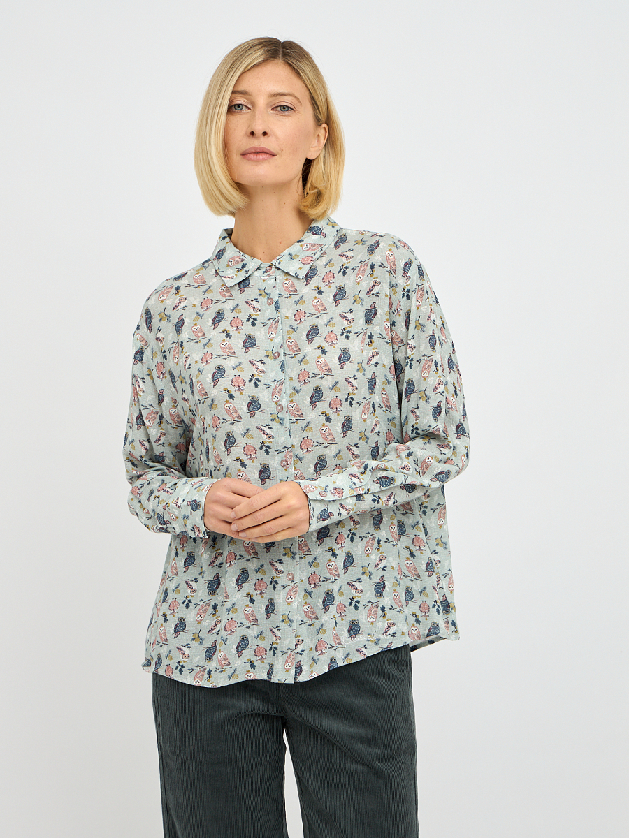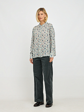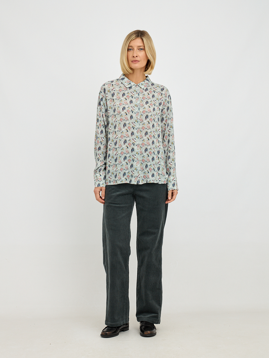 Эта женственная блузка станет изюминкой вашего гардероба, сочетая в себе элегантность и комфорт. Нежный серо-зеленый оттенок ткани придает образу свежесть и утонченность. Изысканный принт добавляет блузке оригинальности и делает ее запоминающейся. Свободный крой обеспечивает комфорт движений и позволяет чувствовать себя уверенно в любой ситуации. Классический воротник добавляет блузке строгости, что позволяет сочетать ее как с деловыми брюками, так и с джинсами.