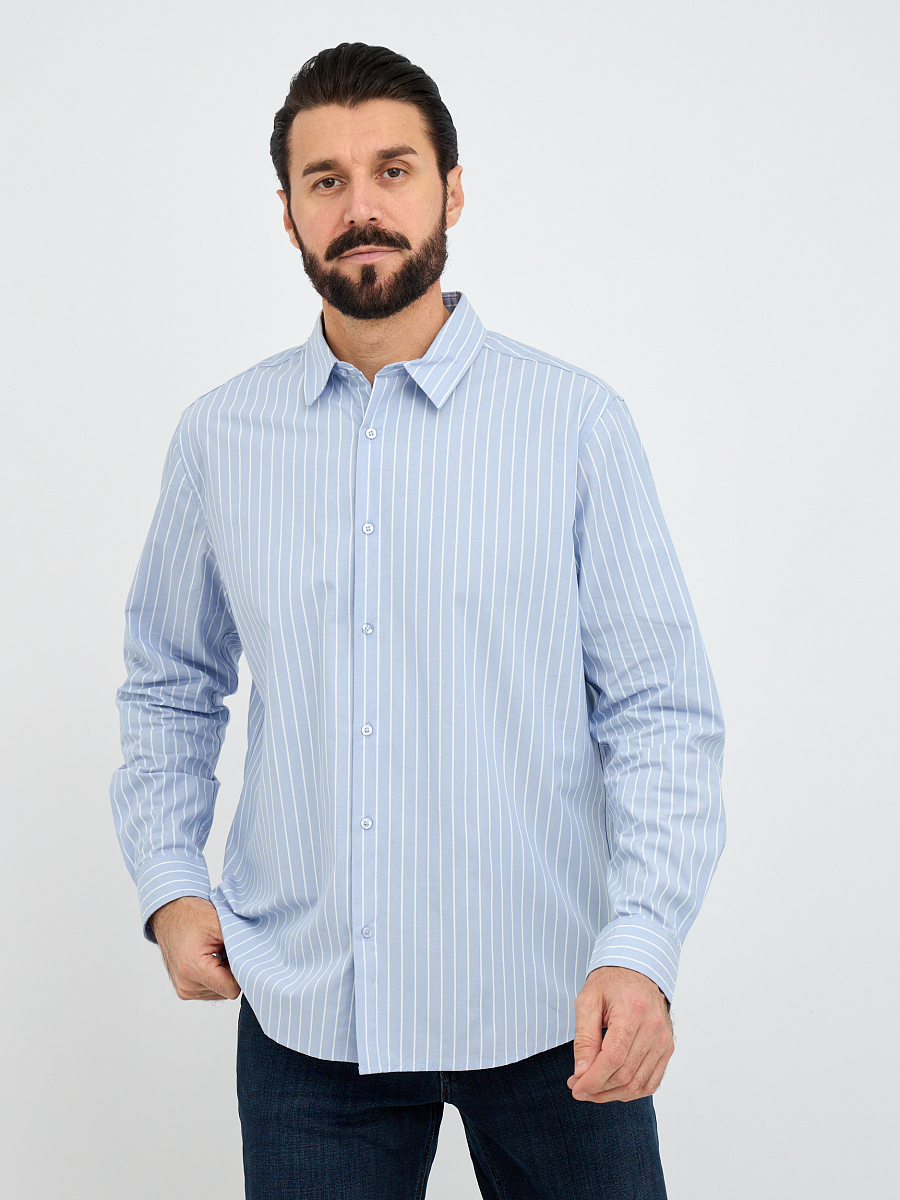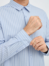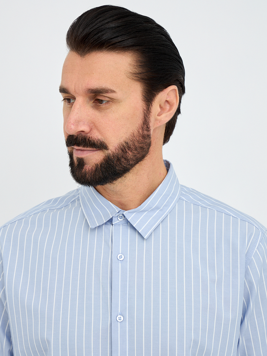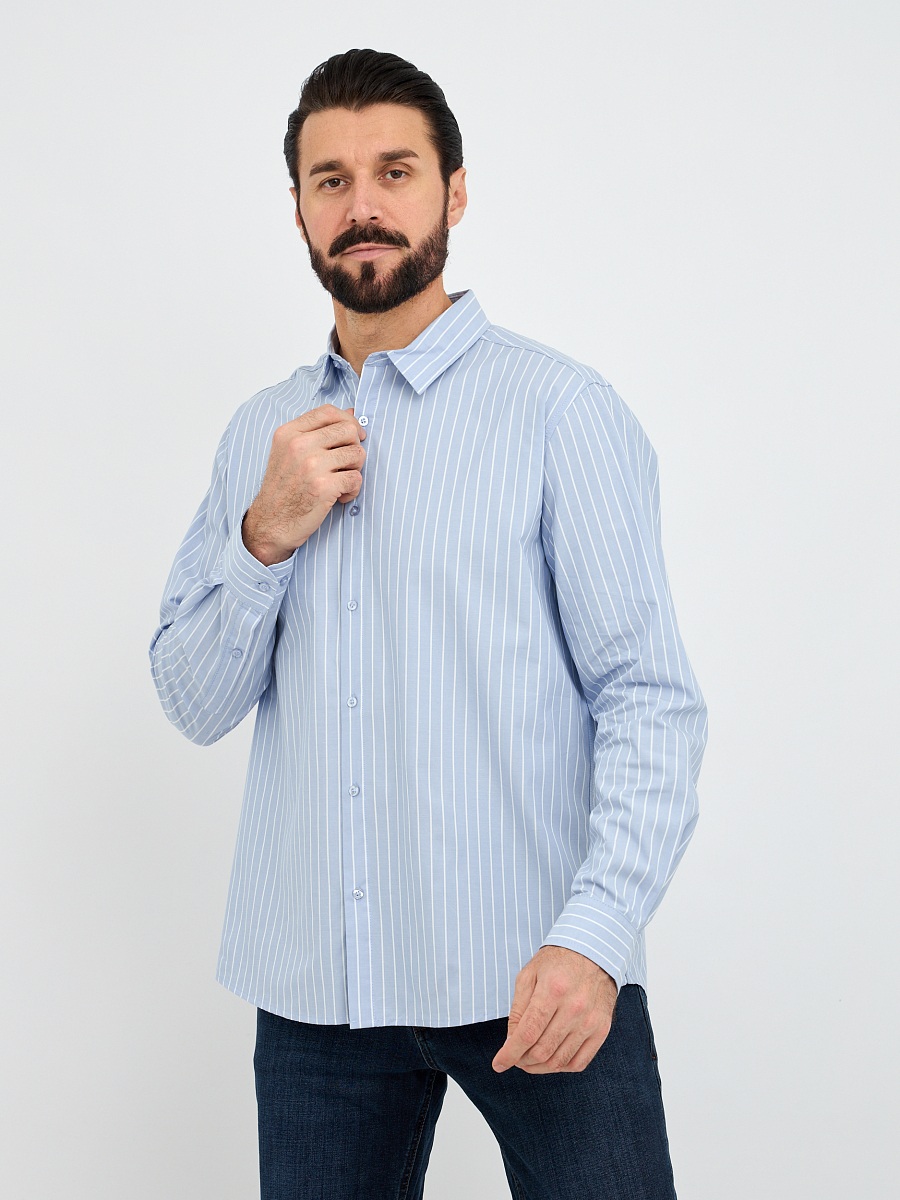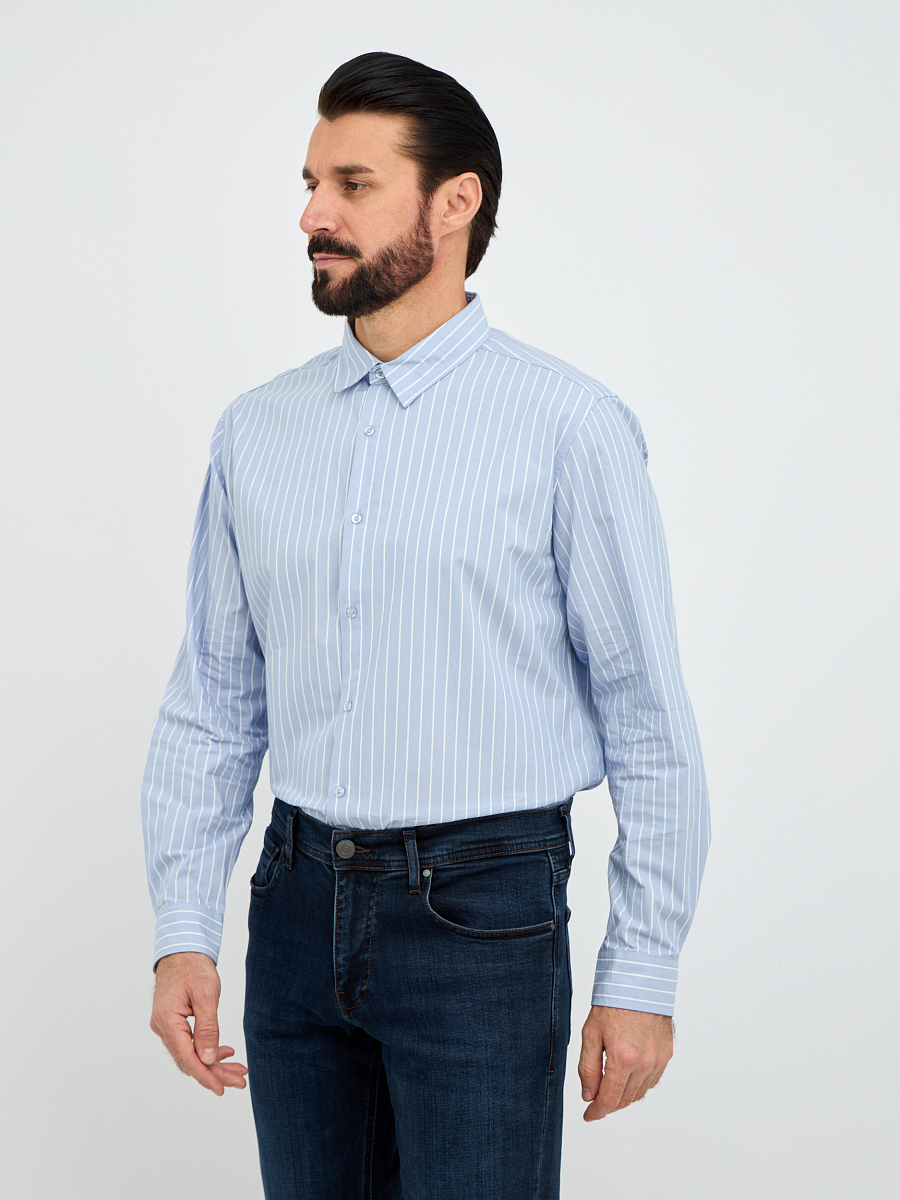 Голубой цвет в сочетании с полосатым узором придаёт рубашке свежий и современный вид. Она отлично подходит как для повседневной носки, так и для более формальных мероприятий. Сочетайте её с джинсами или брюками, и вы всегда будете выглядеть стильно и уверенно.