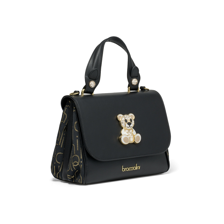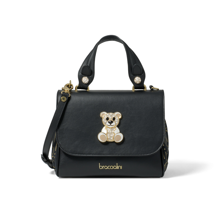 Сумка с фигурной ручкой. Модель со съемным и регулируемым плечевым ремнем, В центре — милый эмалированный медвежонок, декорированный стразами.