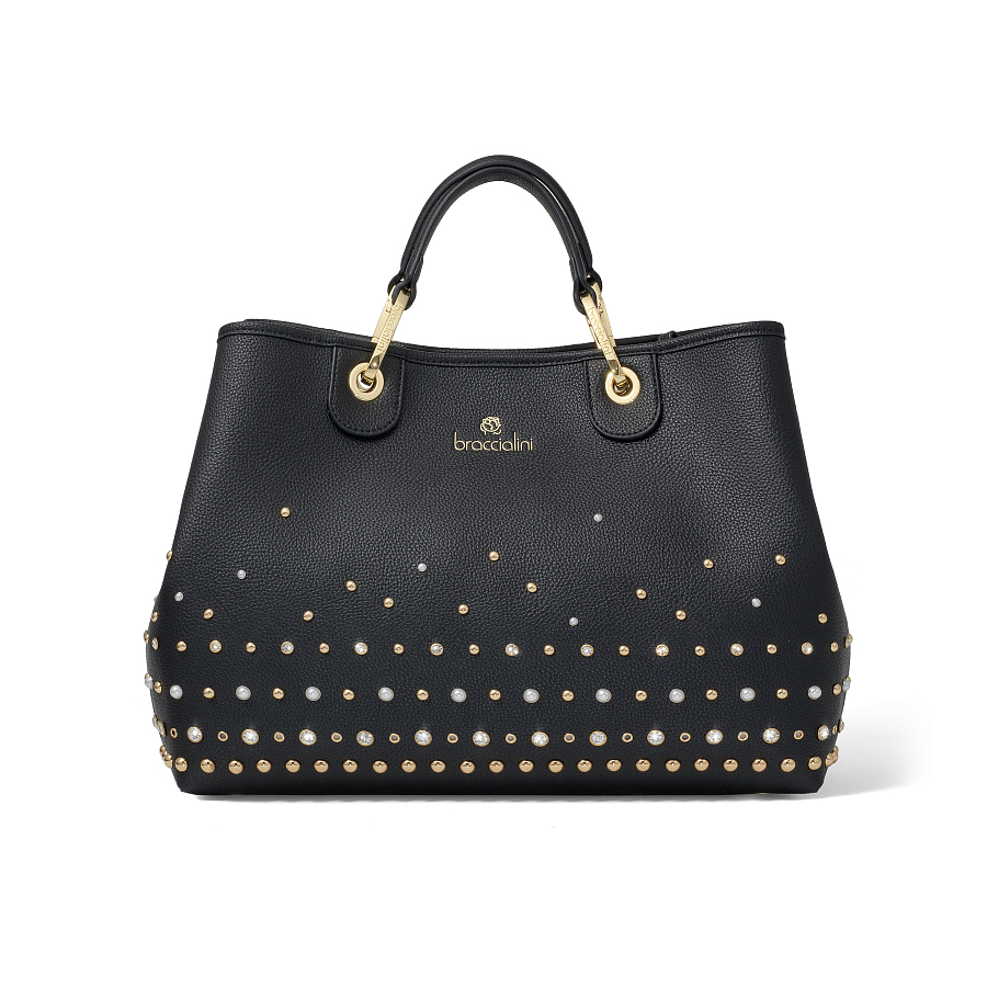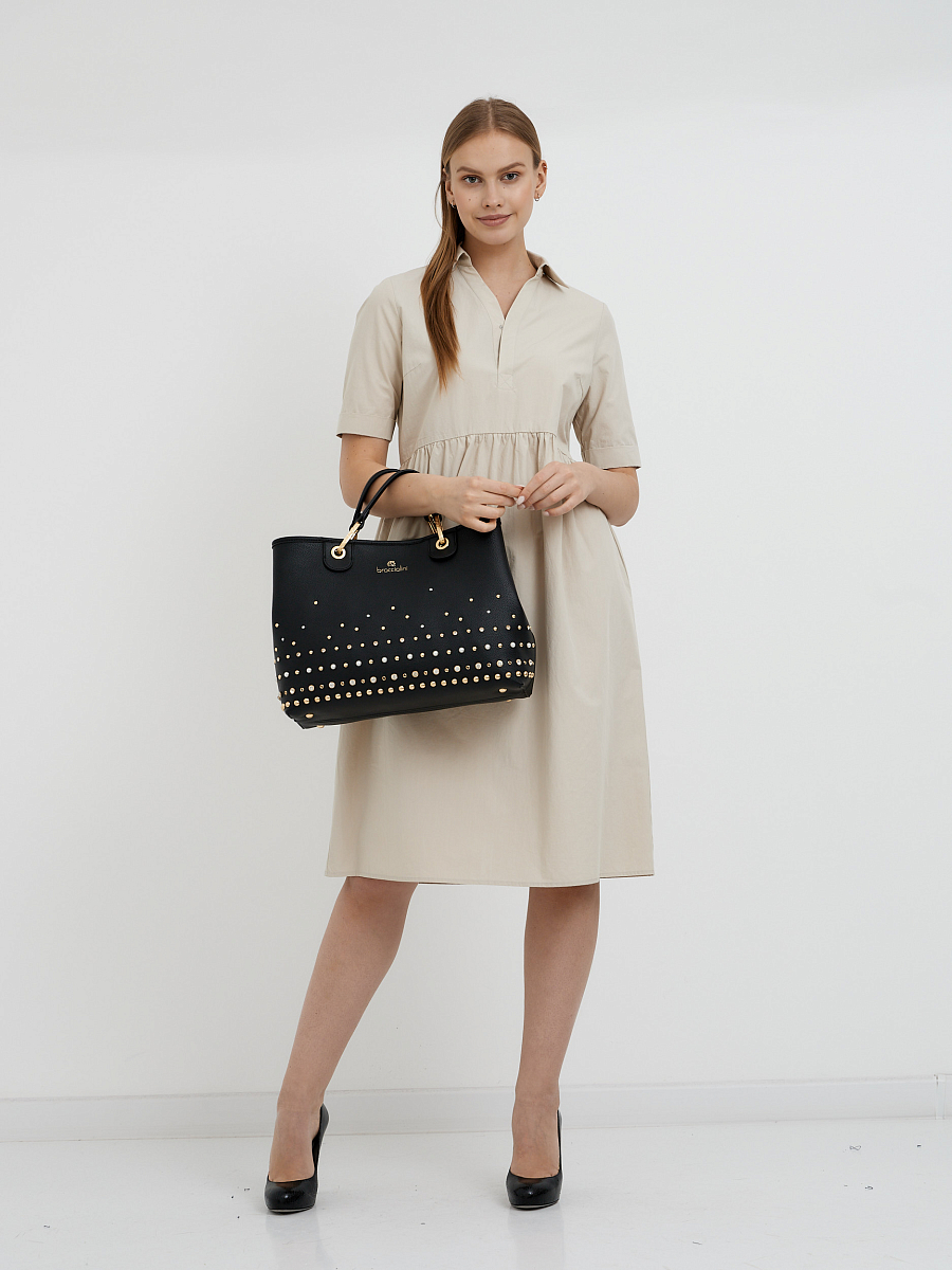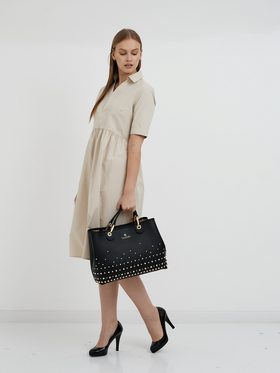 Сумка на застежке- клипсе. Три внутренних кармана, один с молнией и два открытых.
