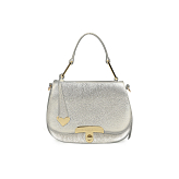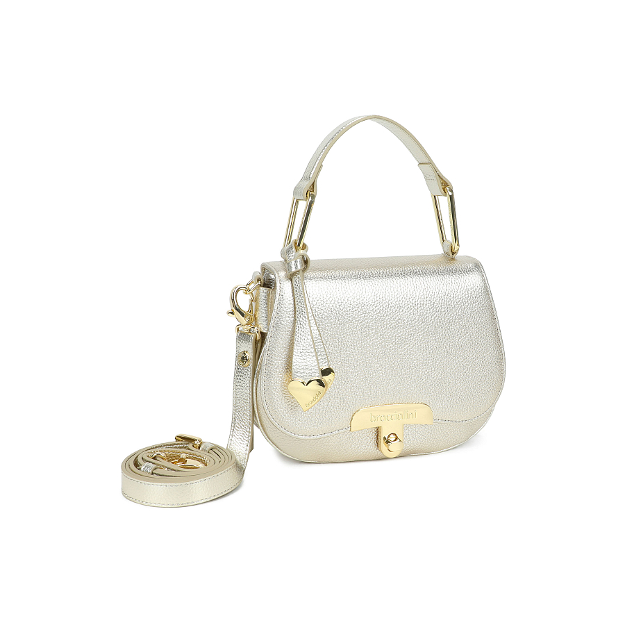Эта модель универсальна: носите ее в руке благодаря удобной ручке с металлическими акцентами или на плече, используя съемный регулируемый ремень. Особый шарм сумочке придает изысканный кожаный брелок в форме сердечка с золотистыми металлическими элементами, добавляющий нотку романтики и индивидуальности.