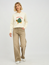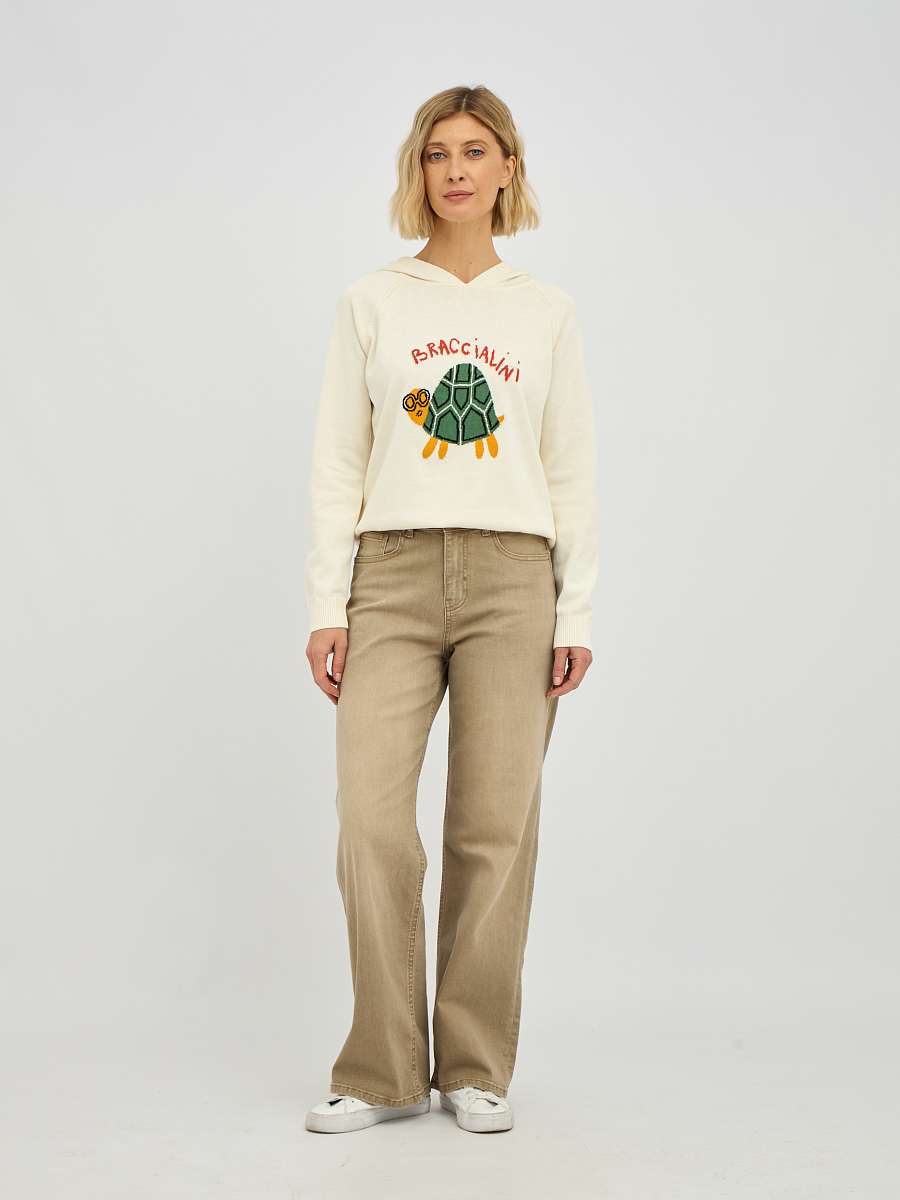 джемпер - худи женский в молочном цвете с капюшоном и вязаным узором в виде черепахи и надписью
