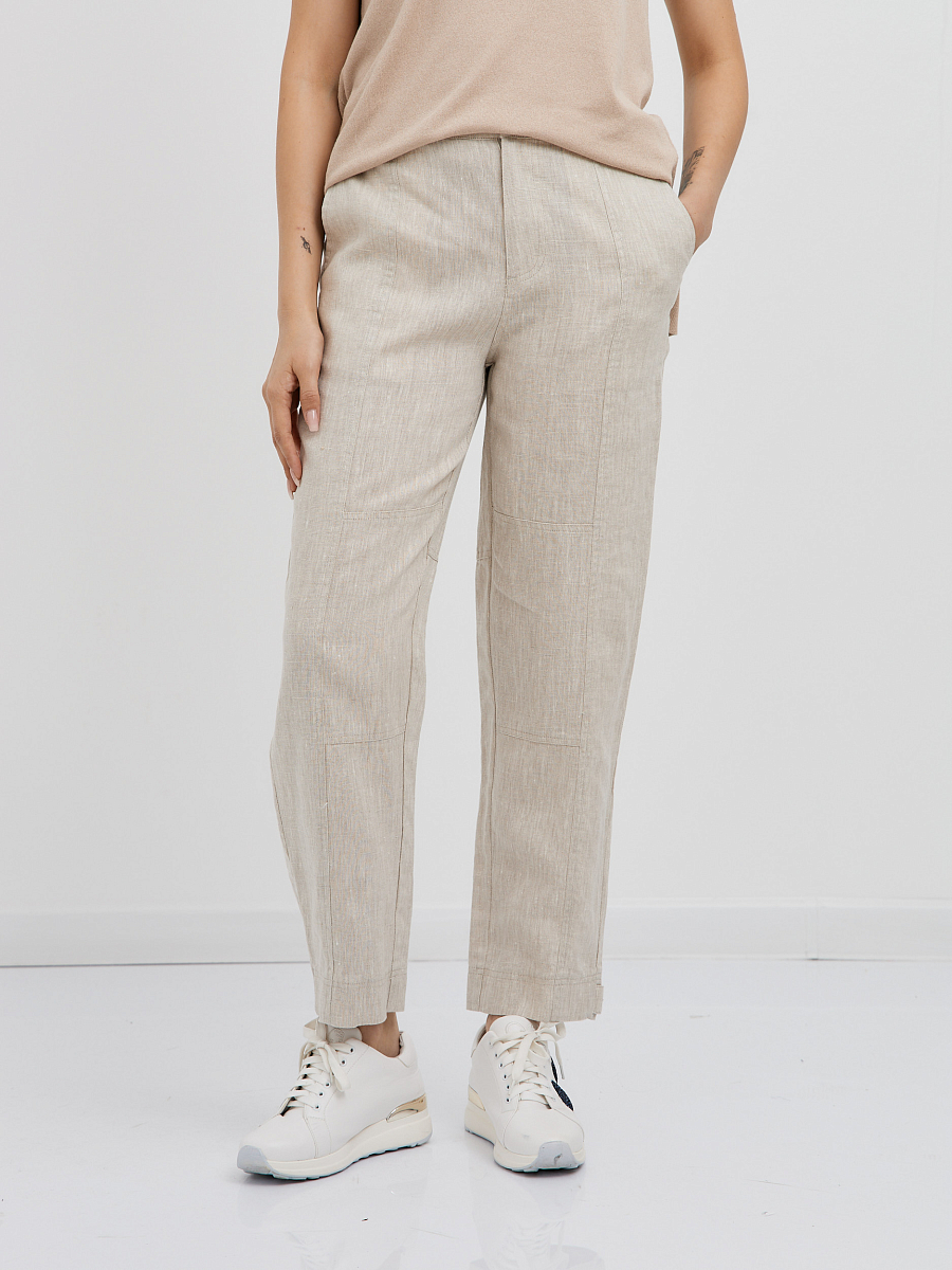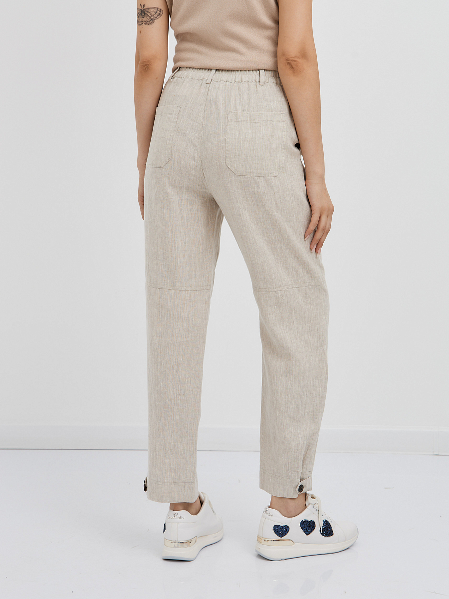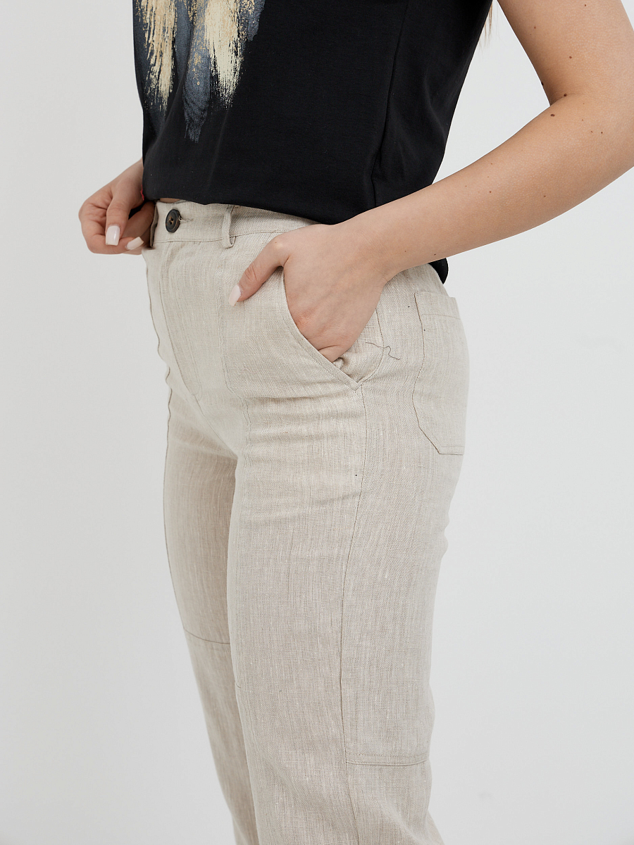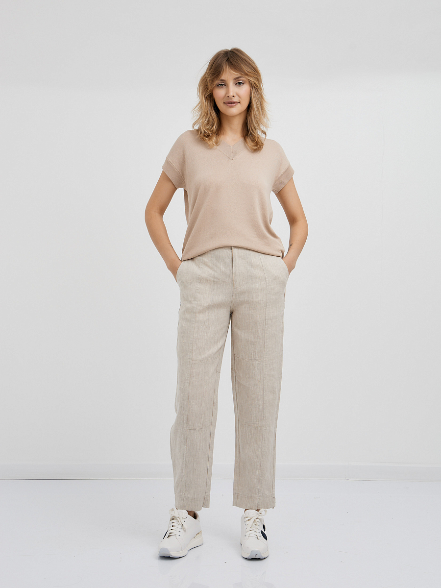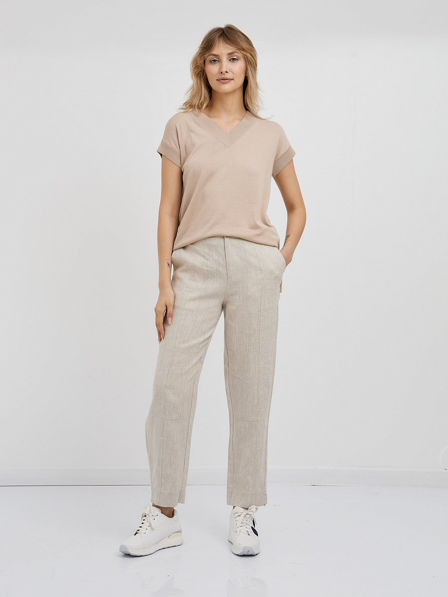 Льняные брюки – очень универсальная вещь на теплый сезон. Их можно сочетать с футболками, блузками, рубашками, топами. Дайте волю фантазии! Из обуви можно выбрать кроссовки или босоножки.