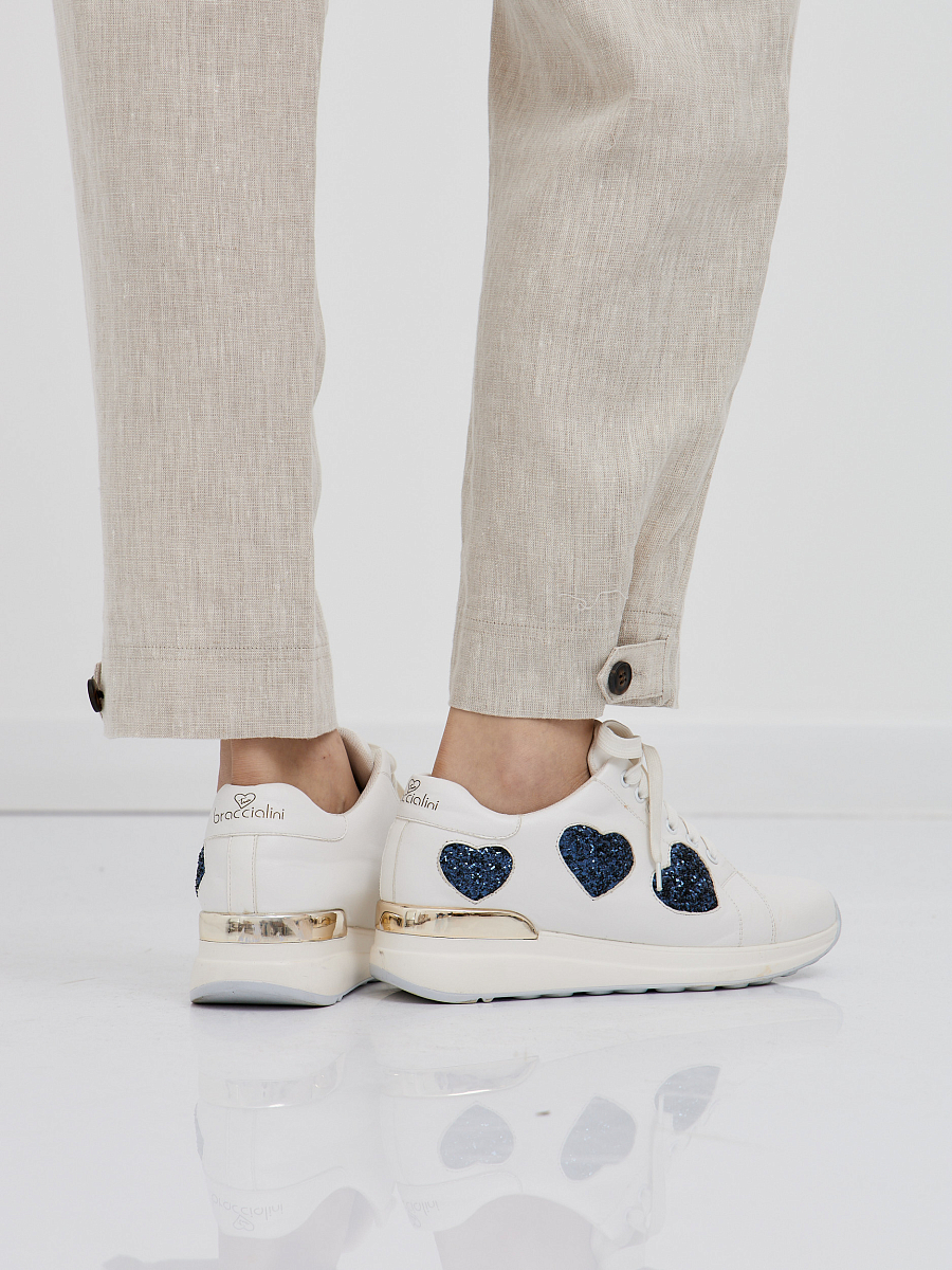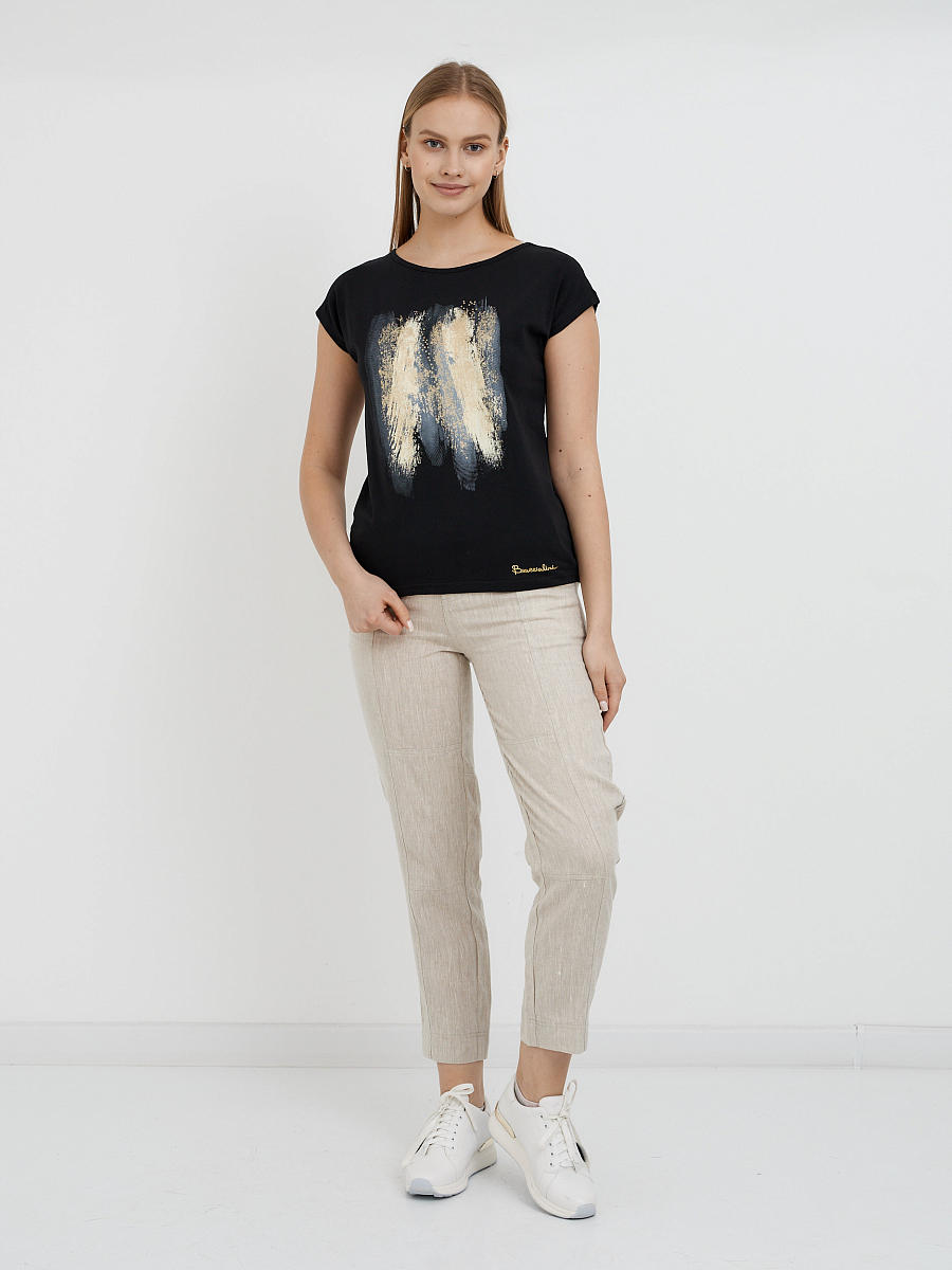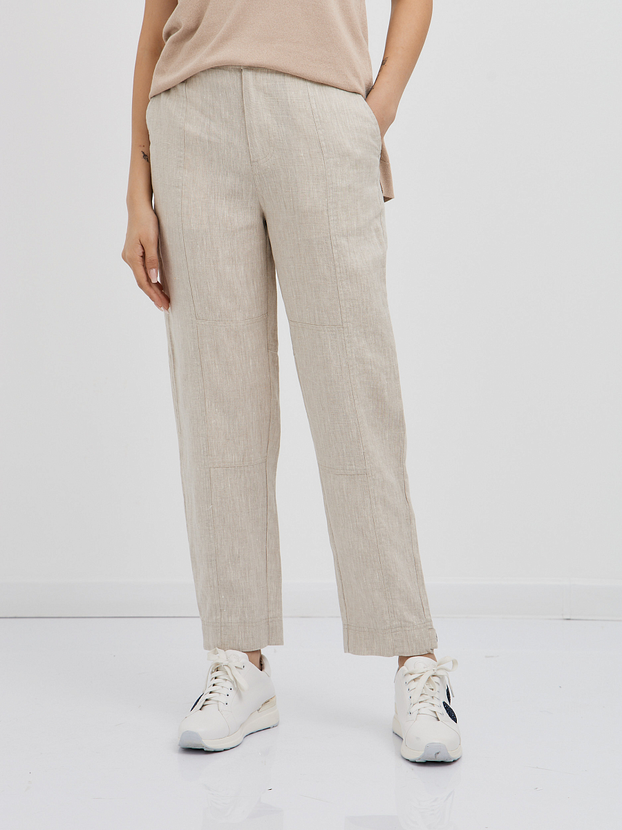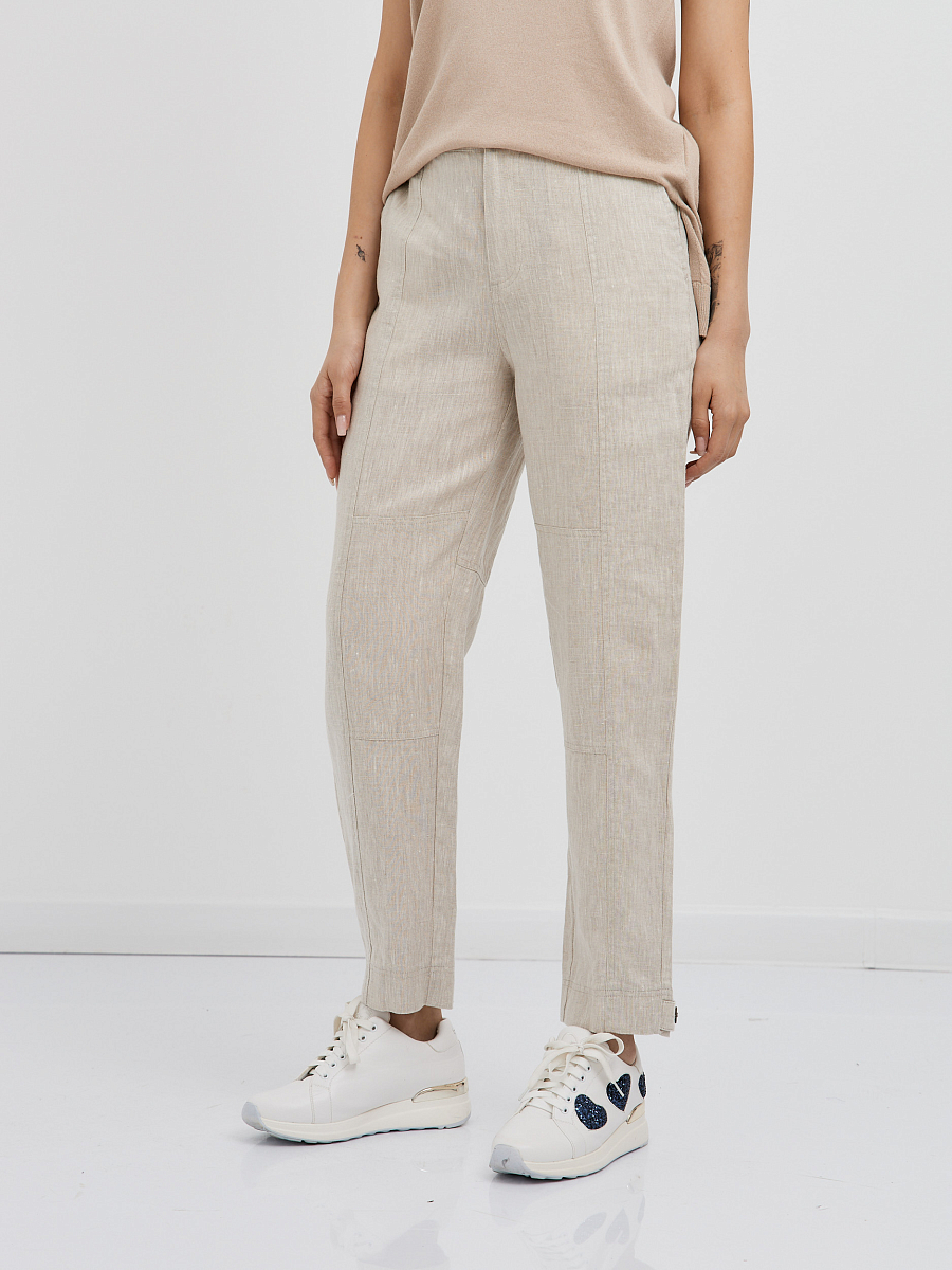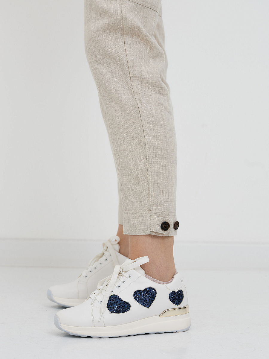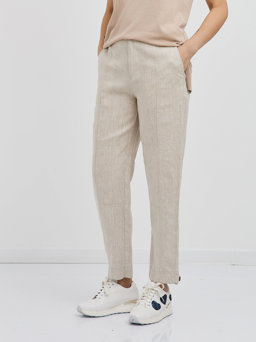 Льняные брюки – очень универсальная вещь на теплый сезон. Их можно сочетать с футболками, блузками, рубашками, топами. Дайте волю фантазии! Из обуви можно выбрать кроссовки или босоножки.