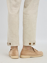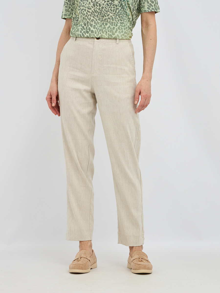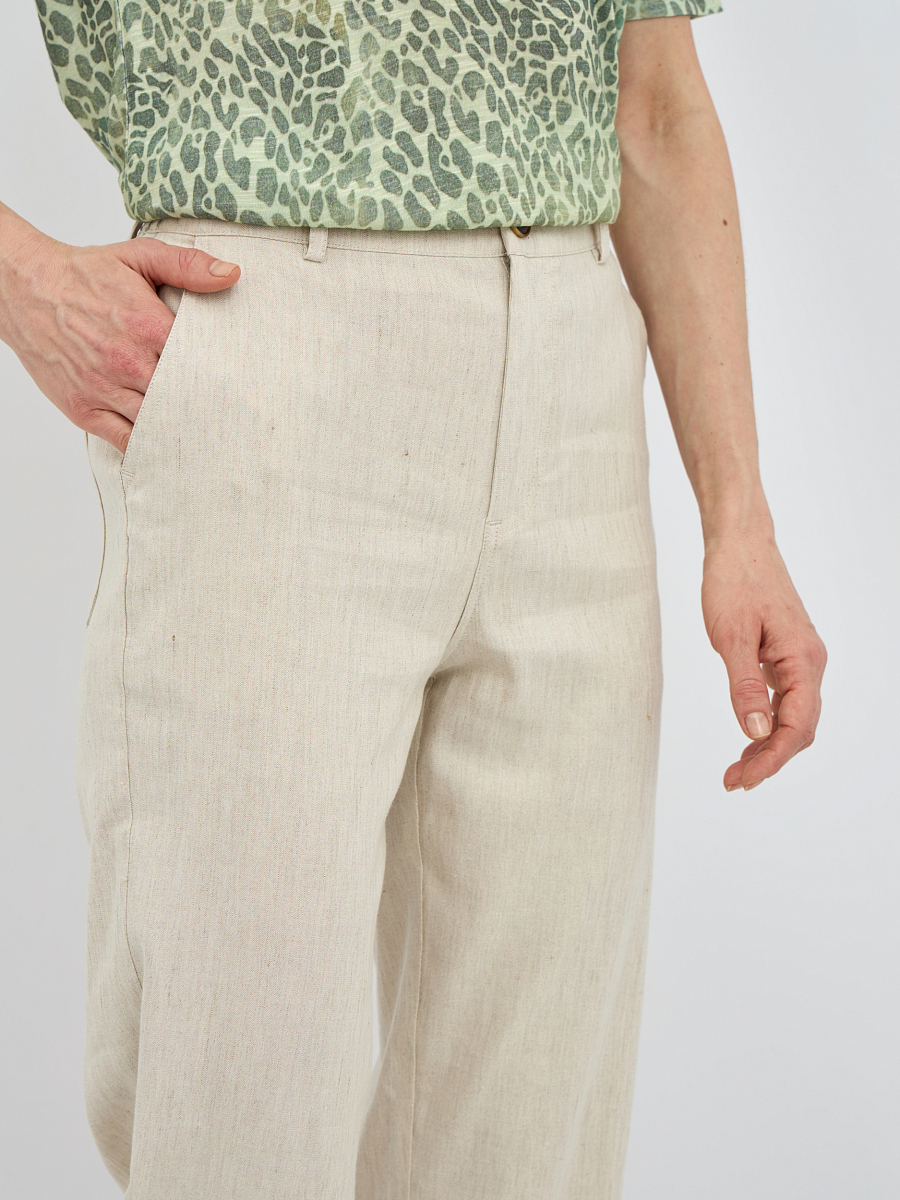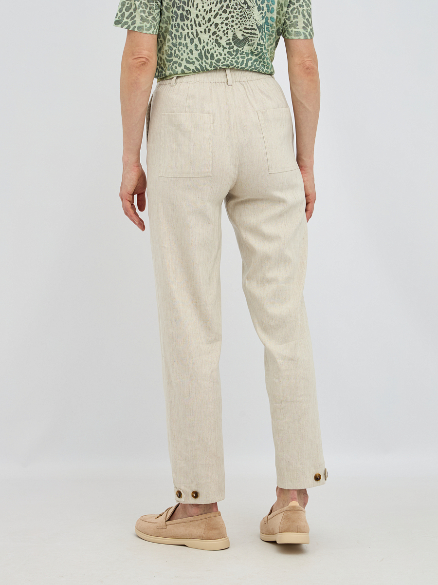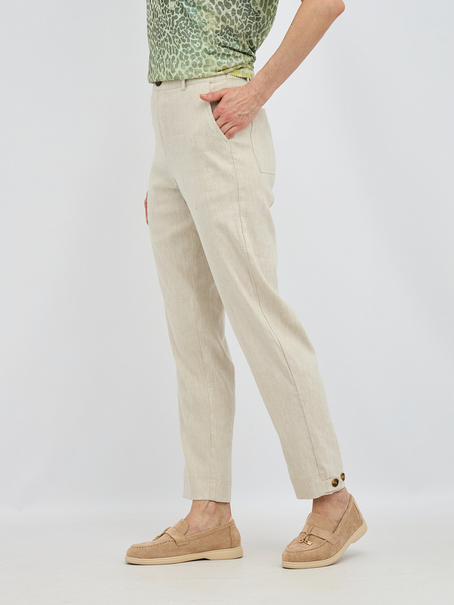 Брюки выполнены из высококачественной смеси льна,района и эластана. Этот состав обеспечивает отличную воздухопроницаемость и терморегуляцию, что делает брюки идеальными для теплого времени года. Добавление эластана придаёт изделию необходимую эластичность, позволяя брюкам идеально сидеть по фигуре и не сковывать движения.