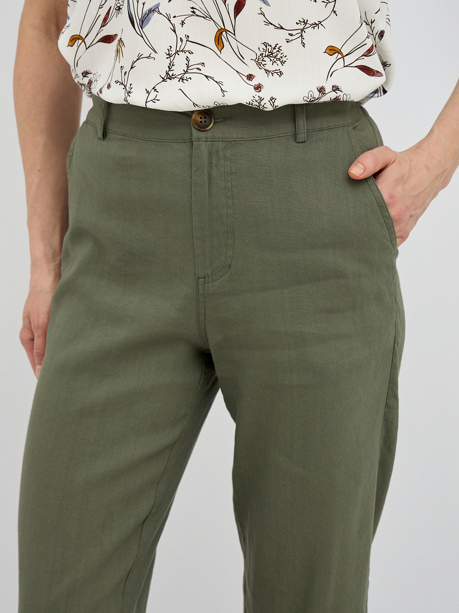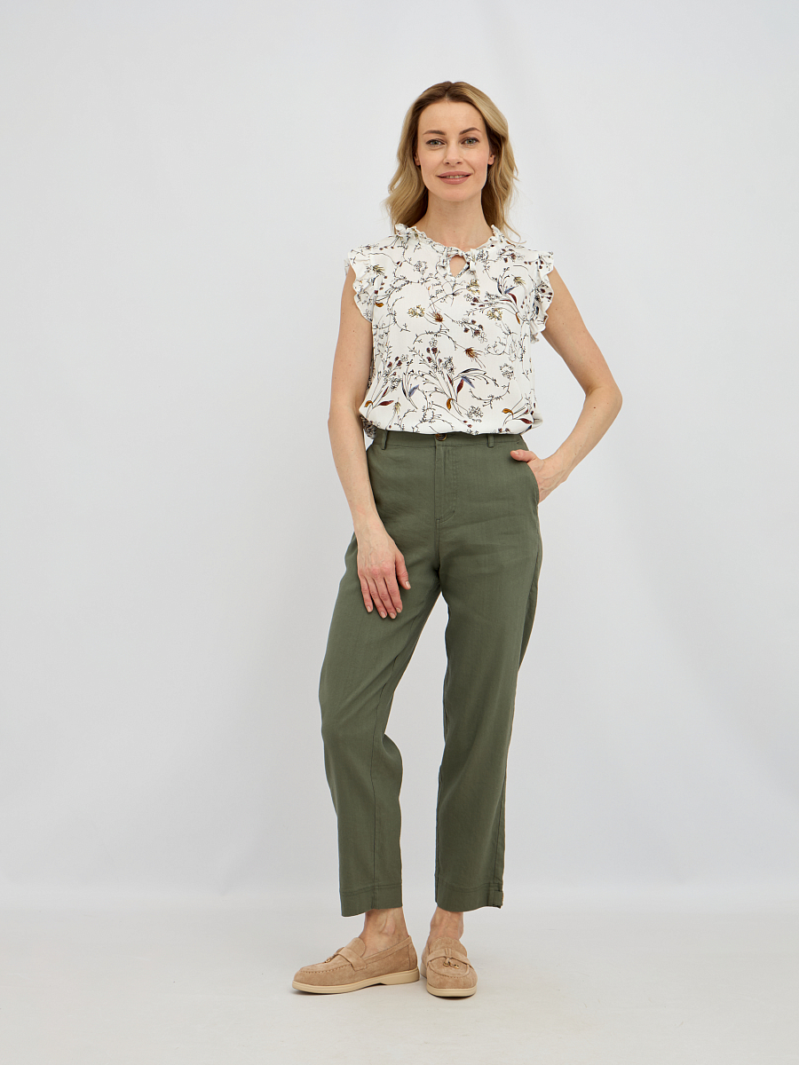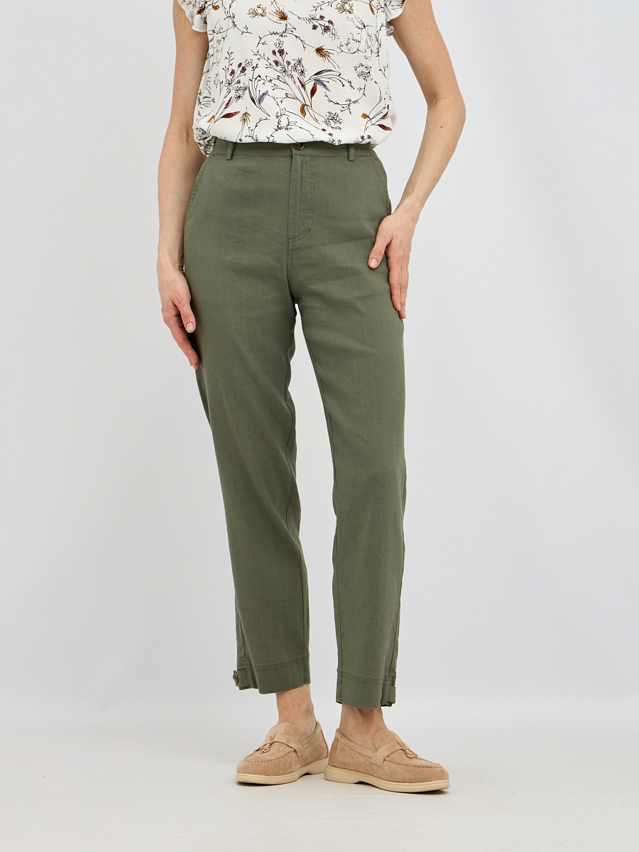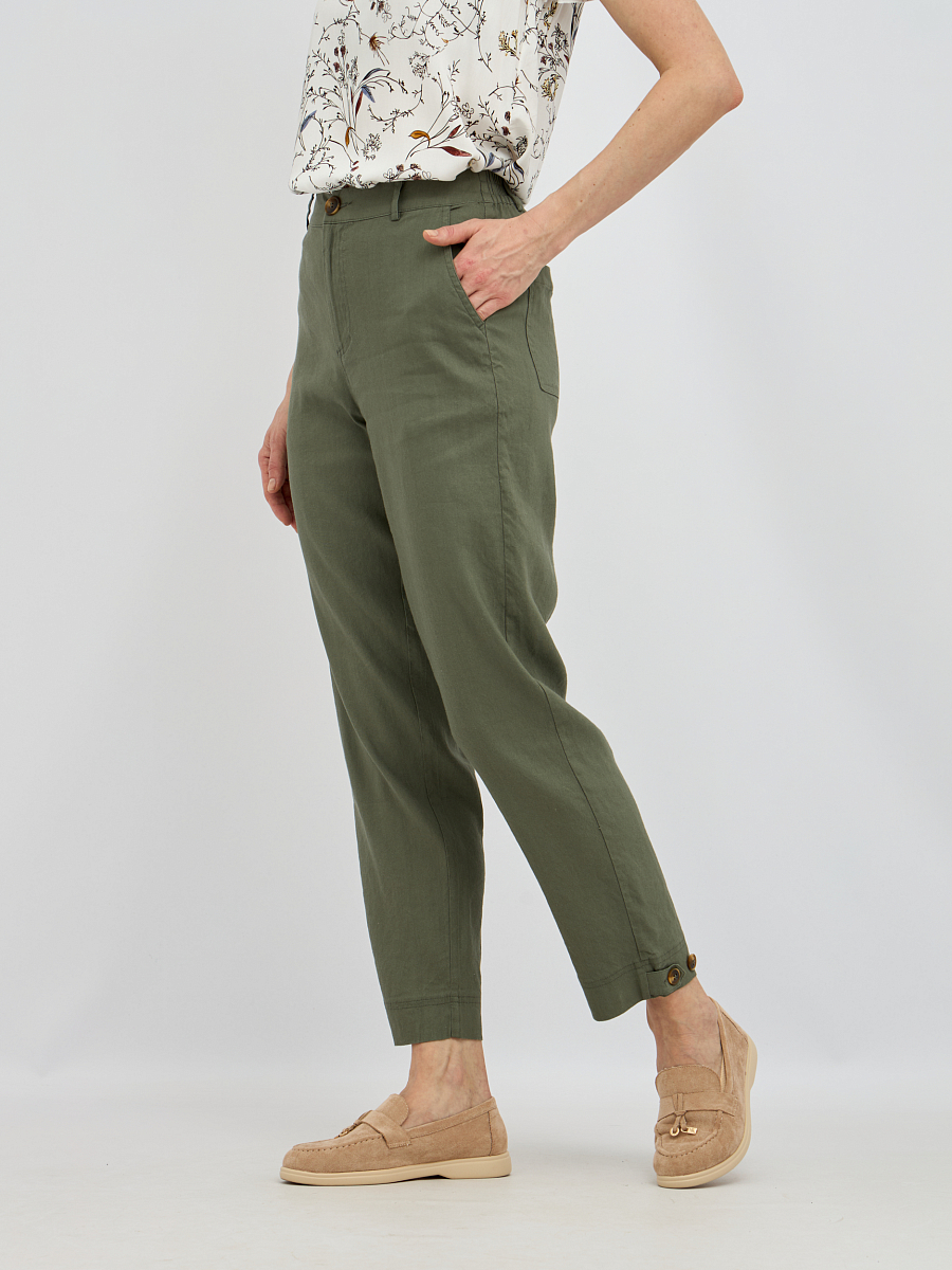 Брюки выполнены из высококачественной смеси льна,района и эластана. Этот состав обеспечивает отличную воздухопроницаемость и терморегуляцию, что делает брюки идеальными для теплого времени года. Добавление эластана придаёт изделию необходимую эластичность, позволяя брюкам идеально сидеть по фигуре и не сковывать движения.