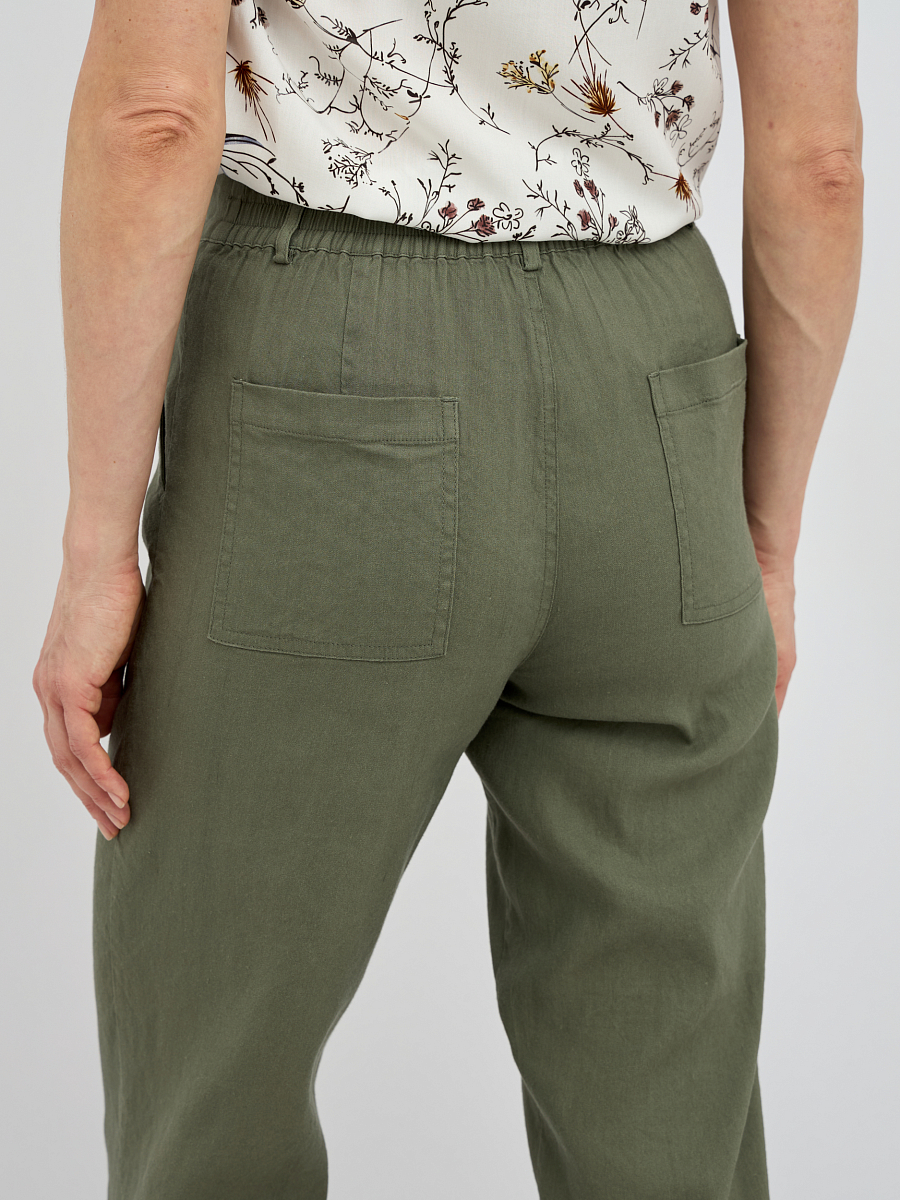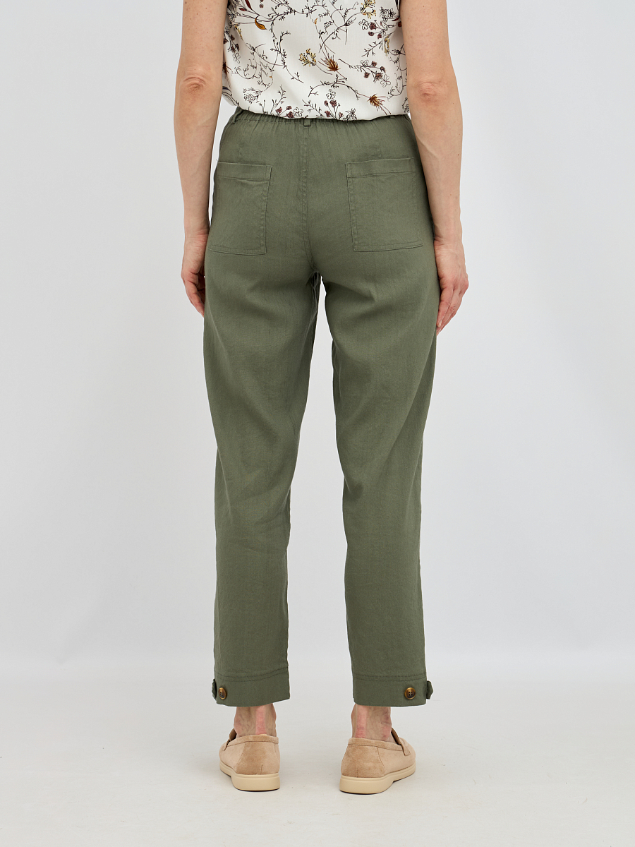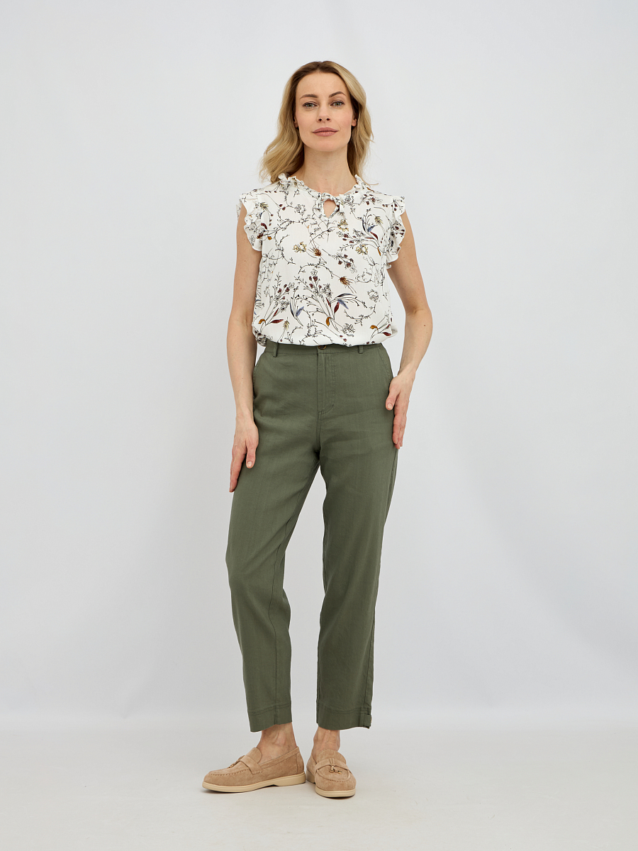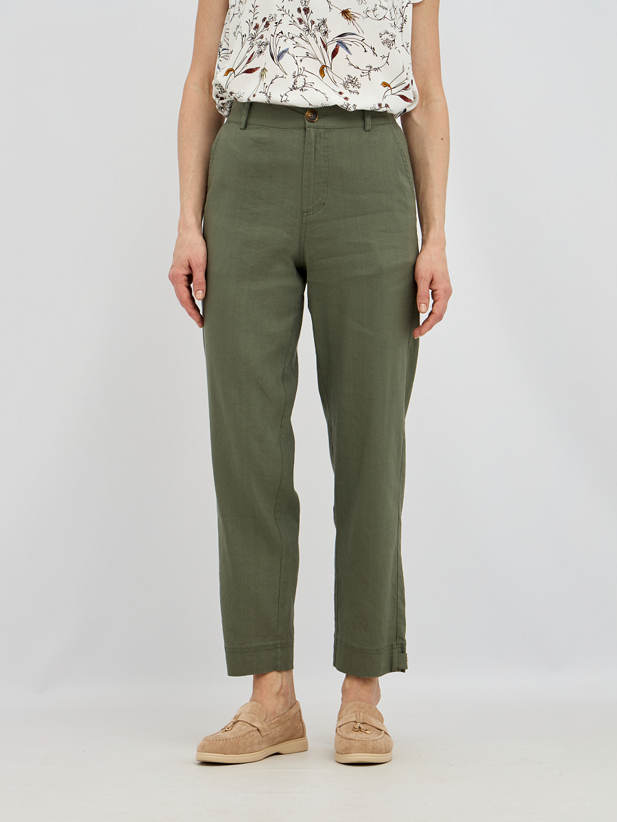 Брюки выполнены из высококачественной смеси льна,района и эластана. Этот состав обеспечивает отличную воздухопроницаемость и терморегуляцию, что делает брюки идеальными для теплого времени года. Добавление эластана придаёт изделию необходимую эластичность, позволяя брюкам идеально сидеть по фигуре и не сковывать движения.