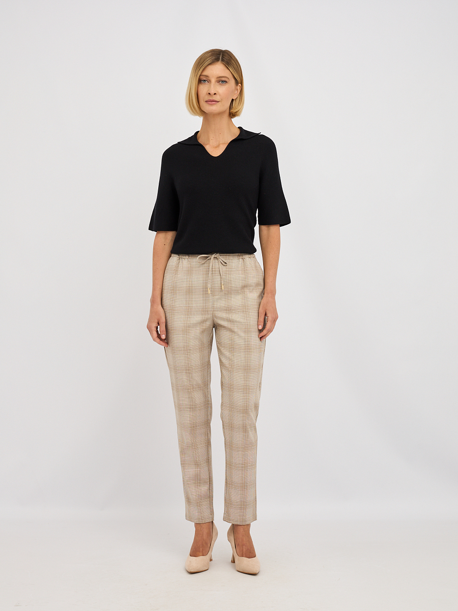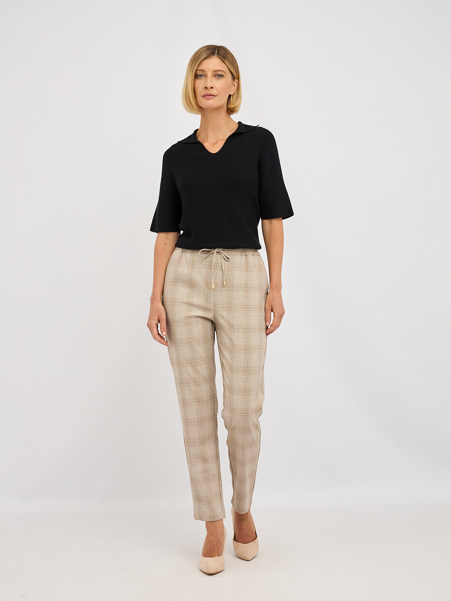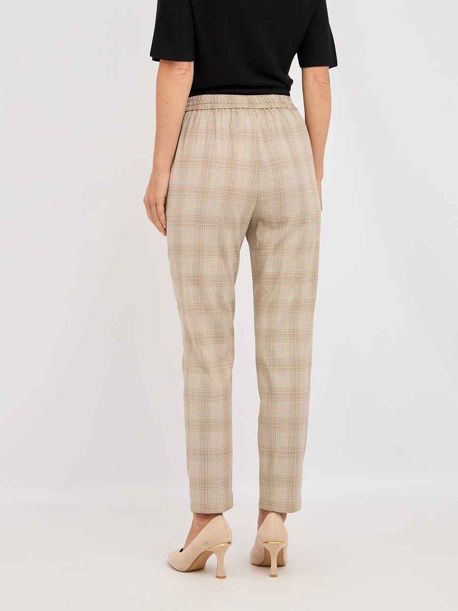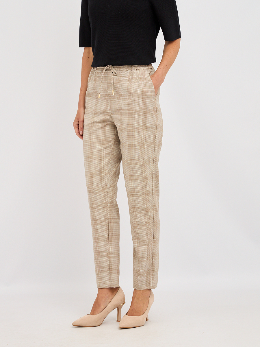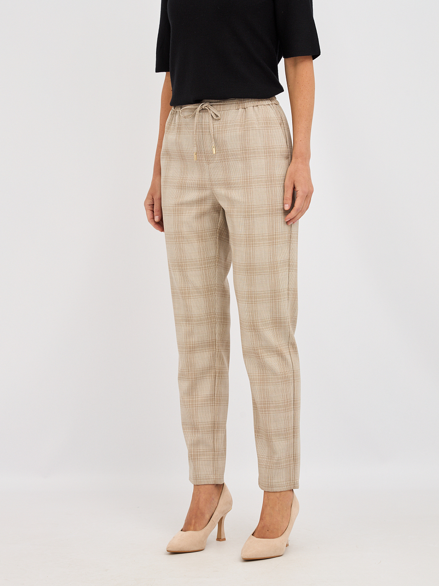 Клетчатый принт придаёт образу стильный и современный вид, а зауженный силуэт подчеркивает линию ног, создавая элегантный силуэт. Эти брюки отлично сочетаются как с классическими блузами, так и с уютными свитерами, что делает их универсальным элементом вашего гардероба.