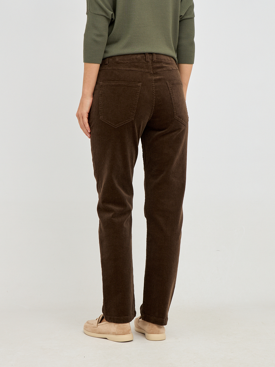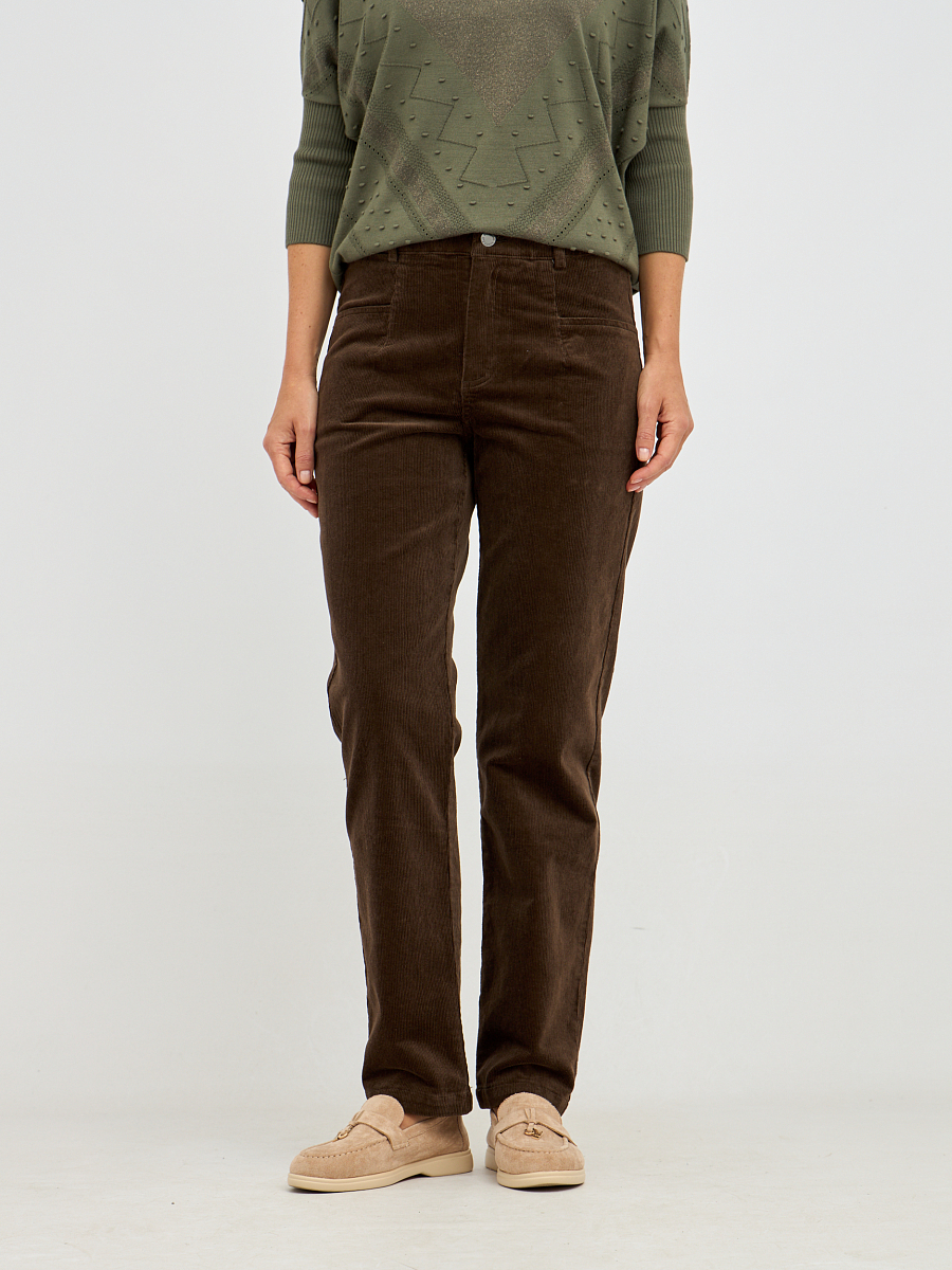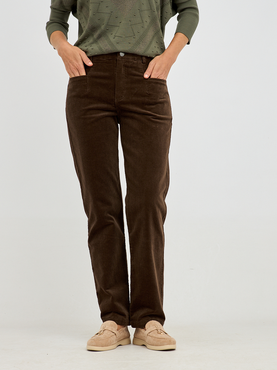 Вельветовая ткань придает изделию особую текстуру и визуальную глубину, создавая эффектный и в то же время уютный образ. Прямой крой брюк универсален и подходит для разных типов фигуры, подчеркивая достоинства и скрывая возможные недостатки. Такие брюки легко комбинируются как с повседневными, так и с более нарядными элементами гардероба.