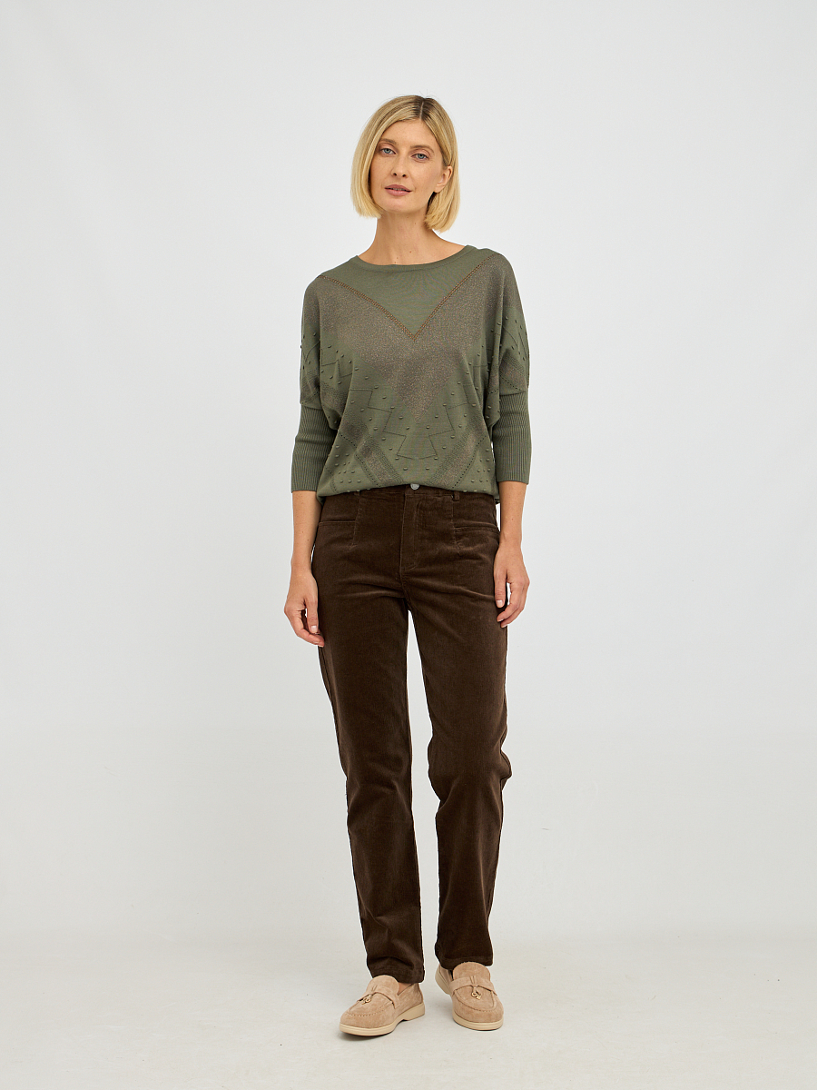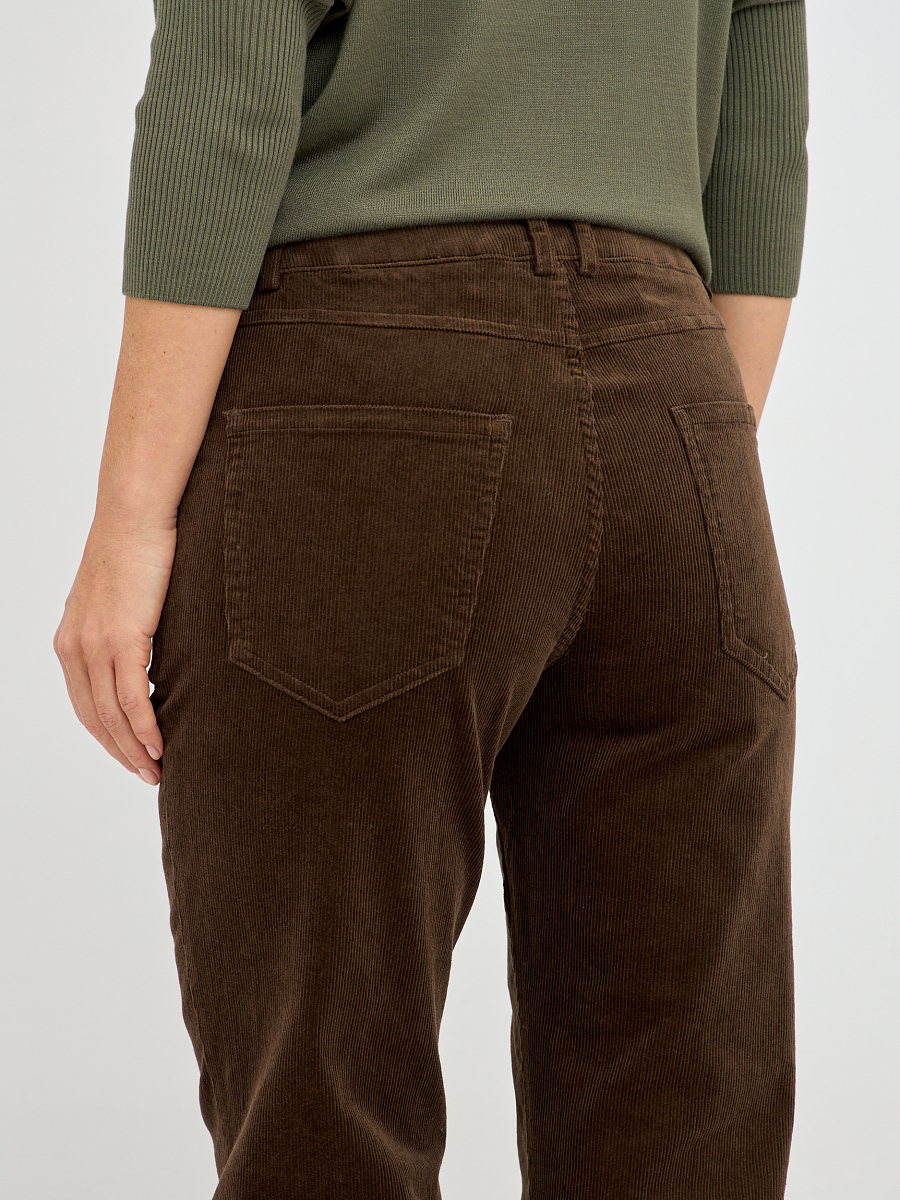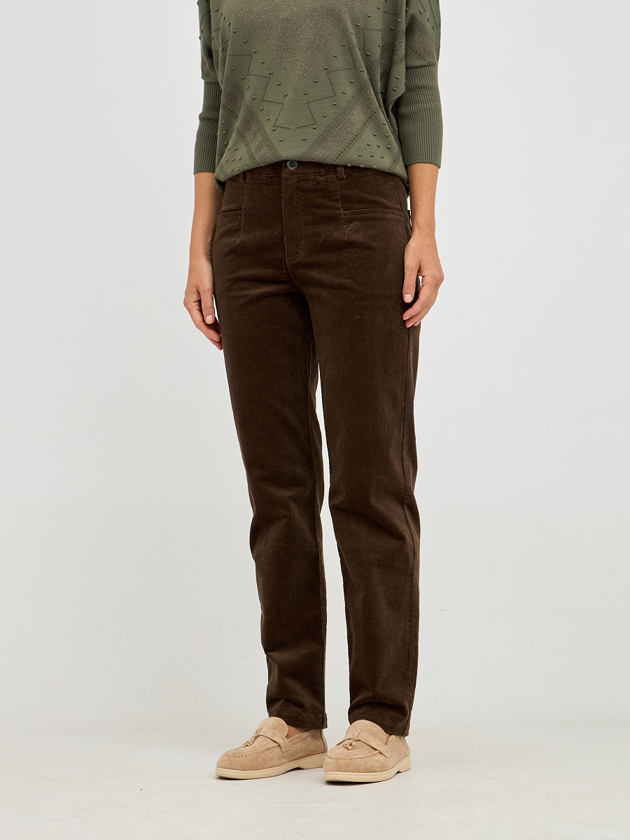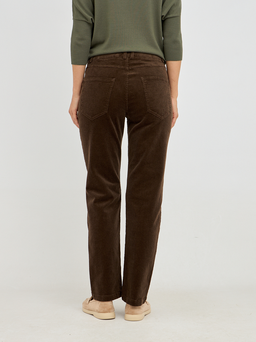 Вельветовая ткань придает изделию особую текстуру и визуальную глубину, создавая эффектный и в то же время уютный образ. Прямой крой брюк универсален и подходит для разных типов фигуры, подчеркивая достоинства и скрывая возможные недостатки. Такие брюки легко комбинируются как с повседневными, так и с более нарядными элементами гардероба.