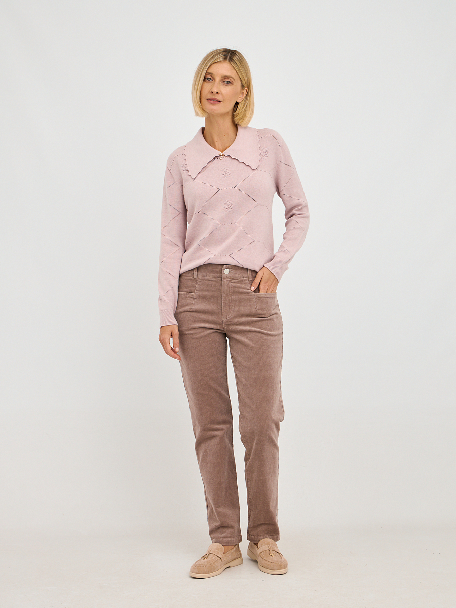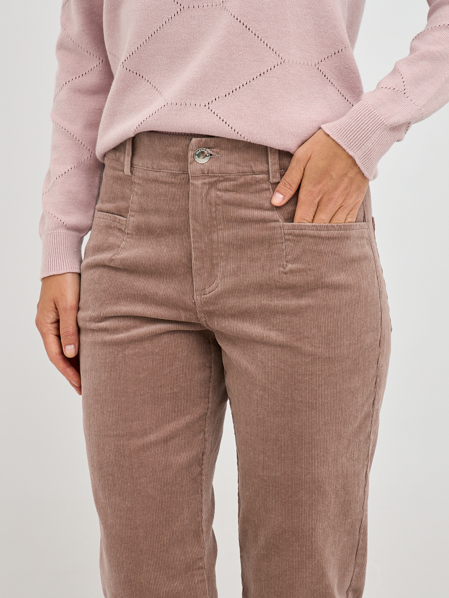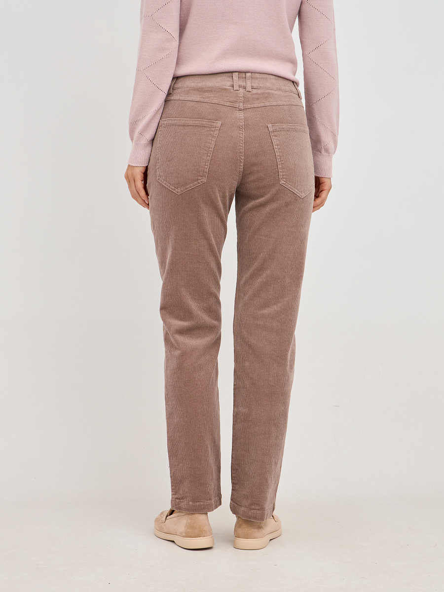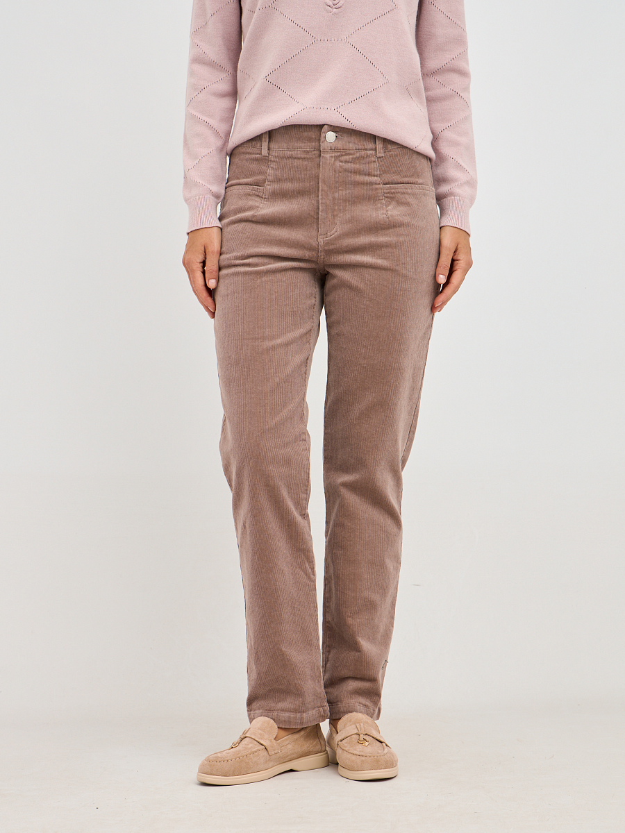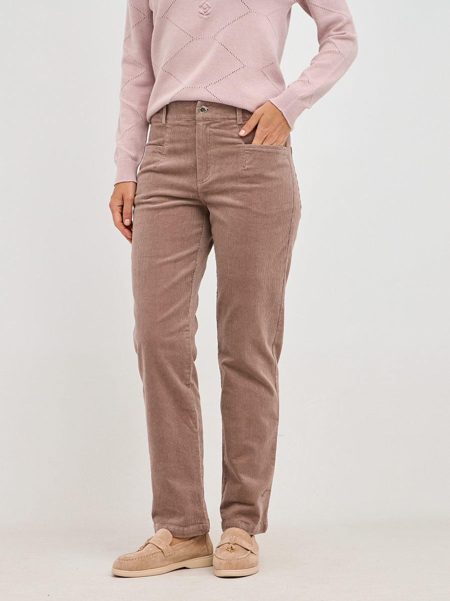 Вельветовая ткань придает изделию особую текстуру и визуальную глубину, создавая эффектный и в то же время уютный образ. Прямой крой брюк универсален и подходит для разных типов фигуры, подчеркивая достоинства и скрывая возможные недостатки. Такие брюки легко комбинируются как с повседневными, так и с более нарядными элементами гардероба.