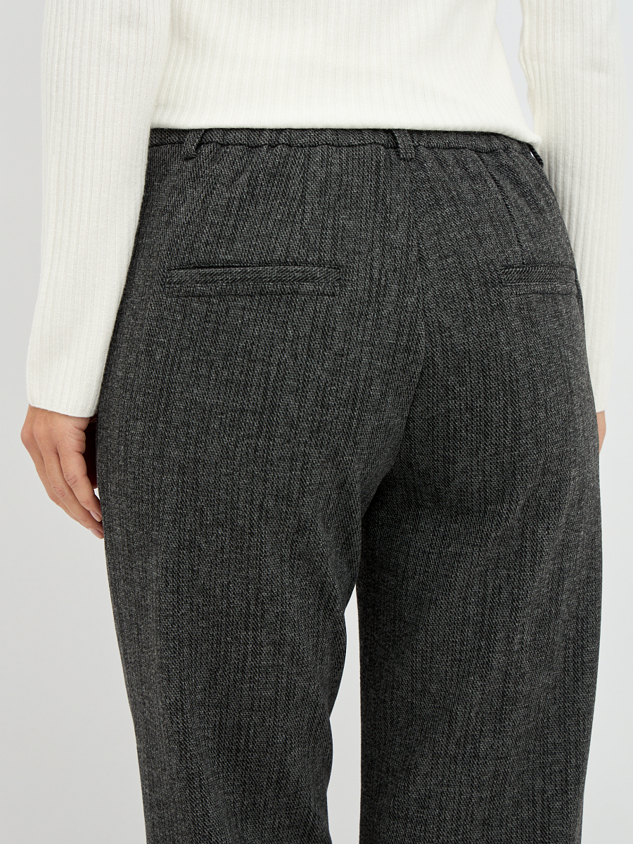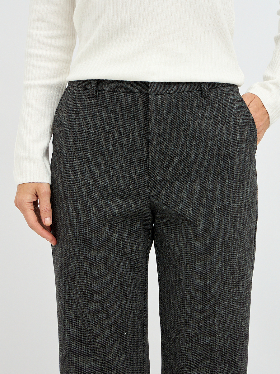 Пояс оснащён шлёвками, что позволяет носить брюки как самостоятельно, так и с ремнём, создавая различное стилистическое решение образа.Брюки застёгиваются на молнию и аккуратную переднюю застёжку, сохраняя лаконичный и строгий вид без лишних деталей.