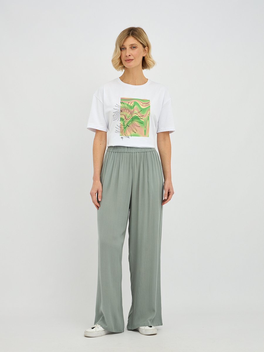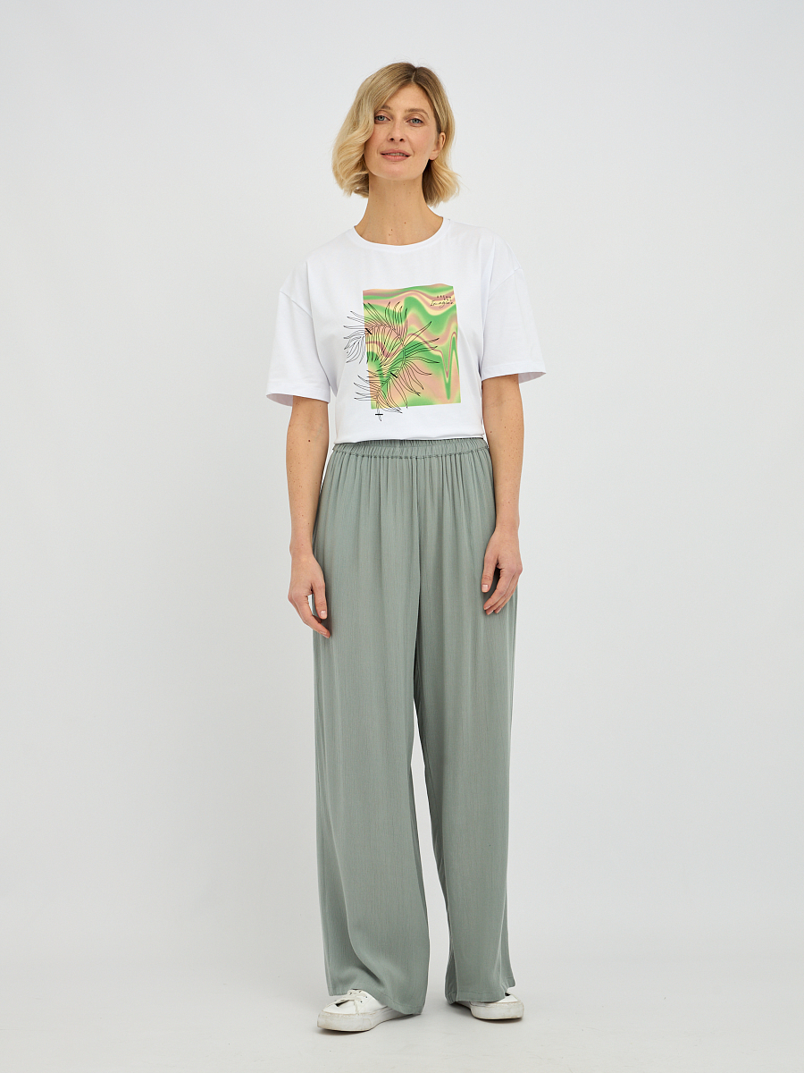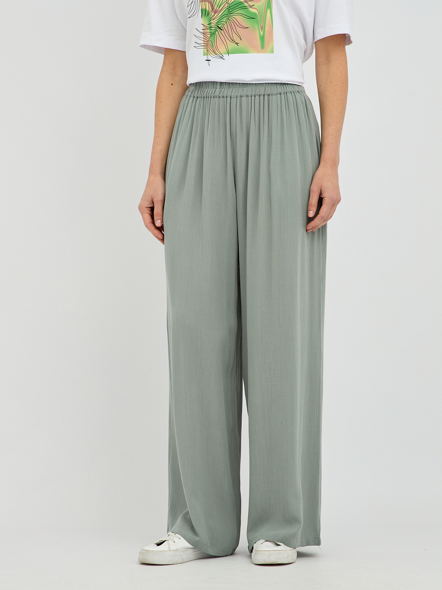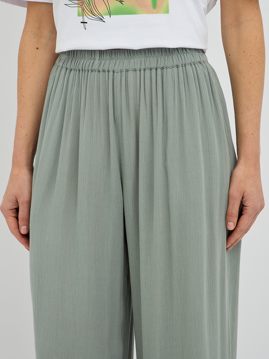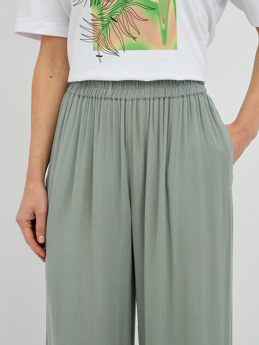 Эти брюки широкого силуэта прекрасно подходят для любого типа фигуры, визуально удлиняя ноги и создавая изящный образ. Свобода движений, которую дарит этот фасон, делает брюки идеальным выбором для прогулок, встреч с друзьями или для отпуска..