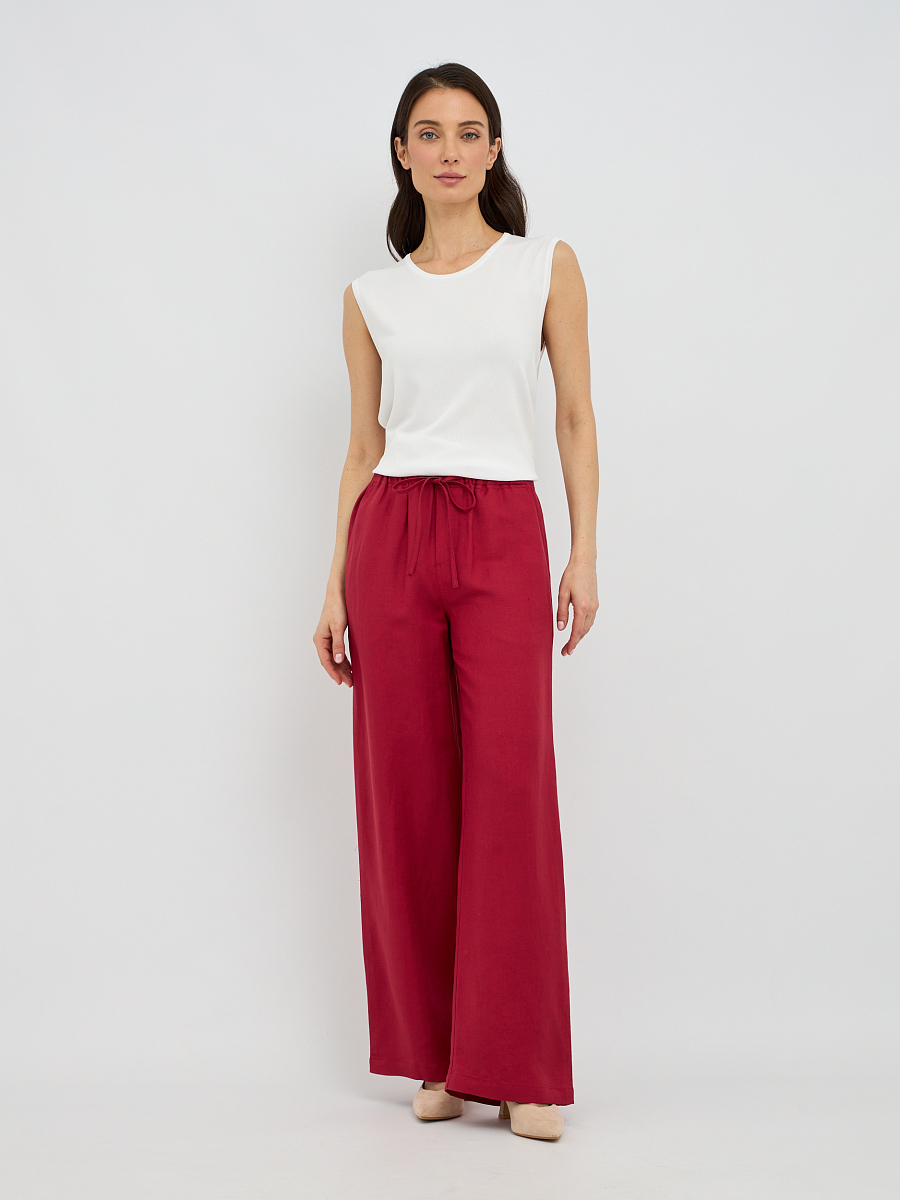 Дизайн брюк продуман до мелочей: широкий клёш от бедра визуально удлиняет ноги и создает женственный силуэт. Пояс на резинке с кулиской обеспечивает идеальную посадку по фигуре, подчеркивая талию и не стесняя движений. Такая деталь добавляет практичности и комфорта, позволяя регулировать посадку по вашему желанию.