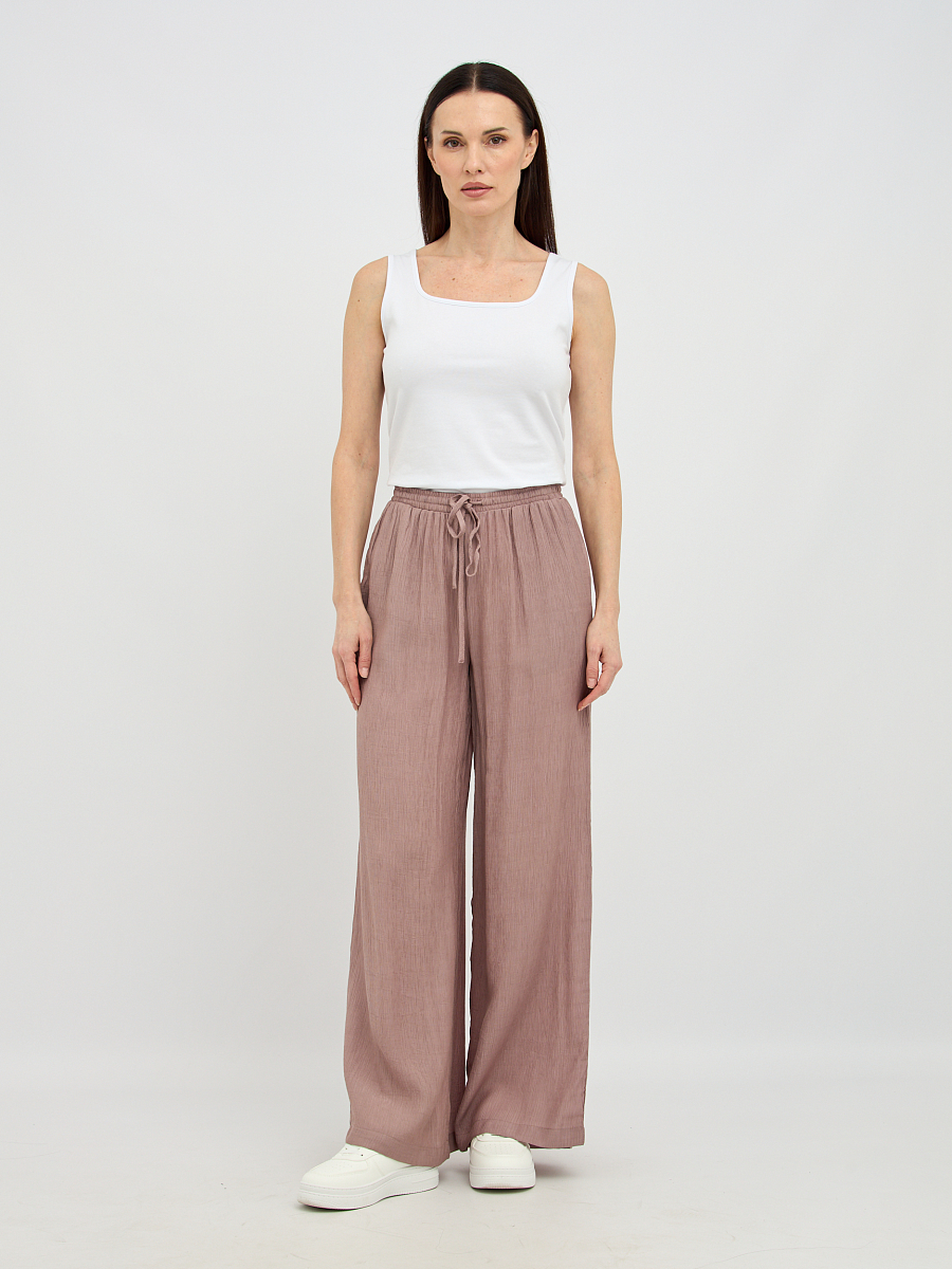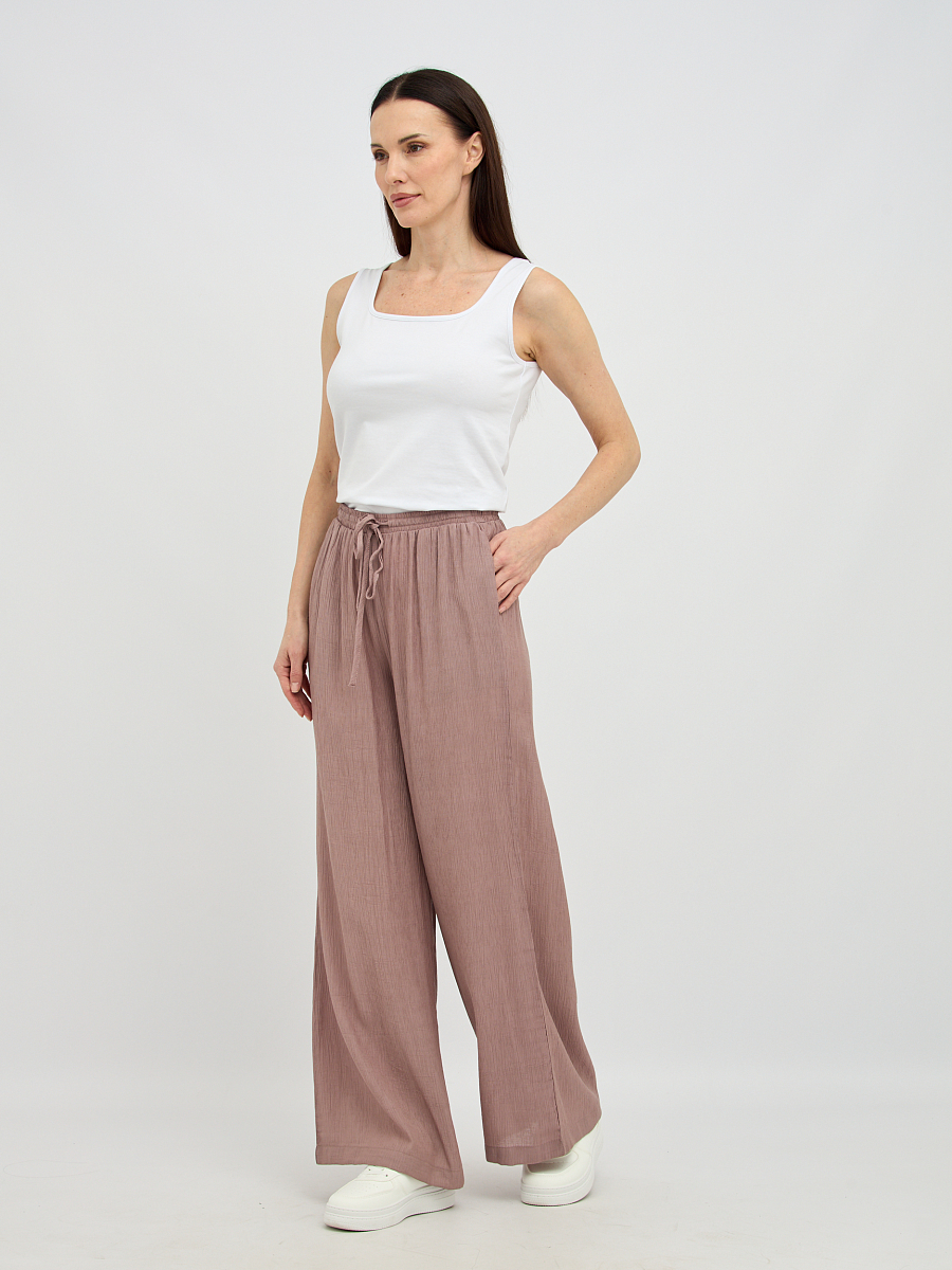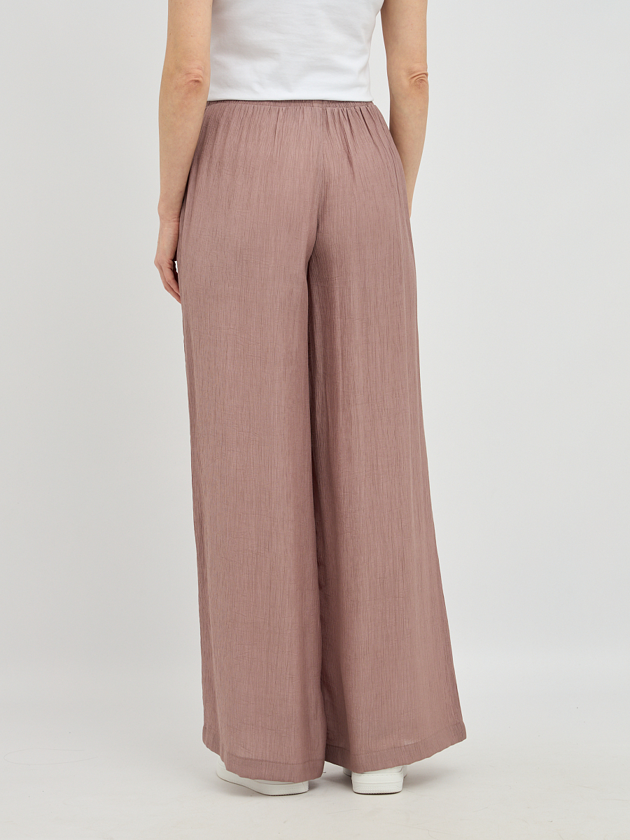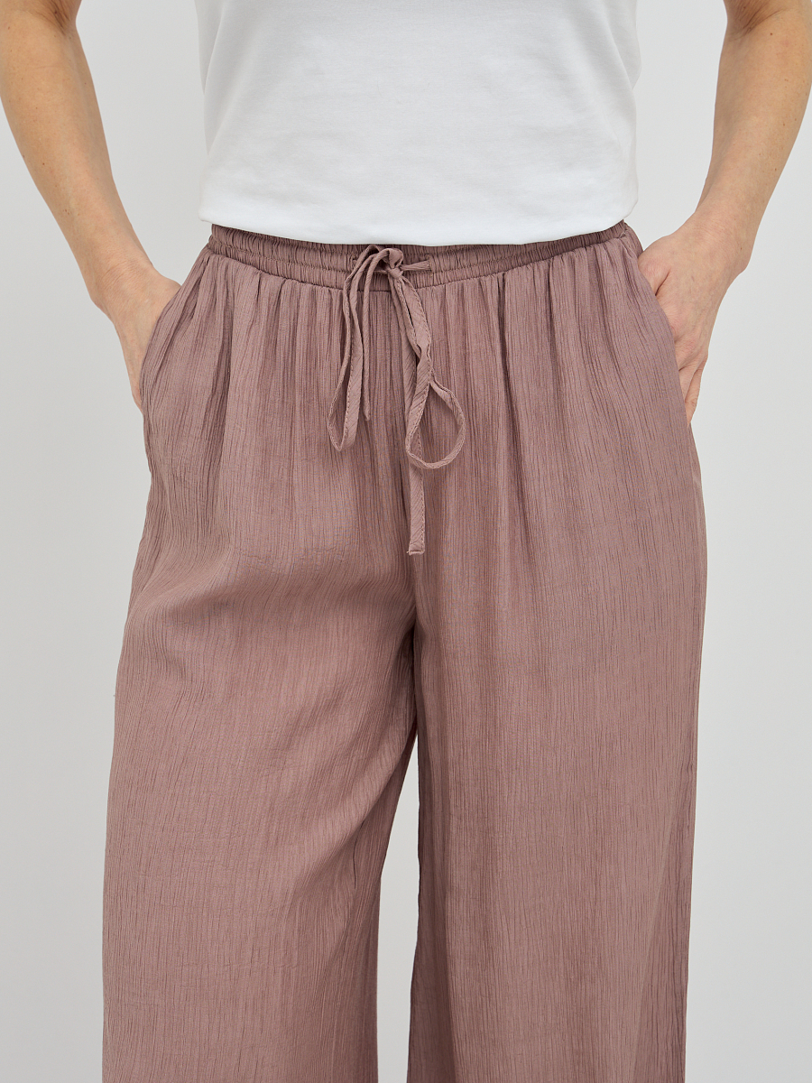 Пояс на резинке обеспечивает непревзойденный комфорт и идеальную посадку по фигуре, не стесняя движений. Свободный силуэт визуально удлиняет ноги и создает непринужденный, но в то же время утонченный образ.