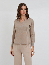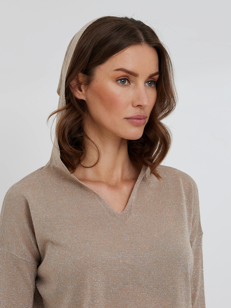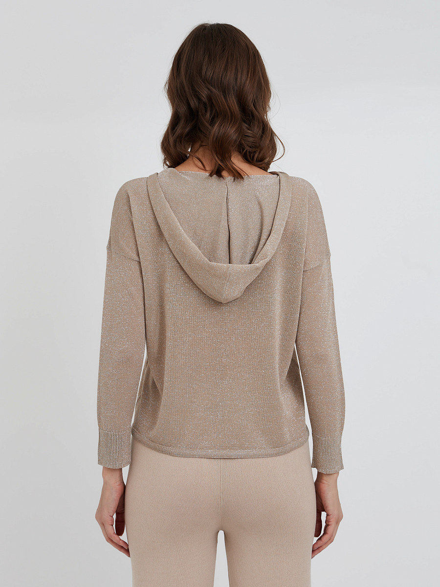 Этот нарядный невесомый джемпер с капюшоном и люрексом добавит романтичности вашему образу. Такой джемпер можно комбинировать как с брюками в спортивном стиле, так и с джинсами или юбкой. К нему отлично подойдут легкие спортивные туфли или кроссовки.