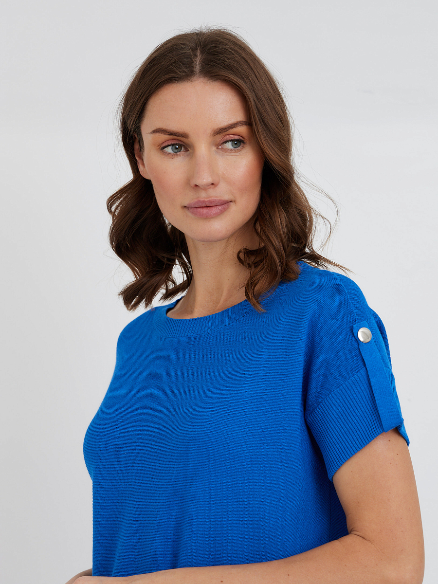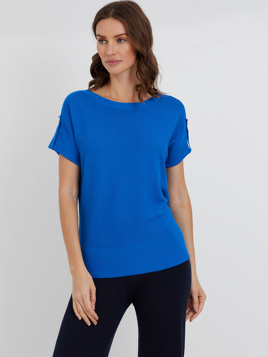 Легкий струящийся джемпер гладкой вязки из вискозы с широким округлым вырезом будет очень кстати в теплый летний день. Однотонный, он хорошо сочетается с различного вида брюками и юбками. К нему легко подобрать аксессуары. Безупречен в качестве предмета повседневного гардероба.