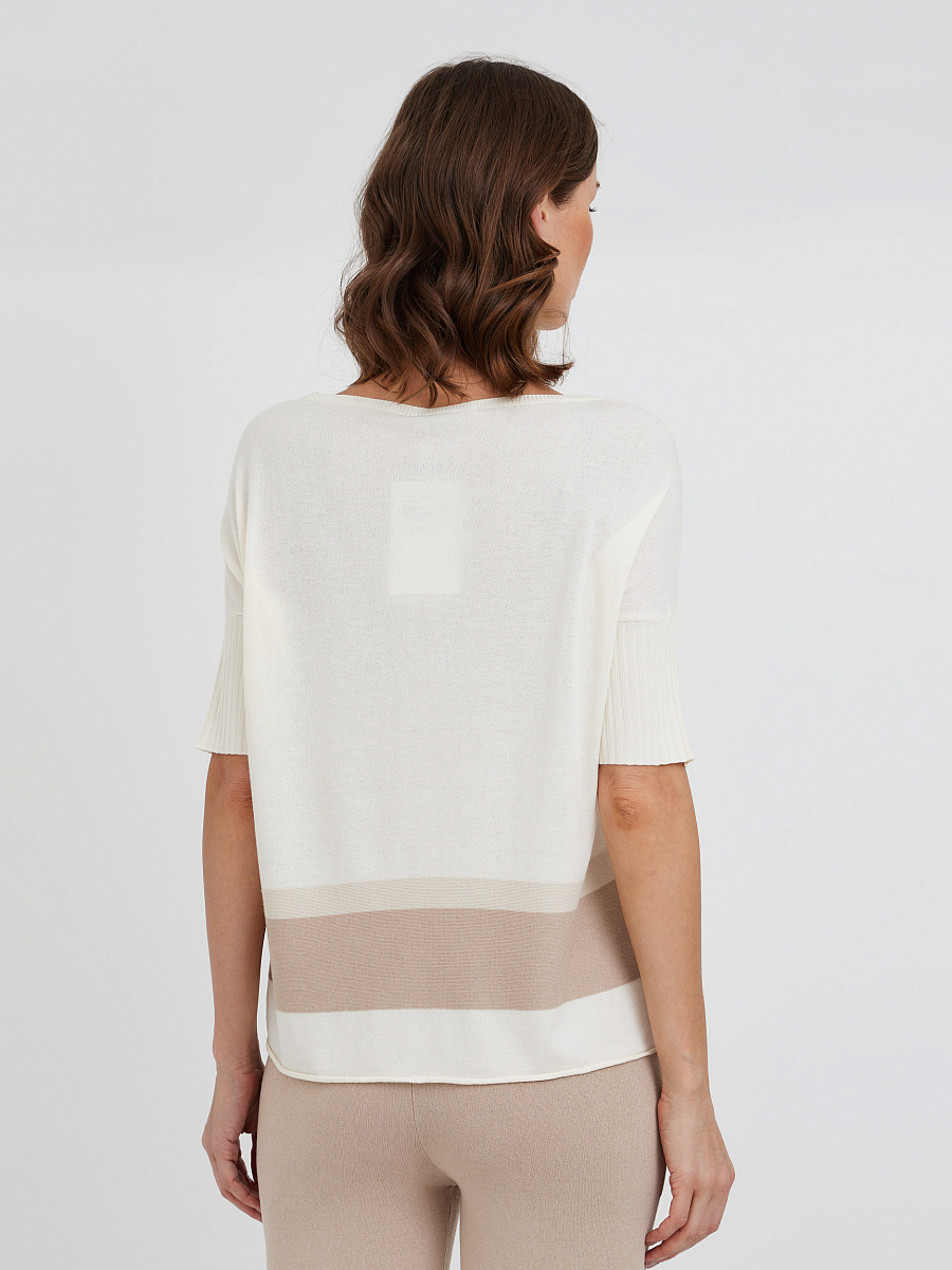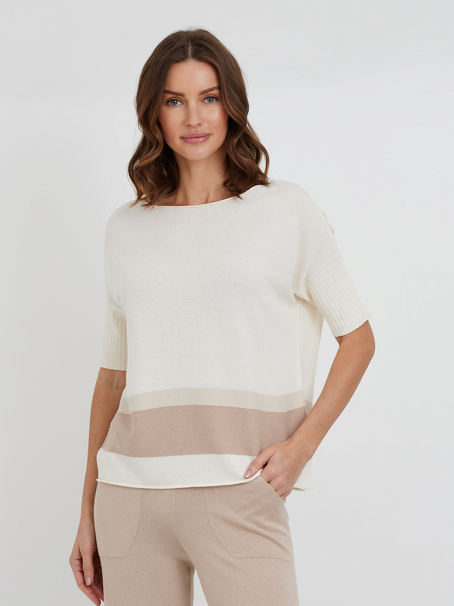 В этом тонком и легком джемпере с широким округлым вырезом свободного кроя будет комфортно в летний день. За счет свободного кроя джемпер отлично продувается и скрывает недостатки фигуры. Прекрасно сочетается с юбками, брюками, джинсами.