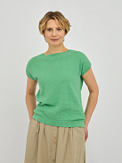 Этот стильный женский джемпер из натурального хлопка станет идеальным дополнением вашего гардероба. Джемпер отличается свободным кроем, что обеспечивает максимальный комфорт и свободу движений. Укороченные рукава придают изделию современный и легкий вид, а манжеты на рукавах и по низу джемпера добавляют изысканности и завершенности образу.