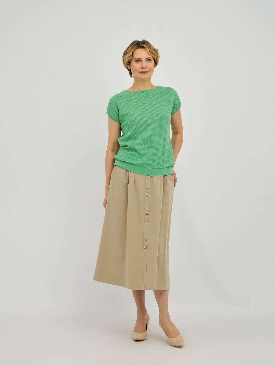 Натуральный хлопок обеспечивает отличную воздухопроницаемость и приятные тактильные ощущения, что делает этот джемпер идеальным выбором для любого времени года. Вы можете сочетать его с джинсами, юбками или шортами, создавая разнообразные образы для повседневной жизни или особых случаев.