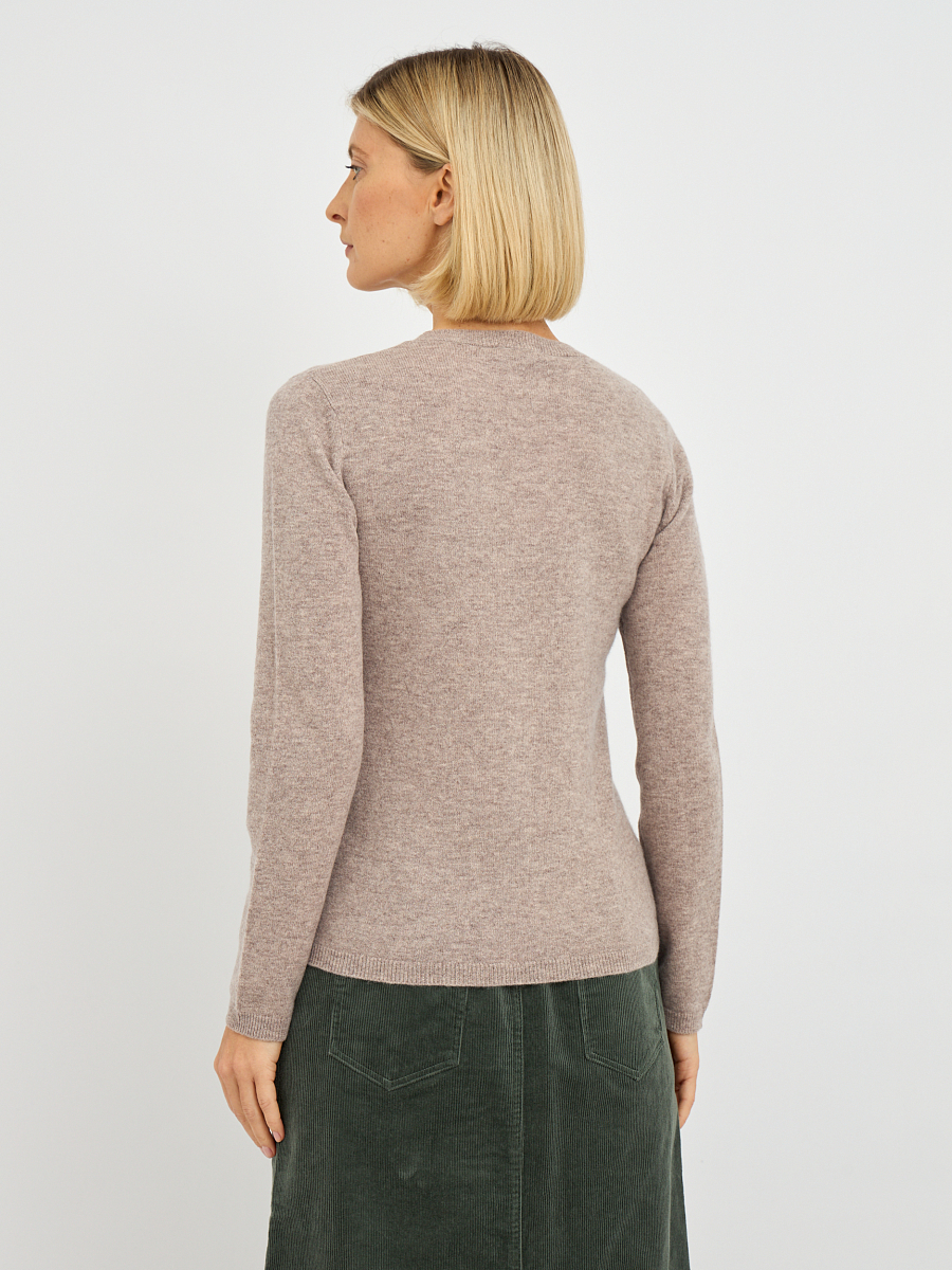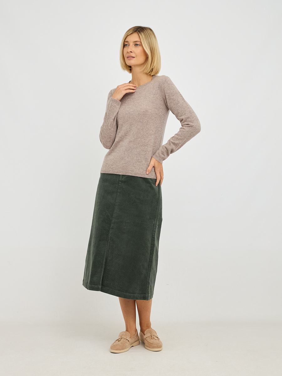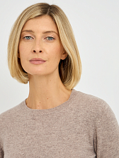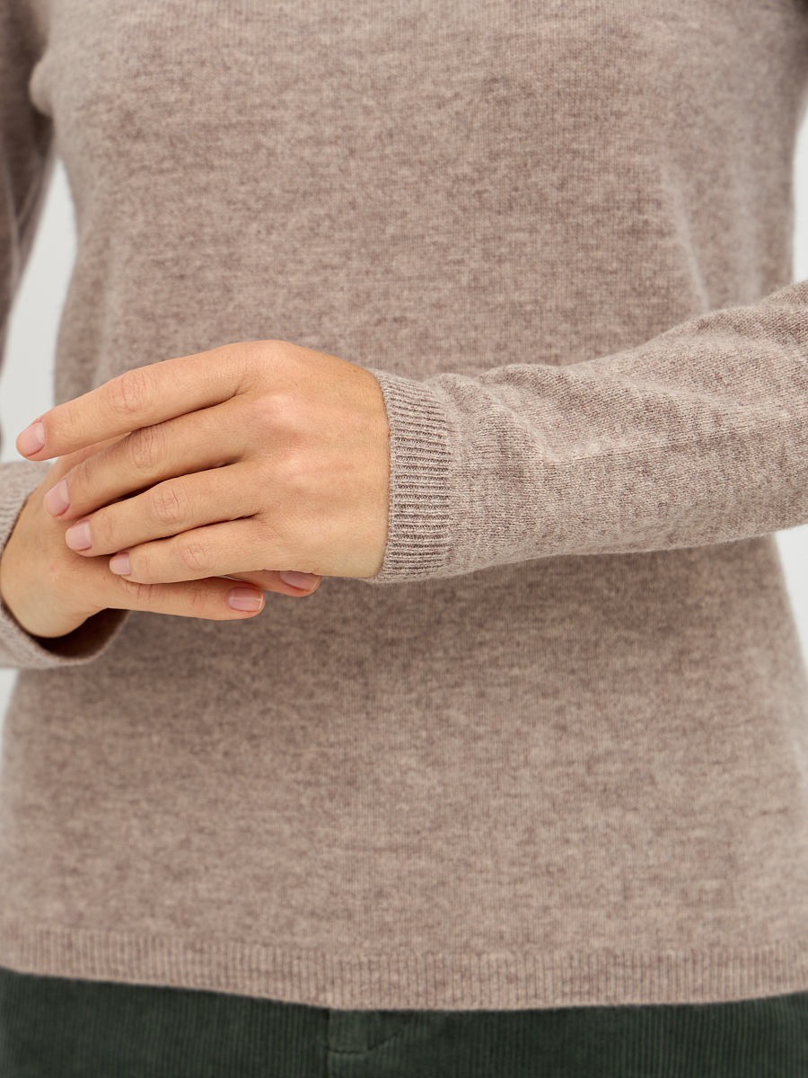 Полуприталенный силуэт джемпера подчеркивает женственность и элегантность, создавая гармоничный образ.