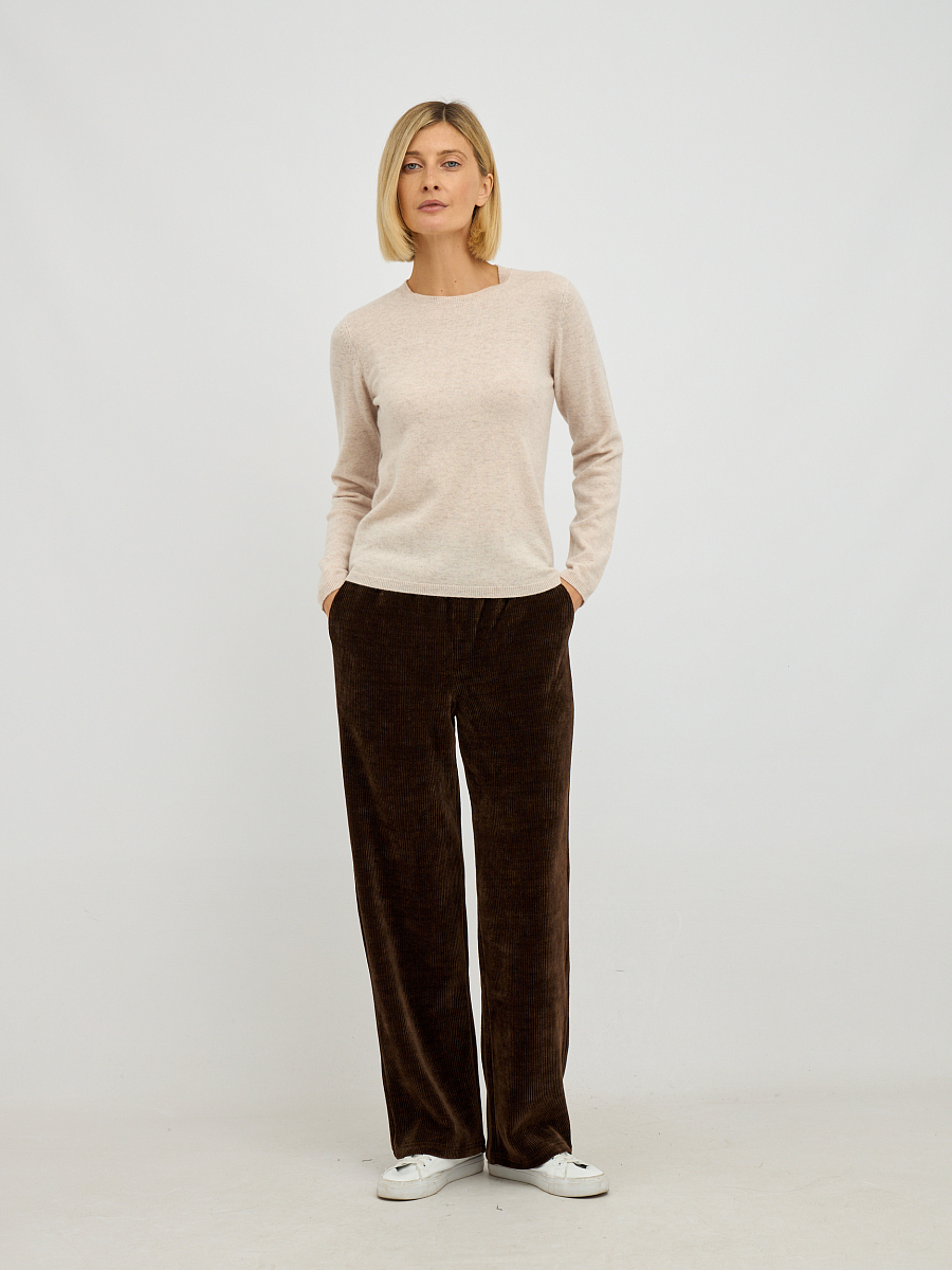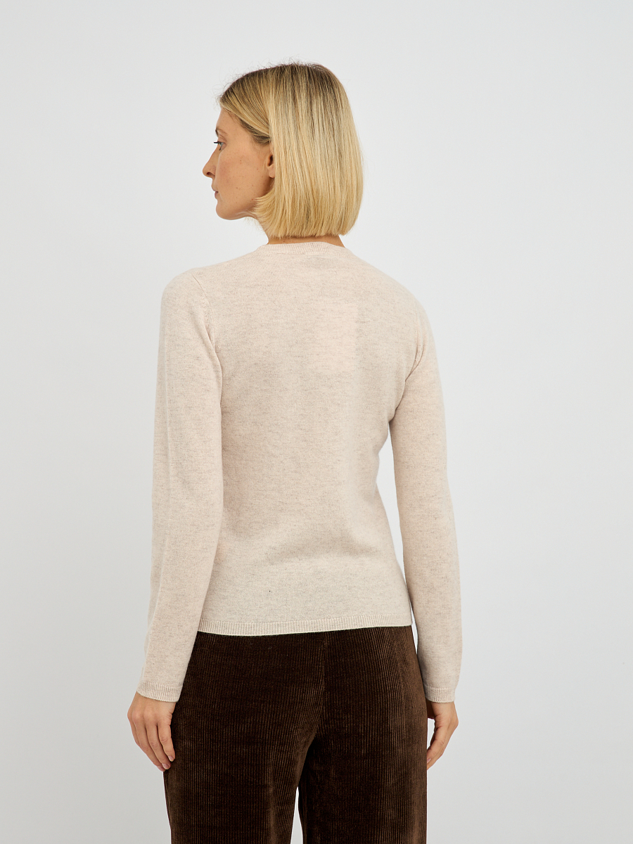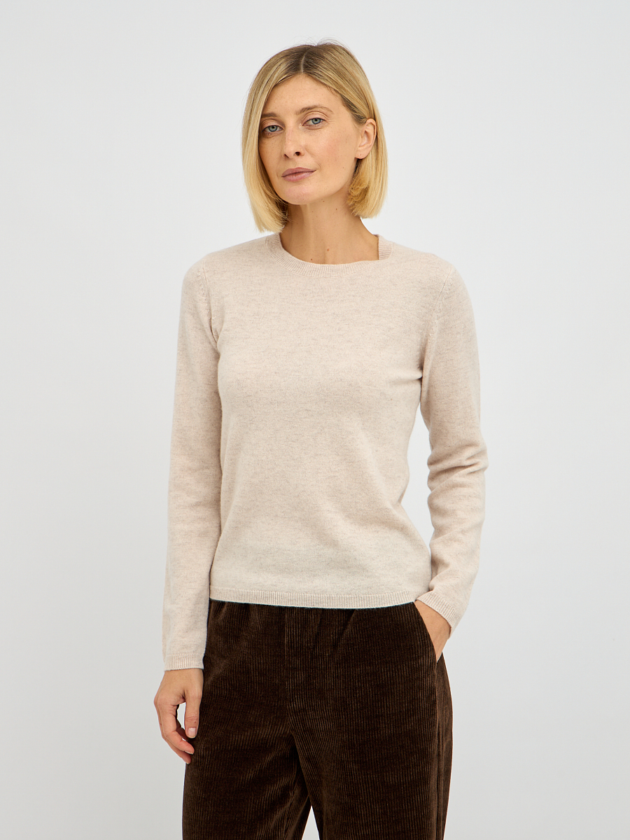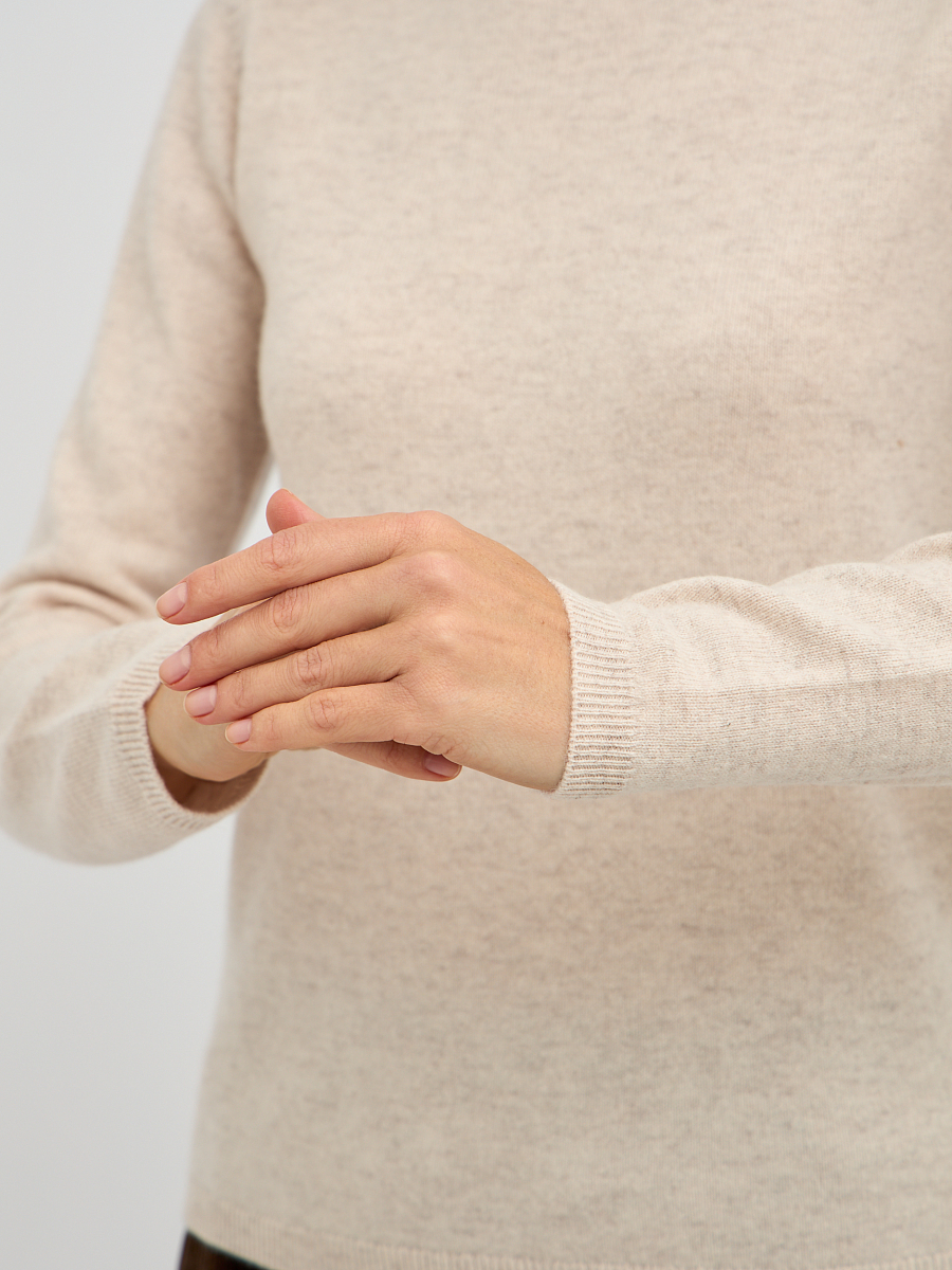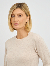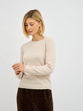 Полуприталенный силуэт джемпера подчеркивает женственность и элегантность, создавая гармоничный образ.