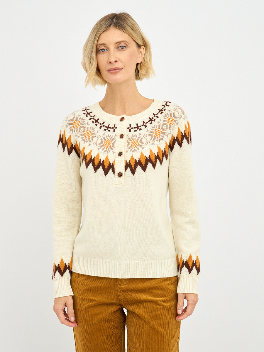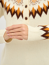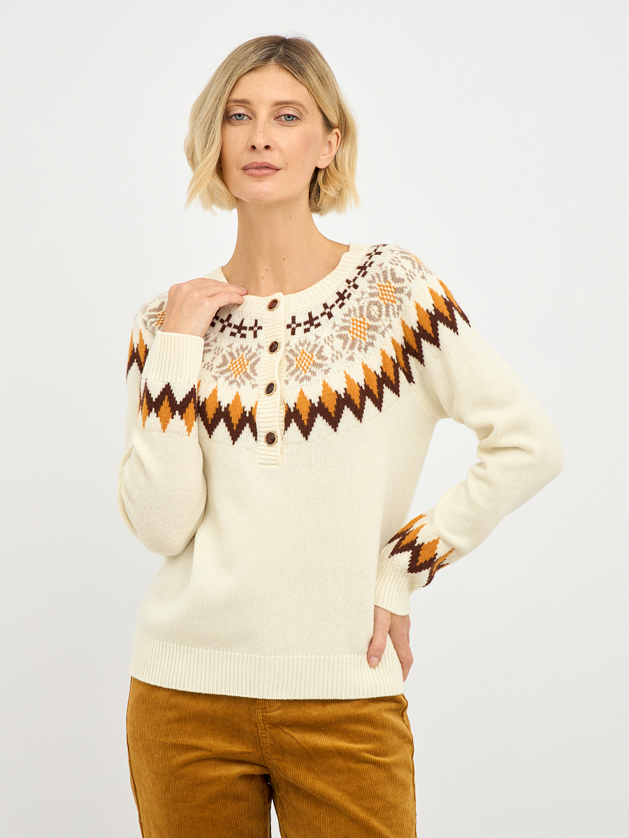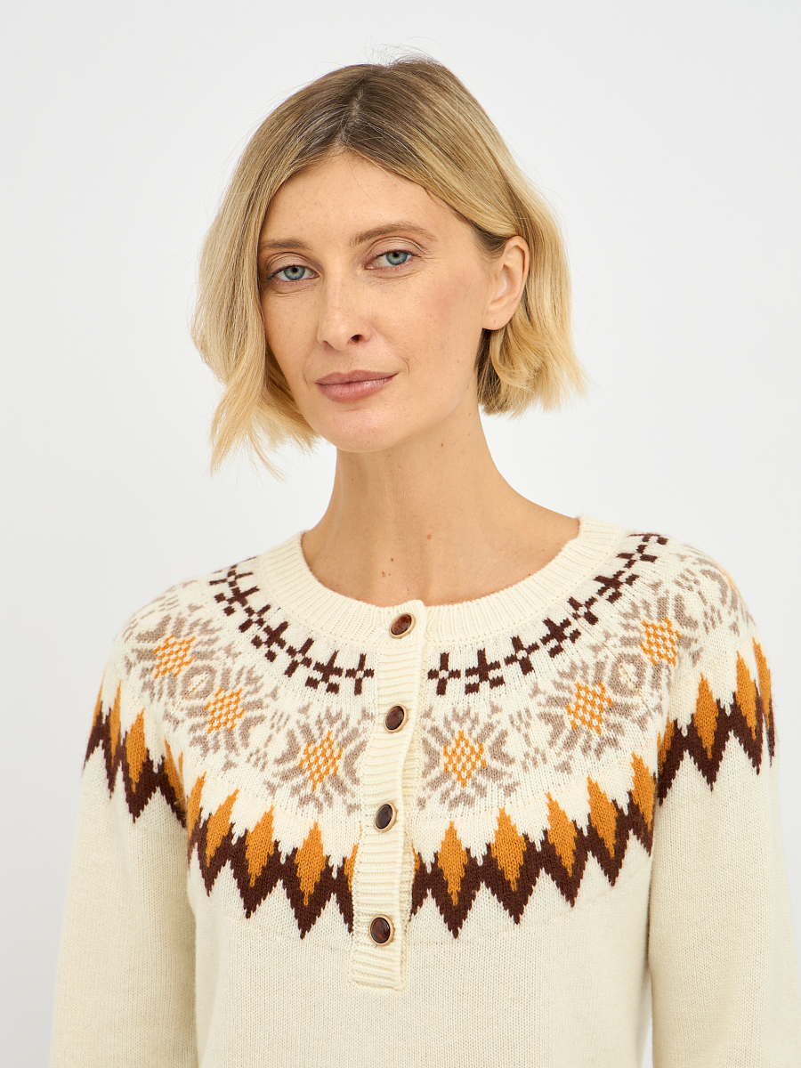 Джемпер выполнен в нежном молочном оттенке, который прекрасно подчеркивает женственность и легкость образа. Яркий орнамент добавляет динамики и индивидуальности, делая его настоящим акцентом вашего образа. Контрастные пуговицы, аккуратно вписанные в общий дизайн, придают джемперу игривость и оригинальность.
