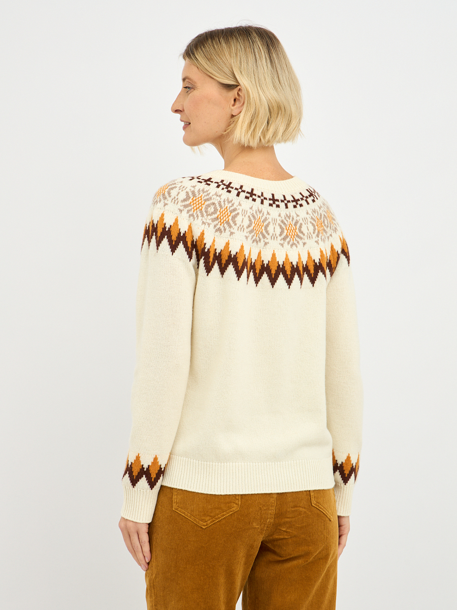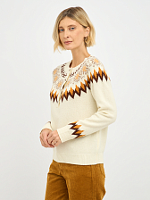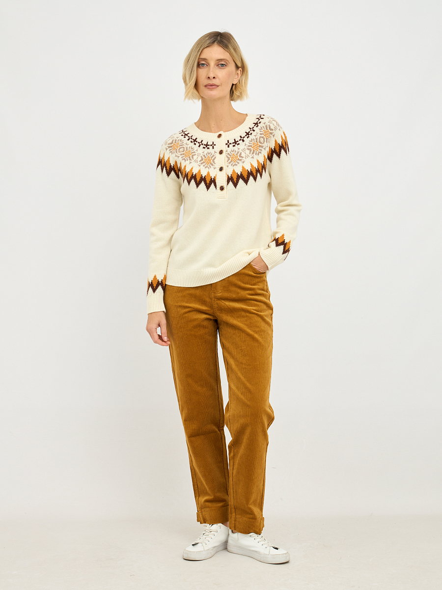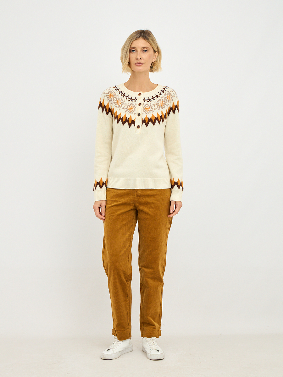 Джемпер выполнен в нежном молочном оттенке, который прекрасно подчеркивает женственность и легкость образа. Яркий орнамент добавляет динамики и индивидуальности, делая его настоящим акцентом вашего образа. Контрастные пуговицы, аккуратно вписанные в общий дизайн, придают джемперу игривость и оригинальность.