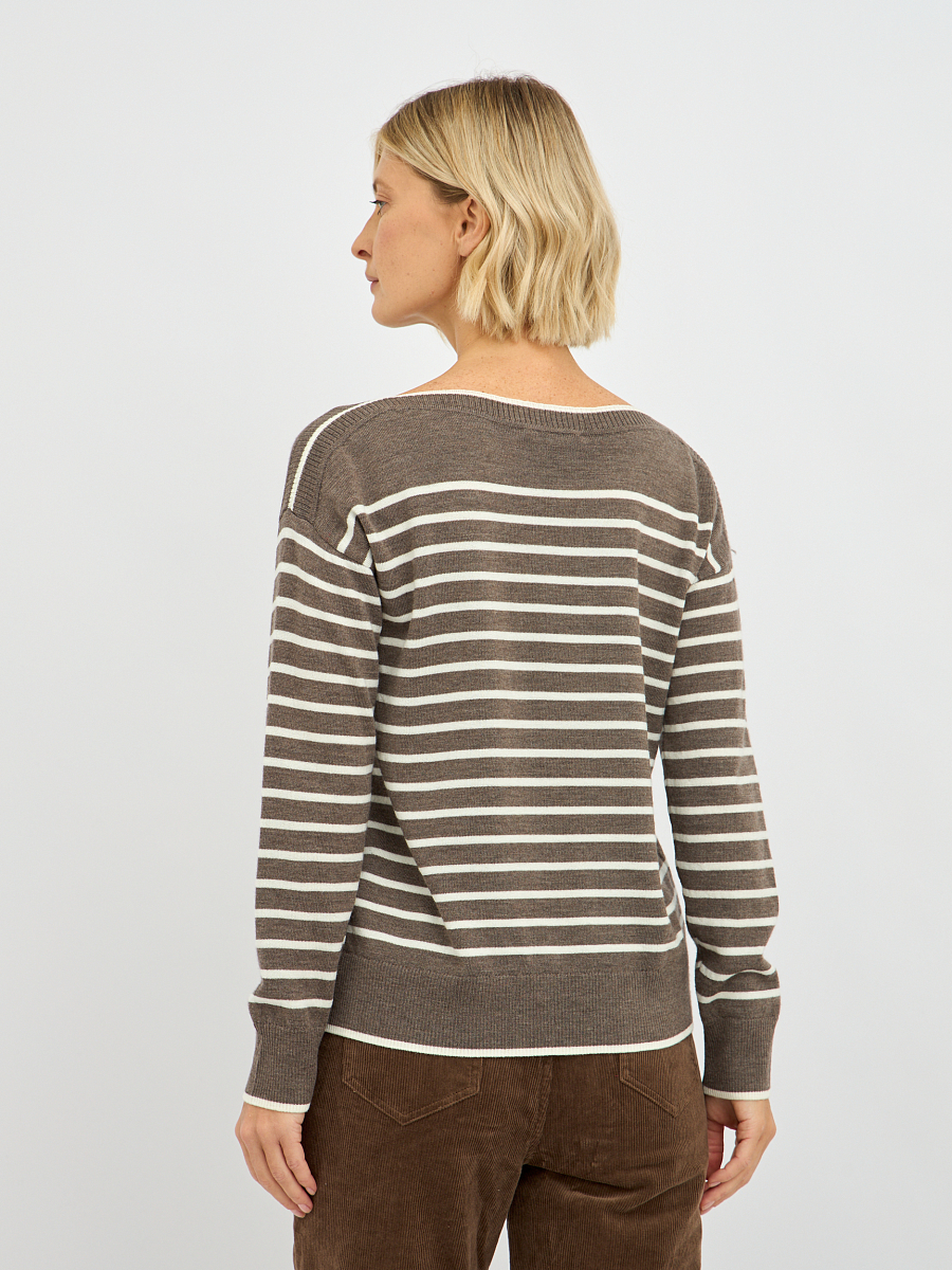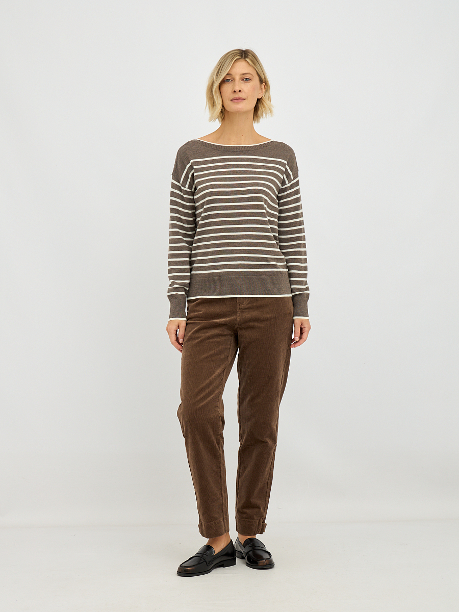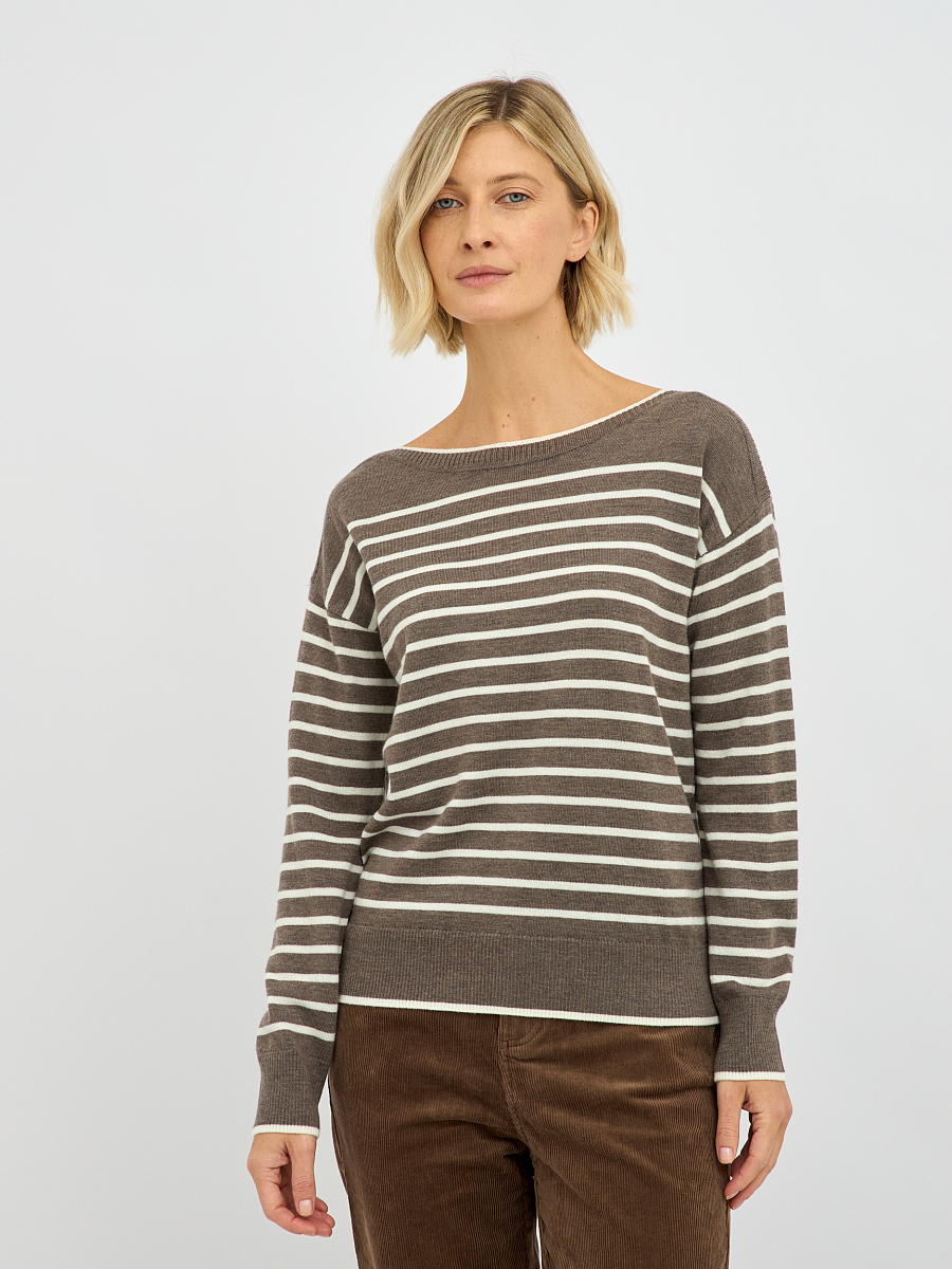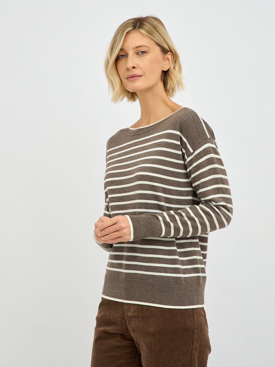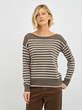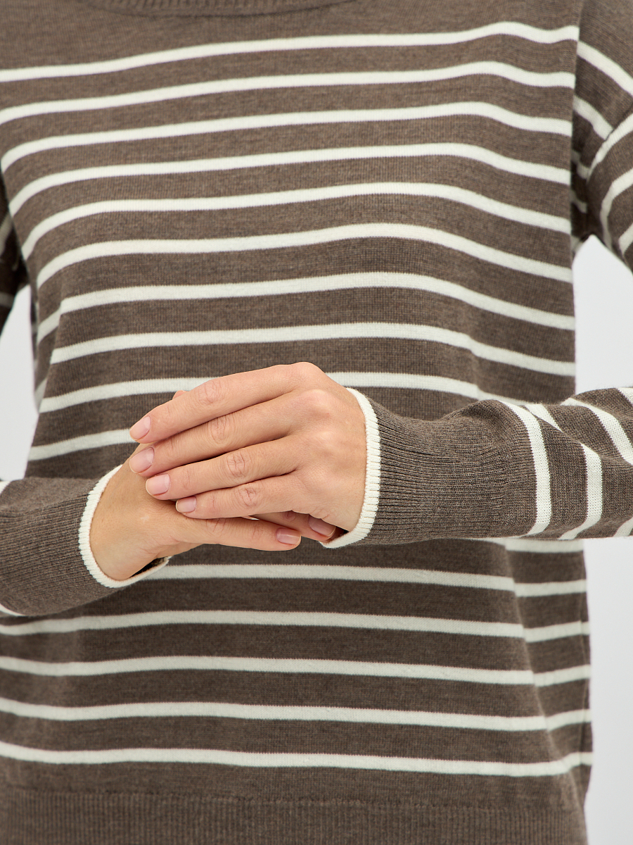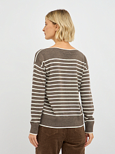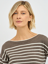 Дизайн этого джемпера выполнен в классическом стиле, подчеркивающем женственность и изящество. Оригинальный принт в горизонтальную полоску, выполненный в контрастных оттенках, придает изделию динамичность и визуально стройнит силуэт. Широкий, слегка спущенный вырез лодочкой мягко обрамляет шею и ключицы, добавляя образу нотку непринужденной элегантности. Длинные рукава и аккуратная резинка по низу изделия обеспечивают идеальную посадку и комфорт при движении.