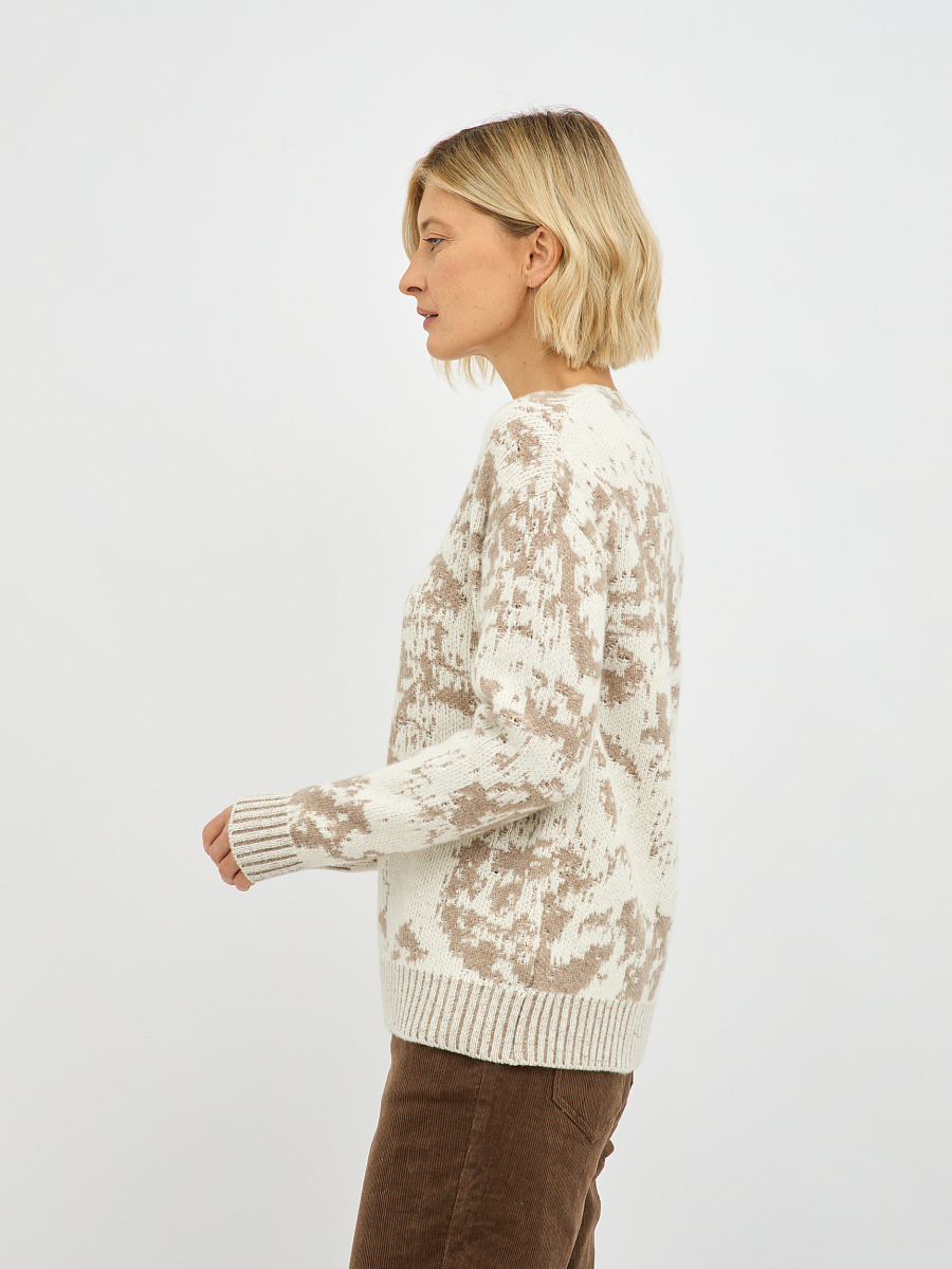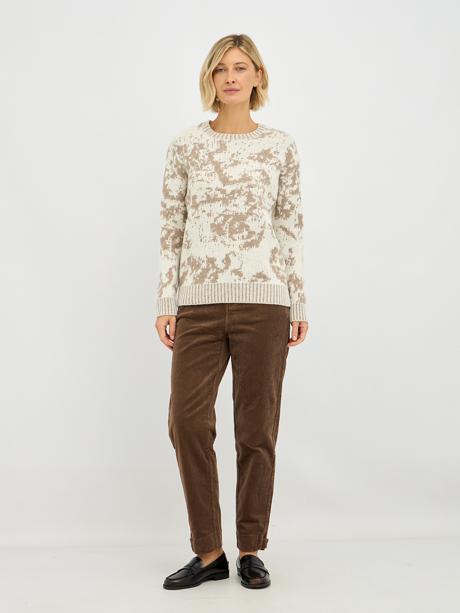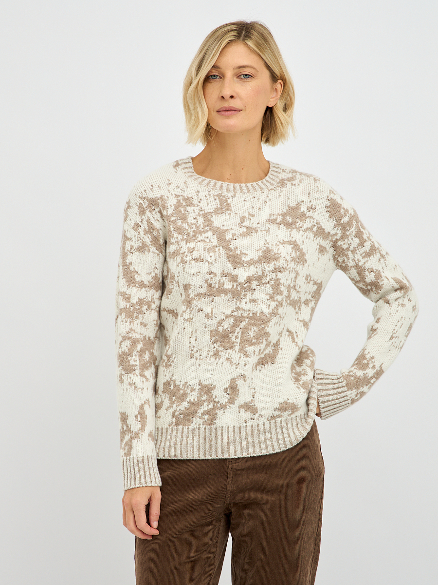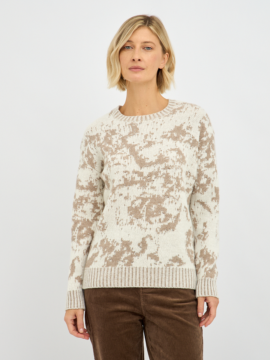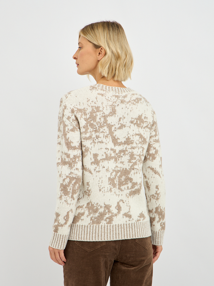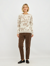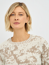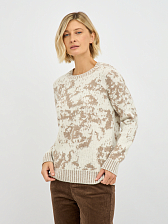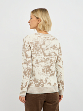 Дизайн джемпера очаровывает своим уникальным абстрактным принтом, напоминающим нежные разводы акварели, создавая неповторимый и притягательный образ. Светлая, кремовая основа прекрасно гармонирует с бежевыми вкраплениями, добавляя глубину и элегантность. Классический круглый вырез горловины и длинные рукава делают его универсальным элементом гардероба, который легко впишется в любой стиль. Аккуратная, эластичная резинка по низу изделия и на манжетах обеспечивает идеальную посадку и предотвращает потерю формы.