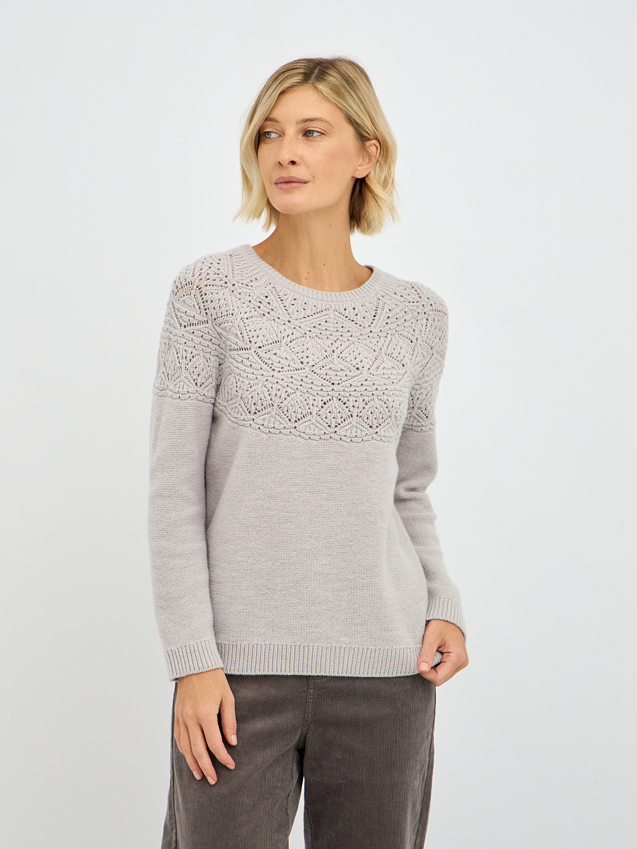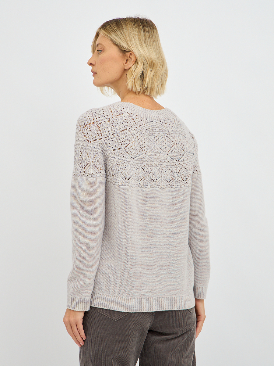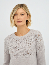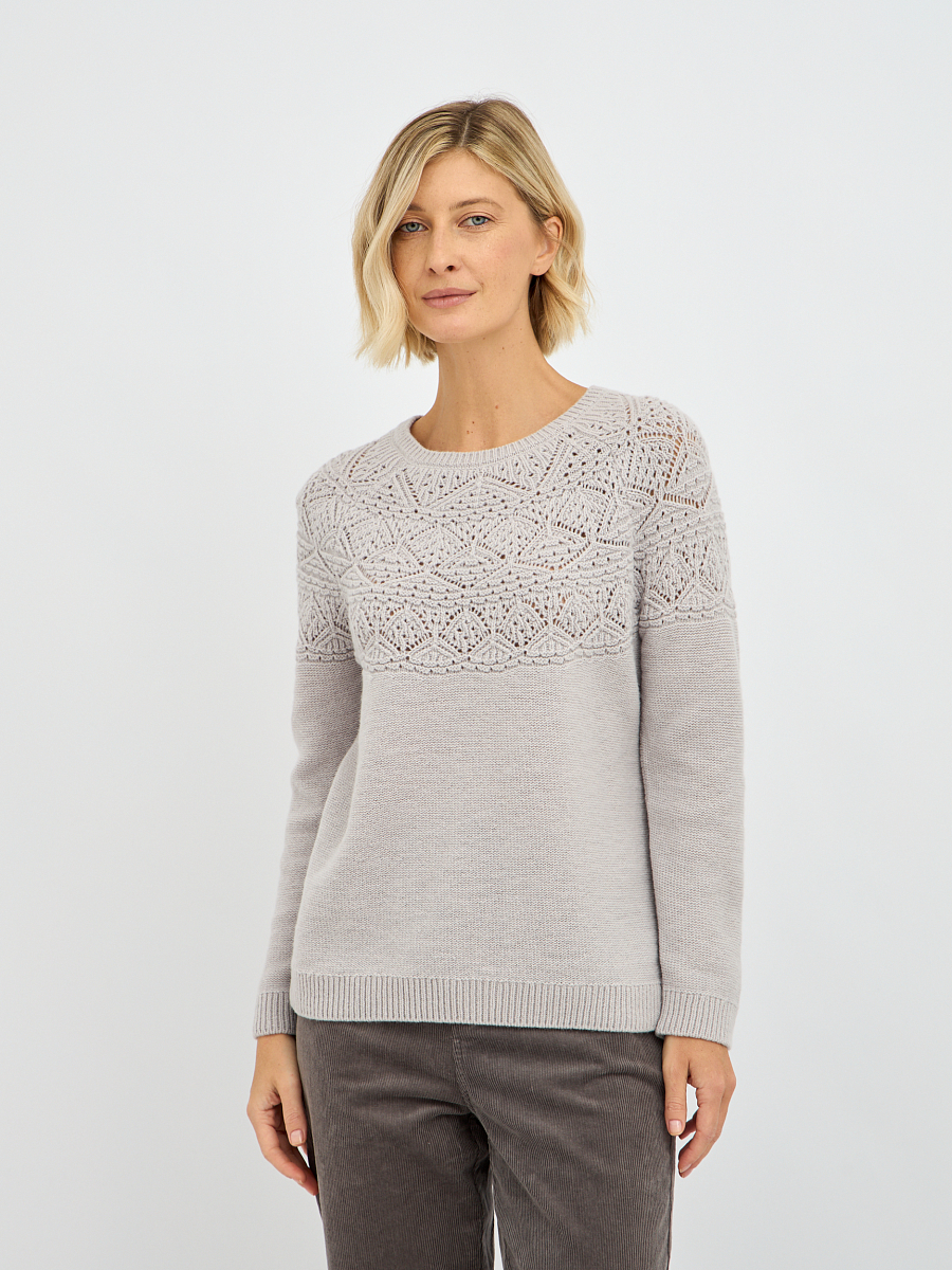 Этот элегантный джемпер сочетает в себе нежность шерсти и практичность полиамида. Верхняя часть выполнена в виде изящного ажурного узора, который придаёт модели женственность и лёгкость, а нижняя — из гладкой трикотажной вязки, создающей аккуратный и современный силуэт. Мягкие манжеты и аккуратная резинка по низу обеспечивают комфортную посадку.