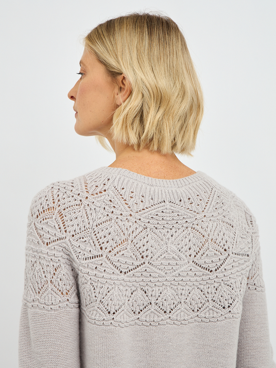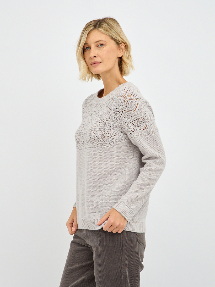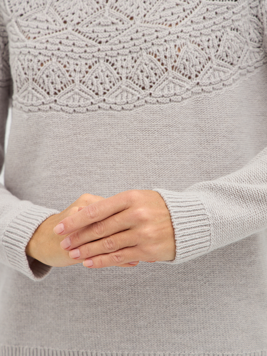 Этот элегантный джемпер сочетает в себе нежность шерсти и практичность полиамида. Верхняя часть выполнена в виде изящного ажурного узора, который придаёт модели женственность и лёгкость, а нижняя — из гладкой трикотажной вязки, создающей аккуратный и современный силуэт. Мягкие манжеты и аккуратная резинка по низу обеспечивают комфортную посадку.