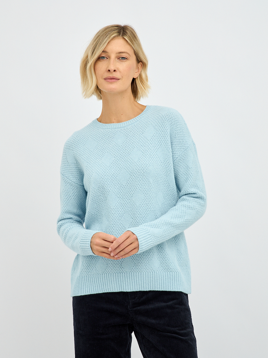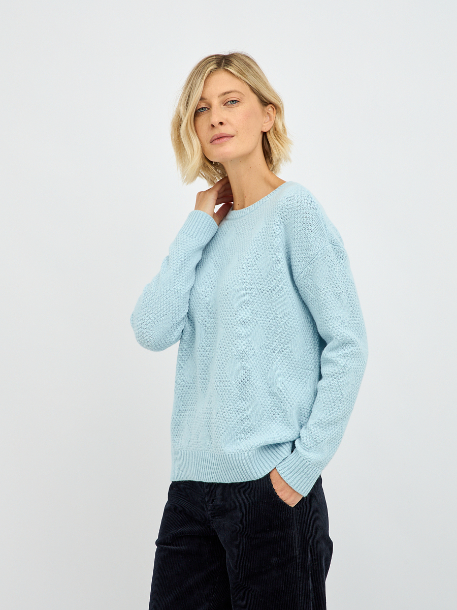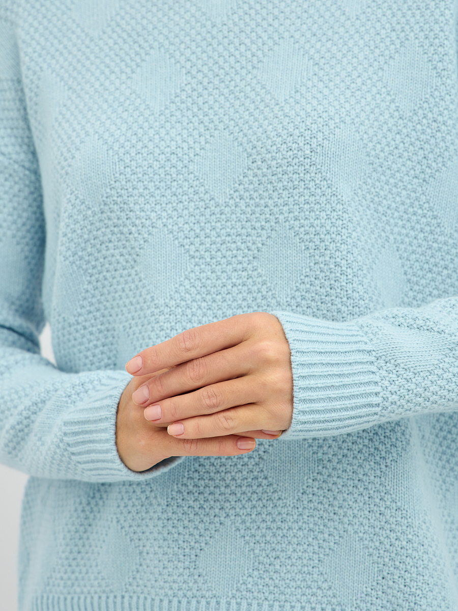 Легкий, воздушный небесно-голубой оттенок джемпера придает ему особую нежность и свежесть. Этот цвет легко сочетается с различными оттенками, от нейтральных до более ярких, позволяя создавать разнообразные образы.