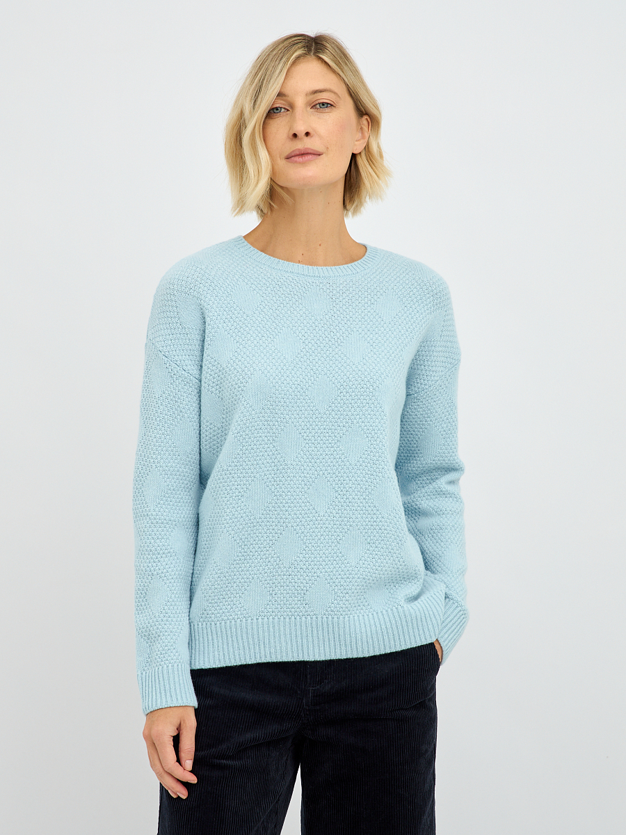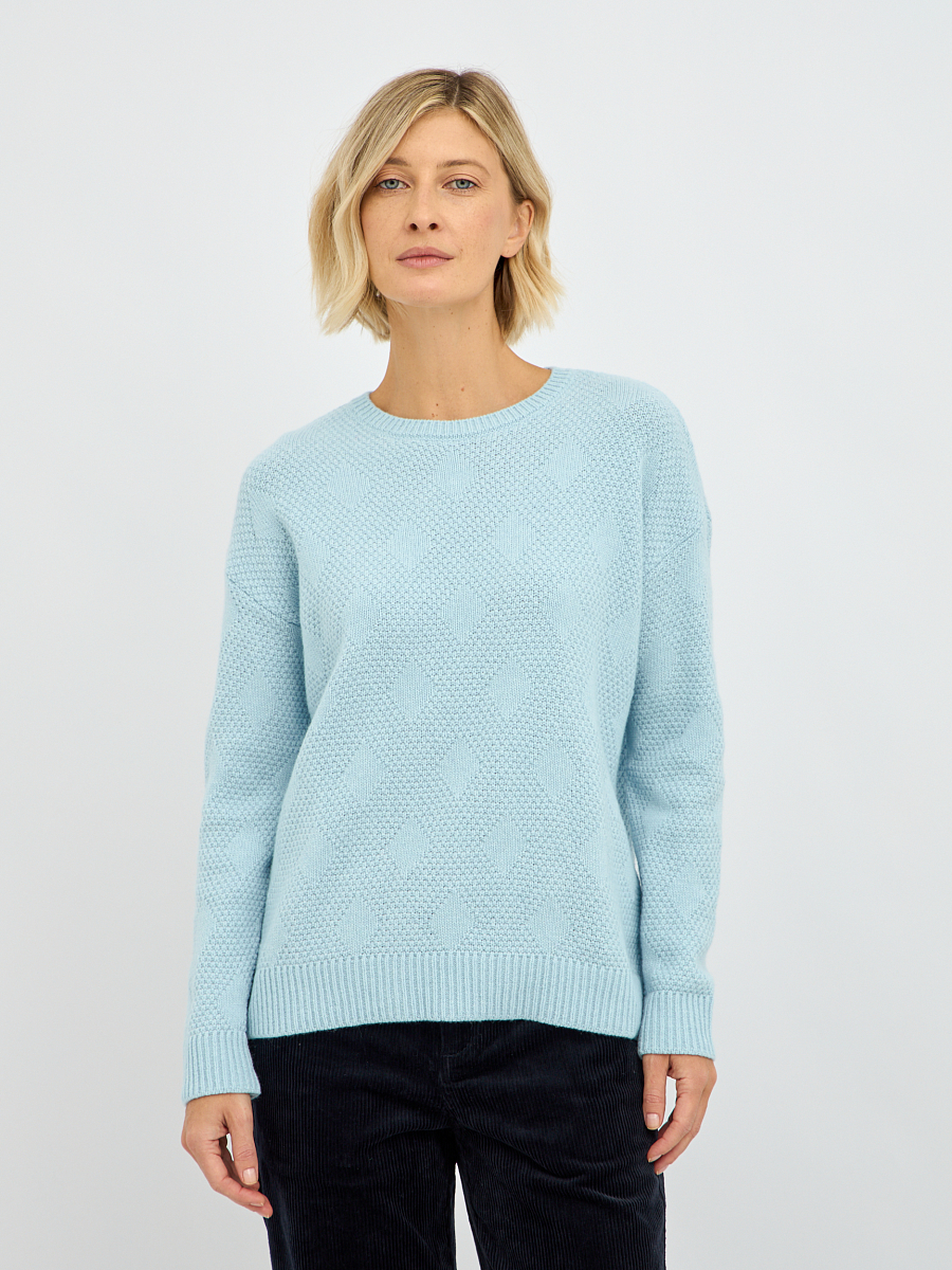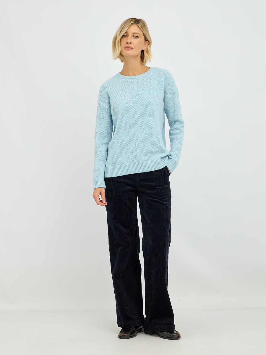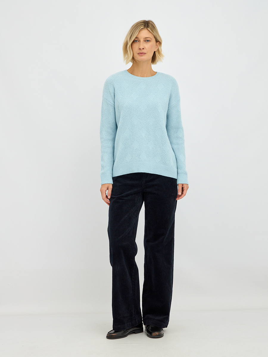 Легкий, воздушный небесно-голубой оттенок джемпера придает ему особую нежность и свежесть. Этот цвет легко сочетается с различными оттенками, от нейтральных до более ярких, позволяя создавать разнообразные образы.