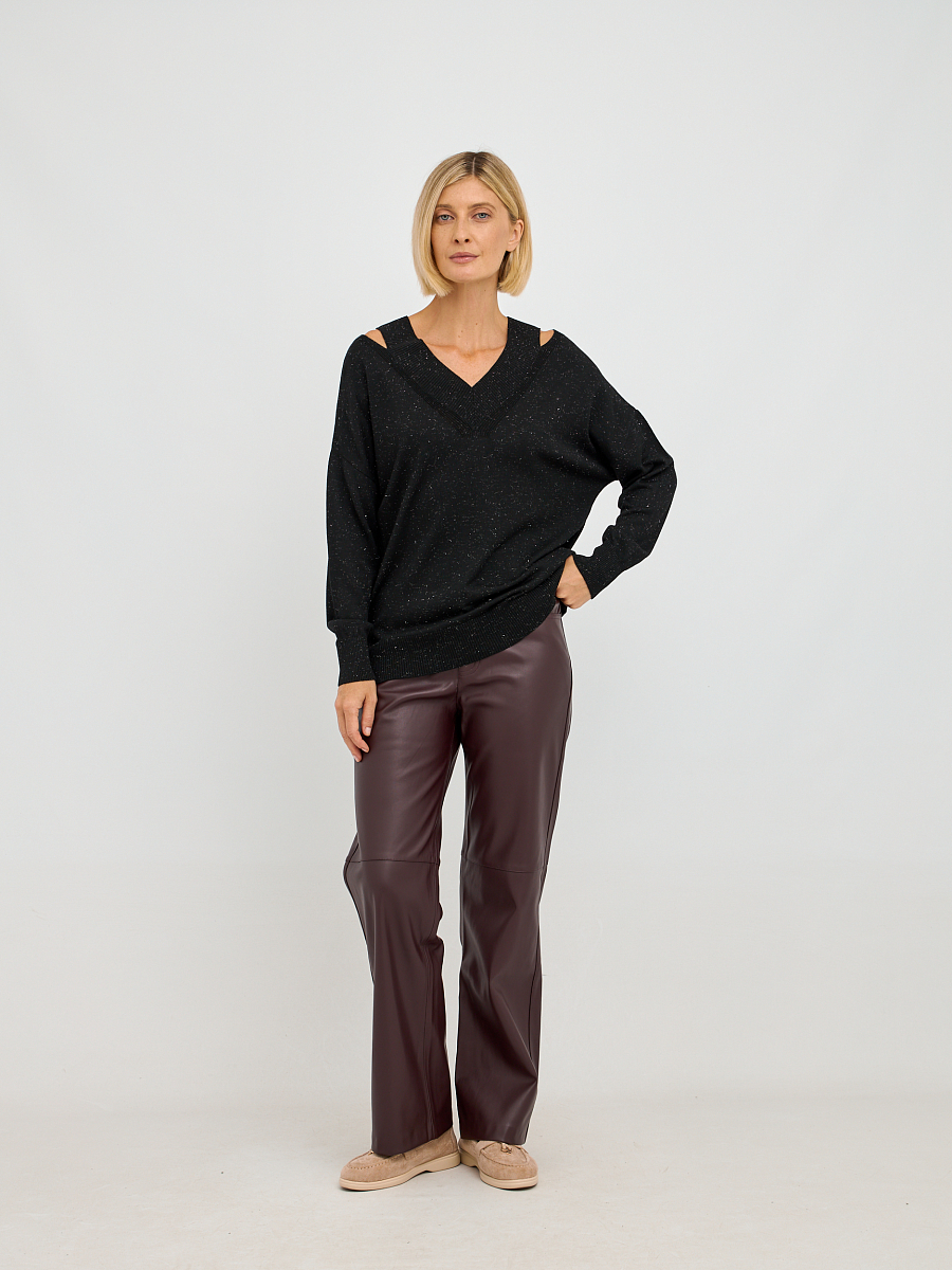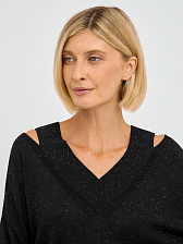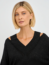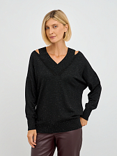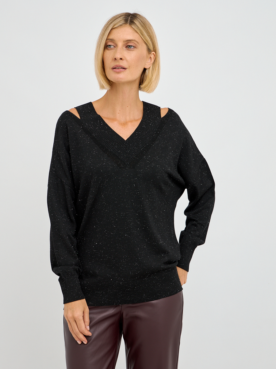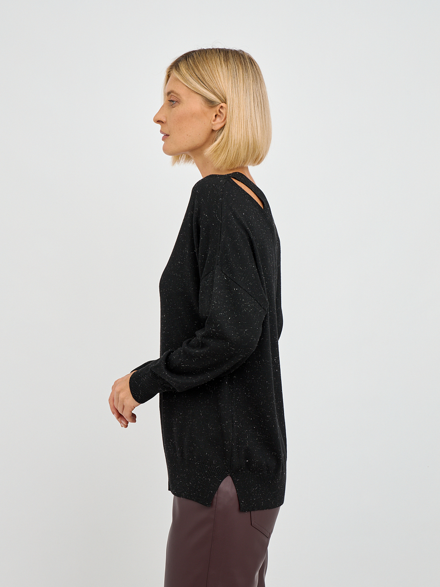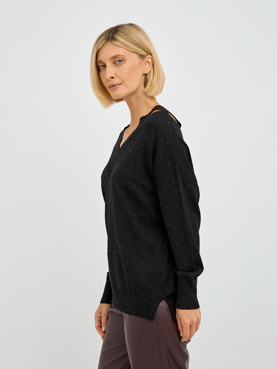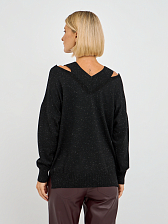 Джемпер выполнен в свободном крое, что обеспечивает максимальную свободу движений и комфорт в носке. Уникальные вырезы на плечах добавляют нотку дерзости и оригинальности, делая этот предмет одежды не только стильным, но и актуальным. Черный цвет делает его универсальным, позволяя сочетать с различными элементами вашего гардероба — от классических юбок до джинс.