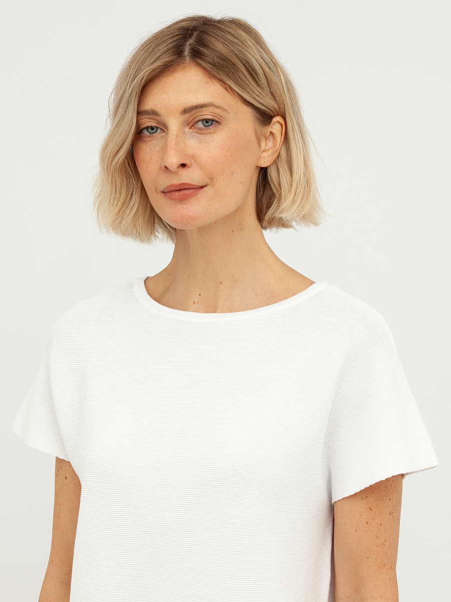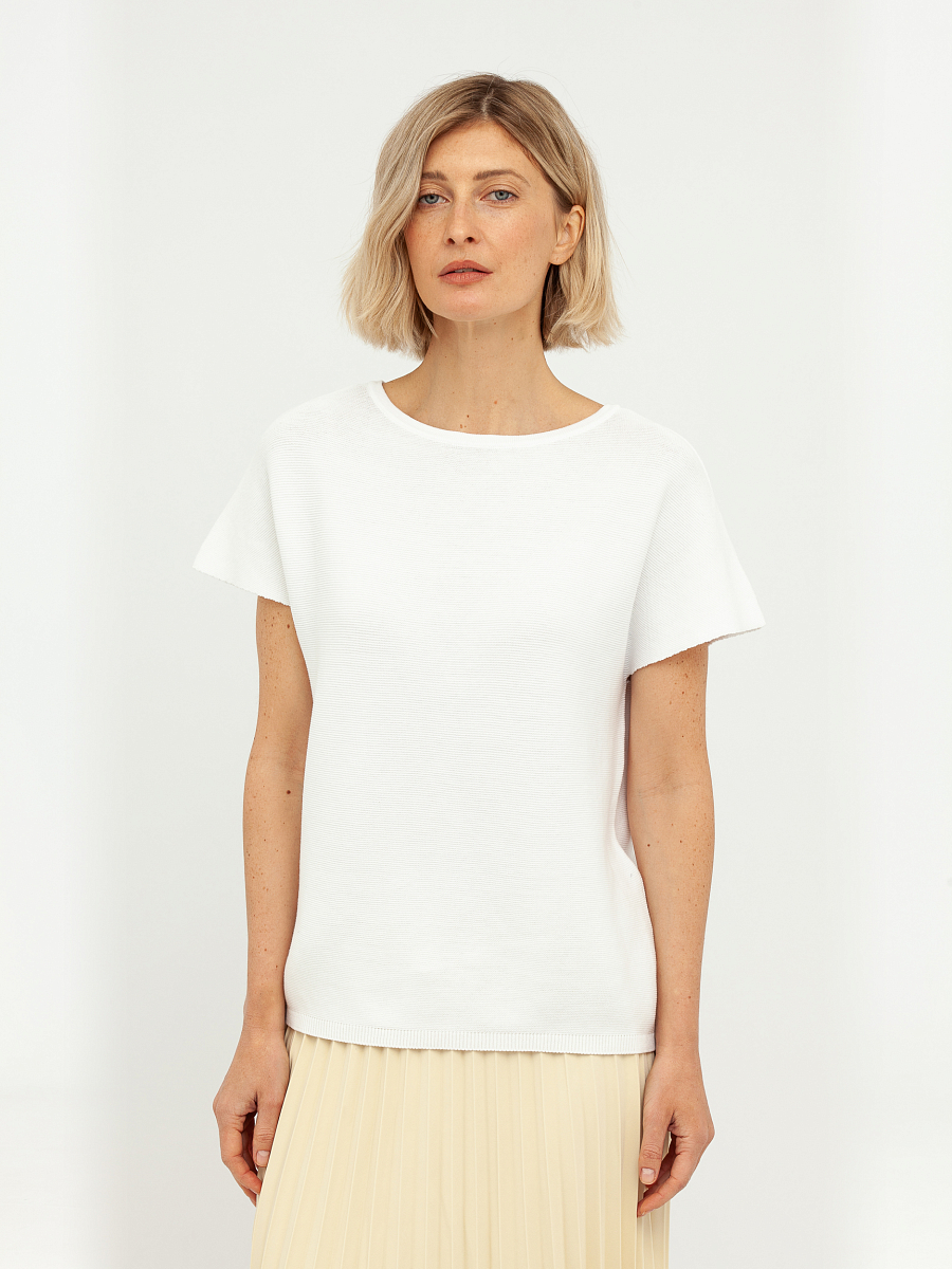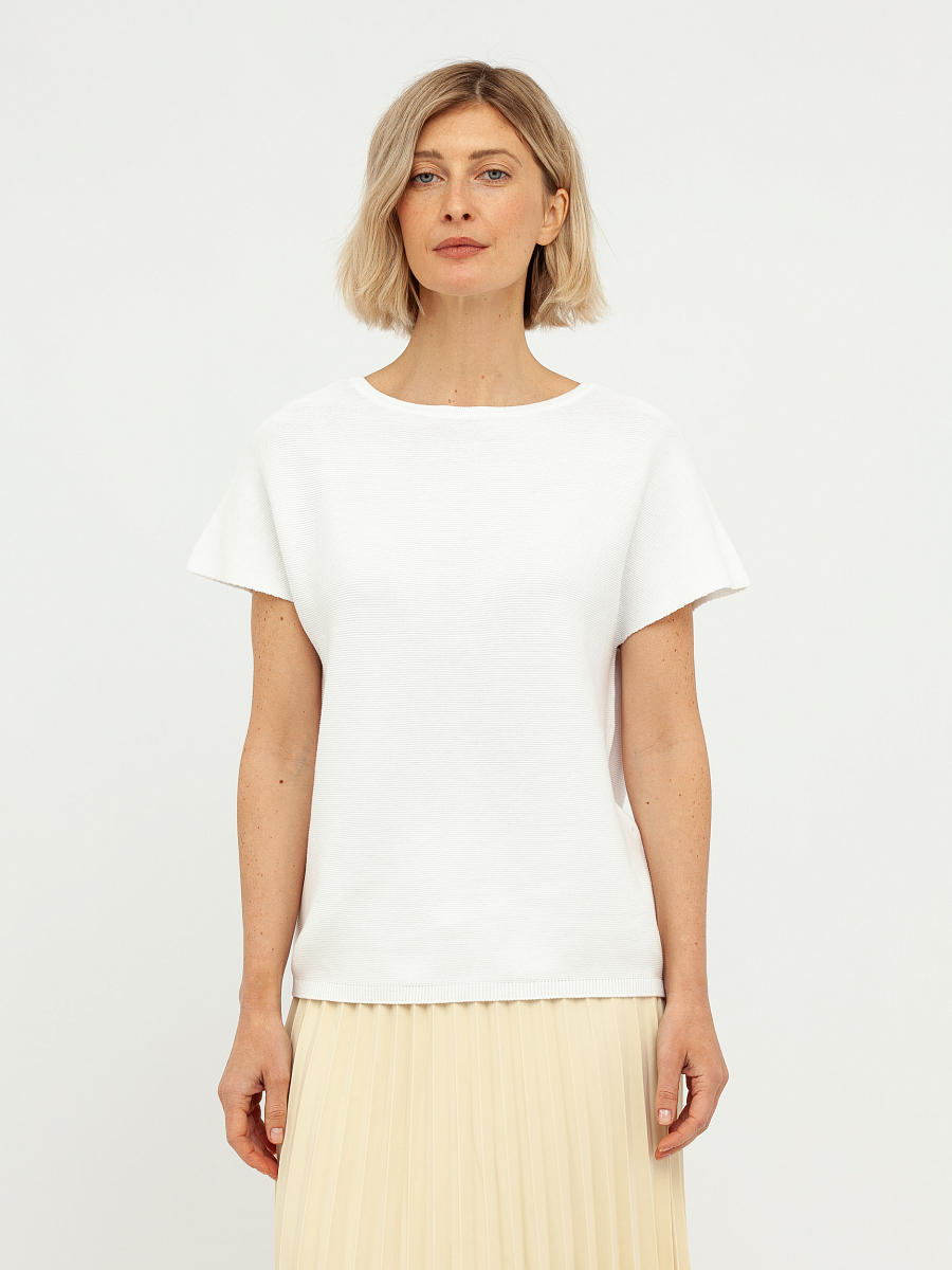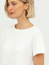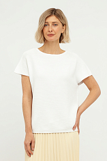 Классический круглый вырез горловины и свободный крой создают непринужденный и стильный силуэт, который подойдет для любой фигуры. Короткие рукава придают модели легкости и завершают образ. Текстура ткани, с деликатным рельефным узором, добавляет джемперу изысканности и оригинальности, делая его не просто базовой вещью, а выразительным элементом вашего гардероба.