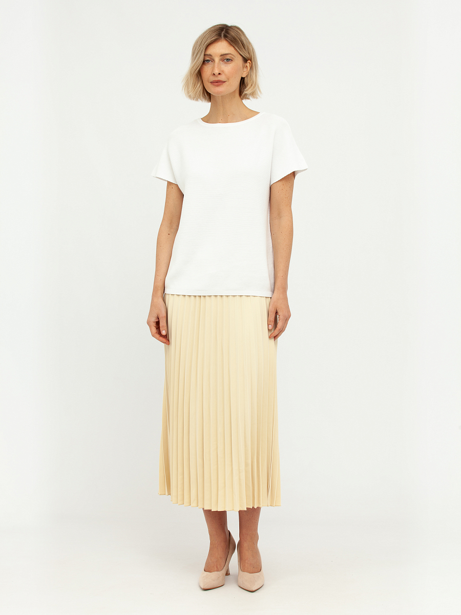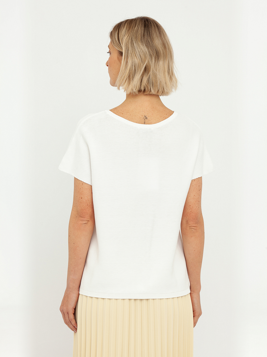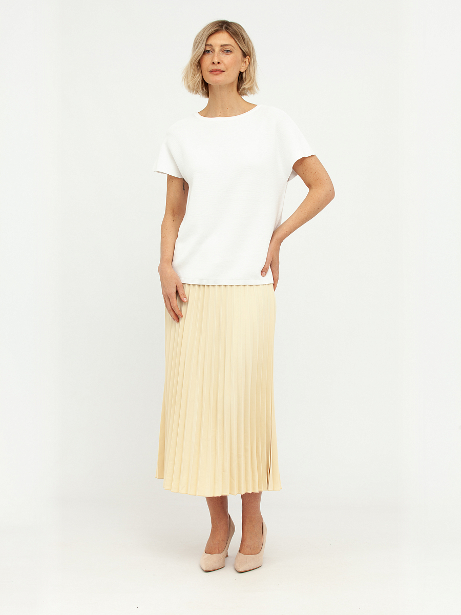 Классический круглый вырез горловины и свободный крой создают непринужденный и стильный силуэт, который подойдет для любой фигуры. Короткие рукава придают модели легкости и завершают образ. Текстура ткани, с деликатным рельефным узором, добавляет джемперу изысканности и оригинальности, делая его не просто базовой вещью, а выразительным элементом вашего гардероба.