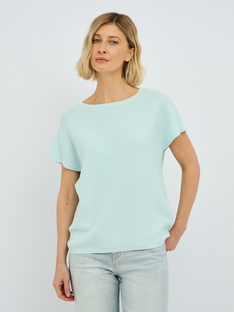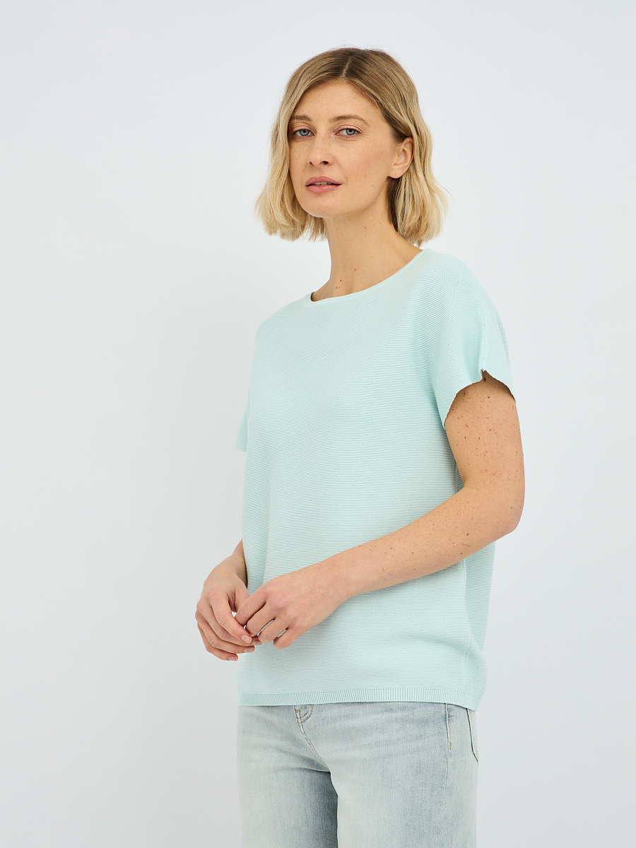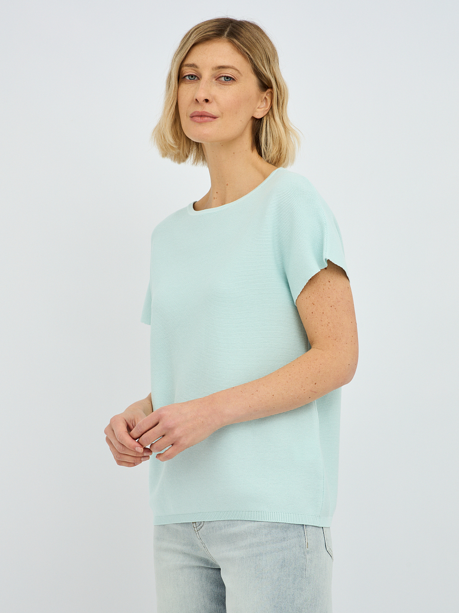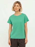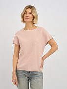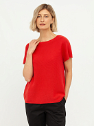 Классический круглый вырез горловины и свободный крой создают непринужденный и стильный силуэт, который подойдет для любой фигуры. Короткие рукава придают модели легкости и завершают образ. Текстура ткани, с деликатным рельефным узором, добавляет джемперу изысканности и оригинальности, делая его не просто базовой вещью, а выразительным элементом вашего гардероба.
